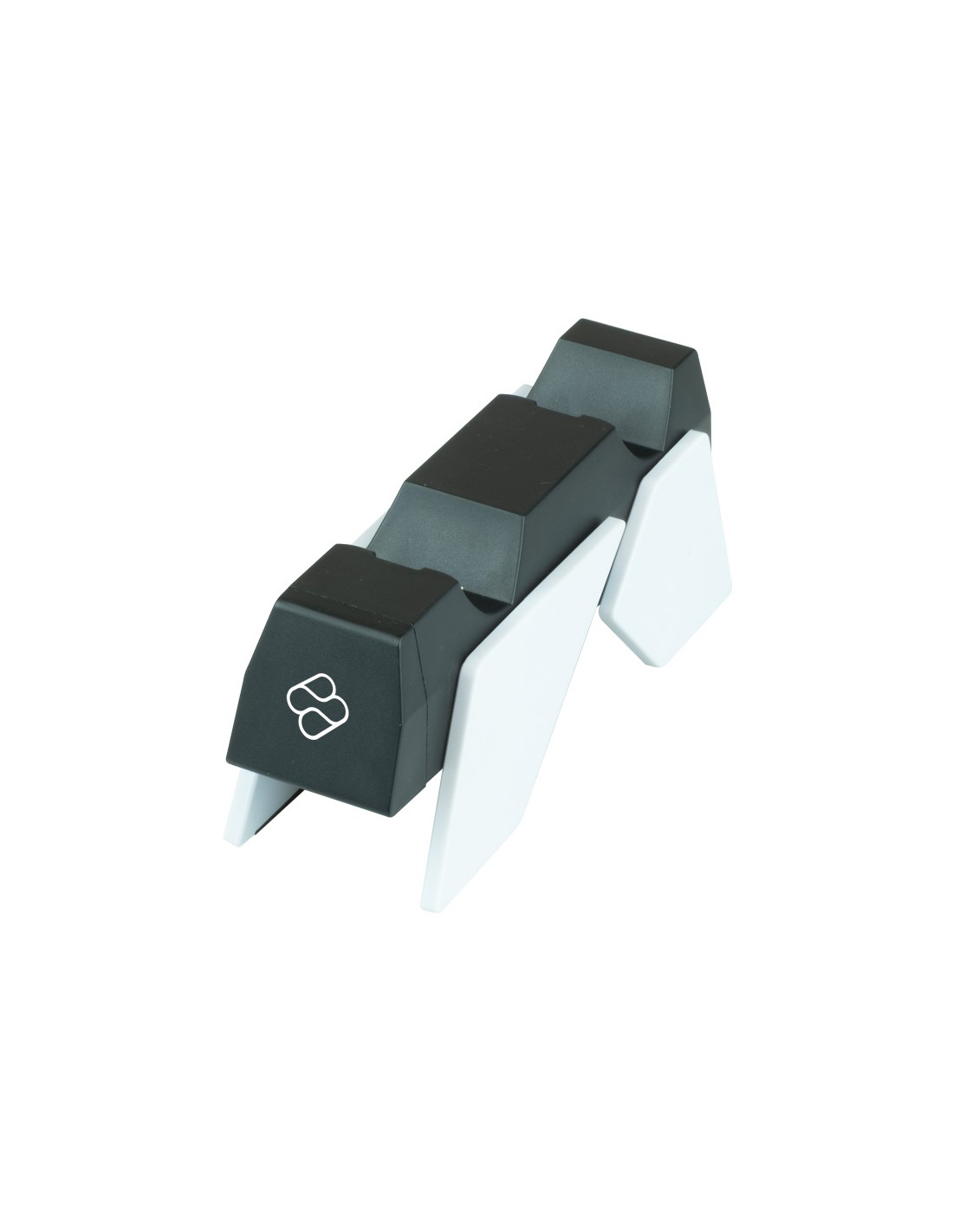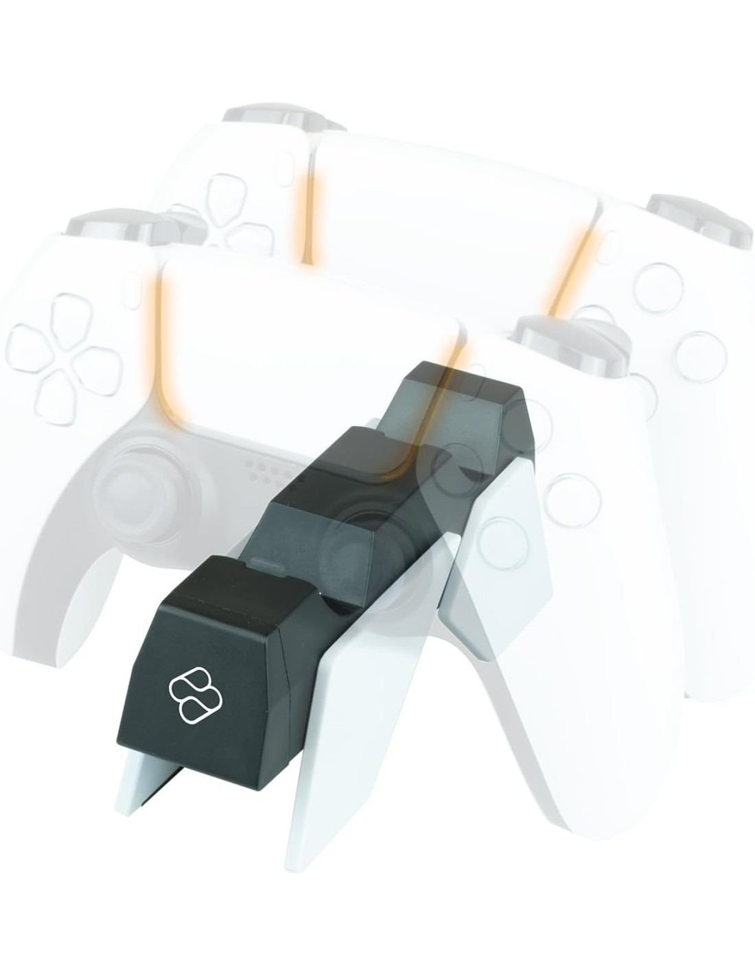 Gracias a su diseño compacto y elegante, esta estación combina perfectamente con la estética de la PlayStation 5, mientras mantiene tu espacio de juego ordenado. La carga se realiza mediante pines de contacto, evitando el desgaste de los puertos USB-C y asegurando una conexión estable.