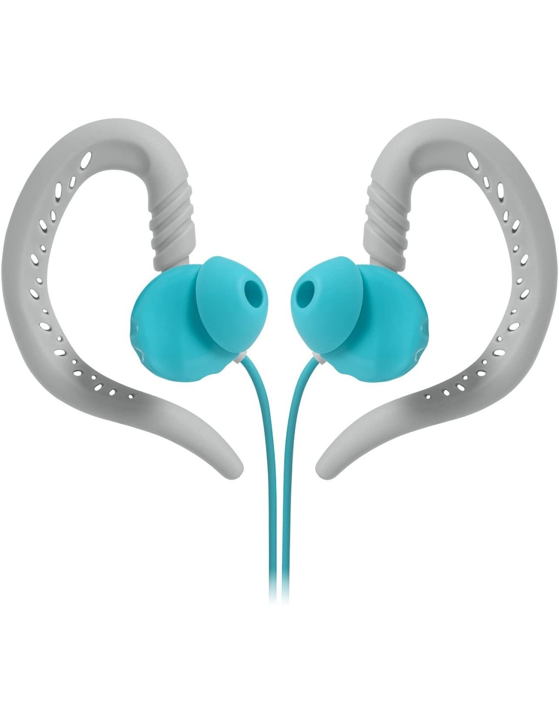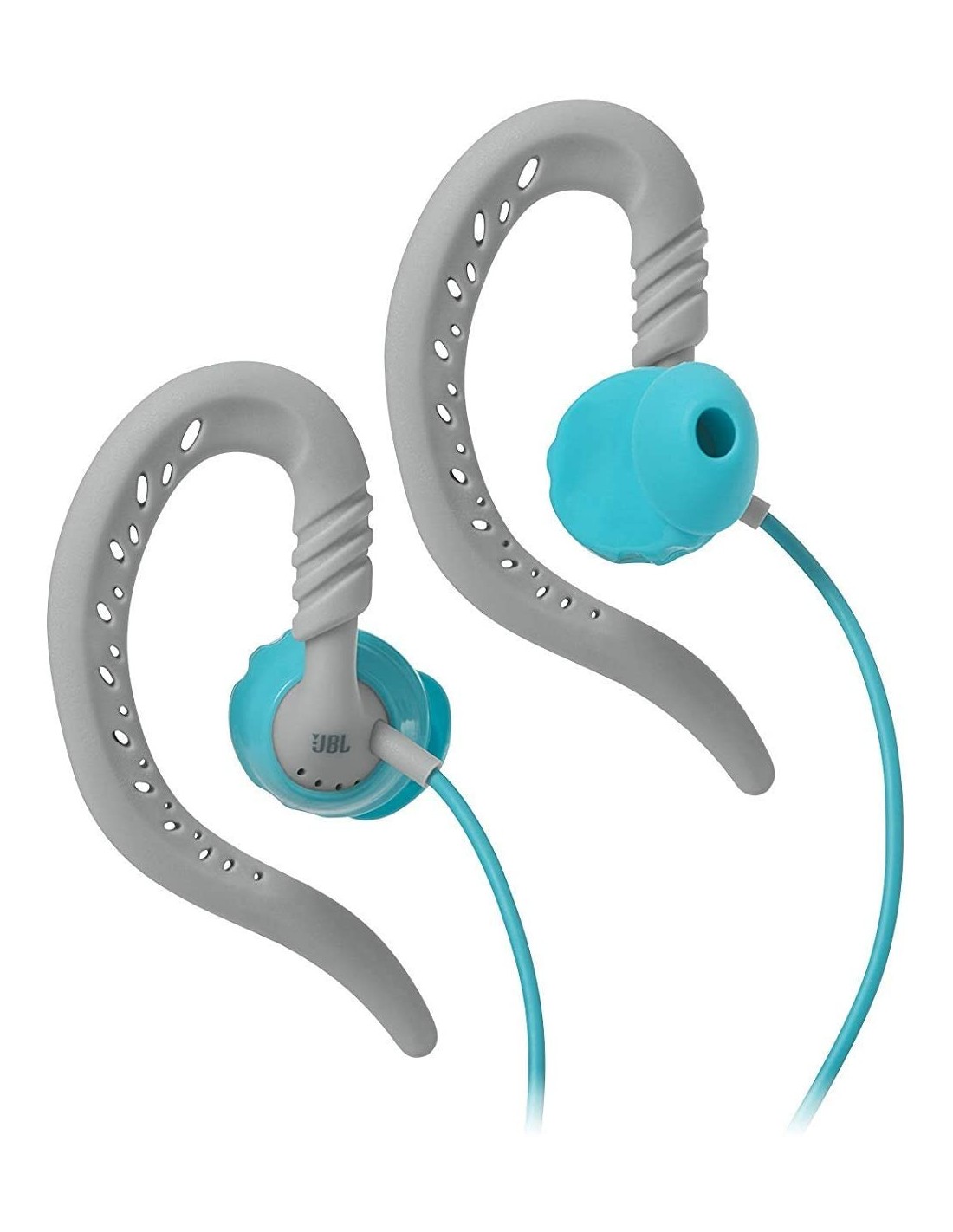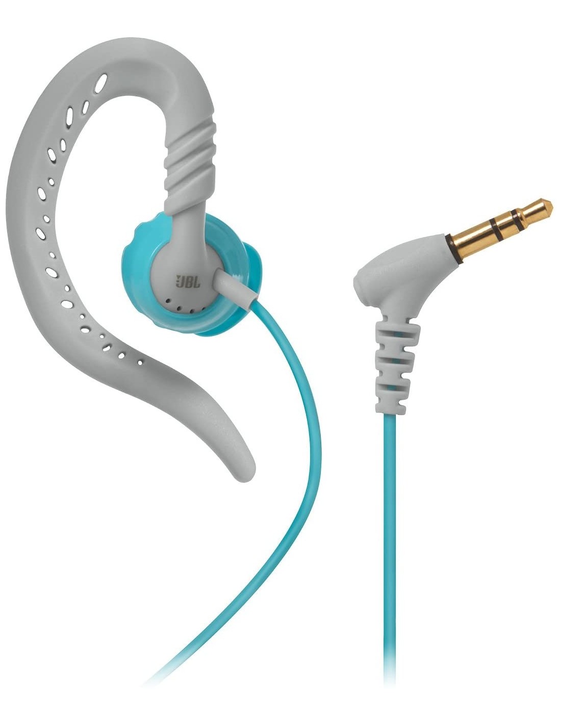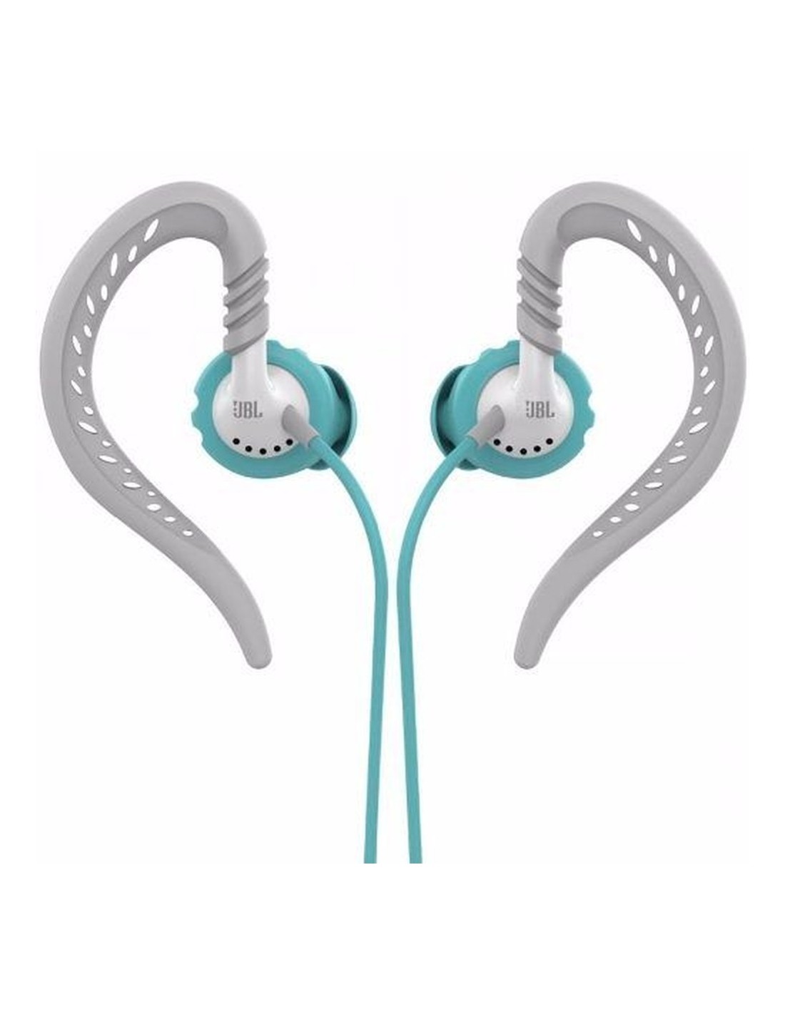 Los auriculares JBL Focus 100 en gris y turquesa son auriculares deportivos con gancho flexible para la oreja.