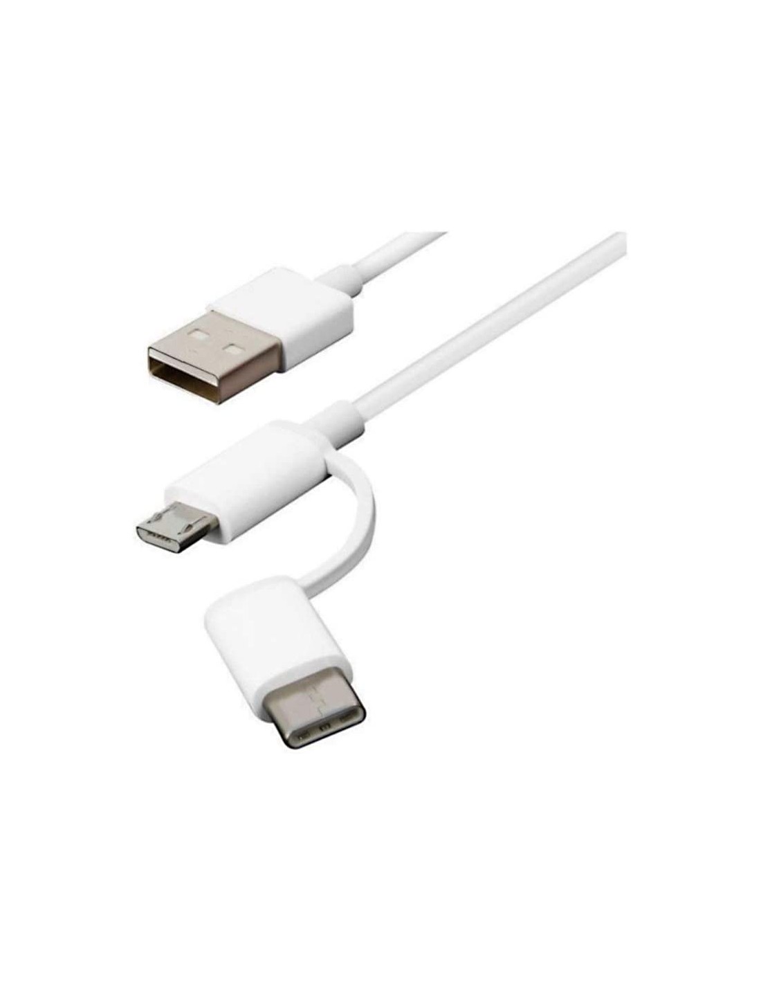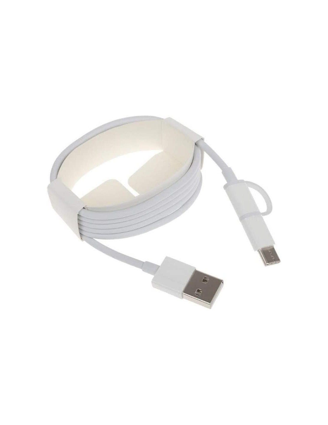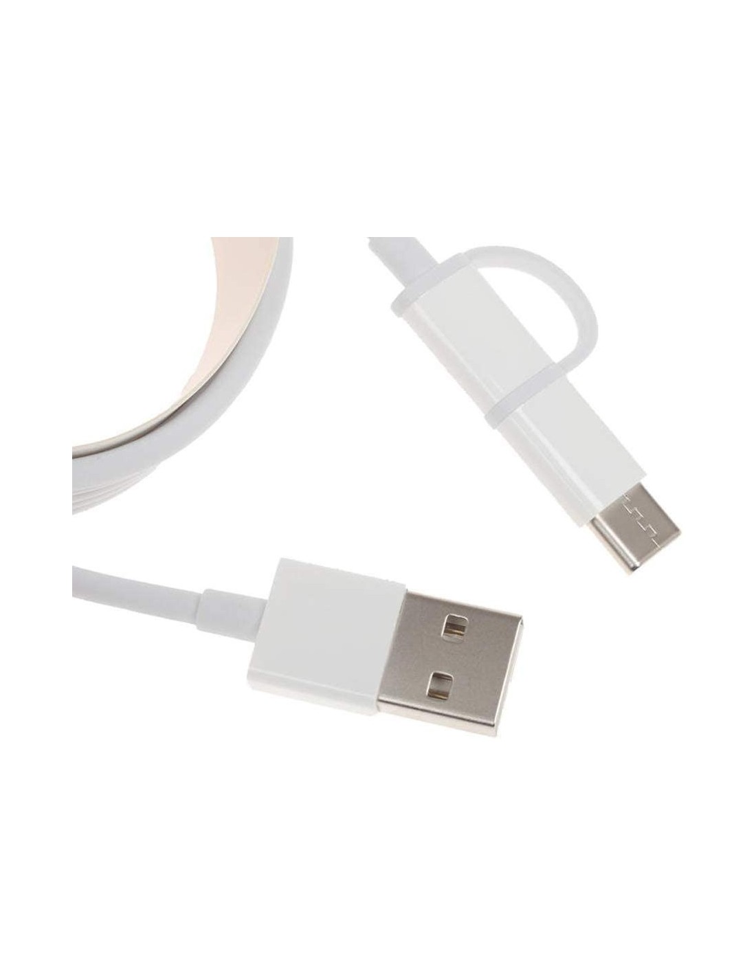 Cable de datos Xiaomi Mi 2 con dos conexiones, micro USB y USB tipo C. Así podrás realizar a la vez dos funciones con tu teléfono (por ejemplo cargar y sincronizar los datos).