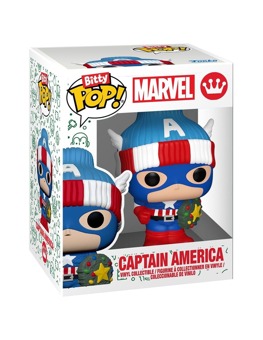 10 Figuras Bitty Pop! coleccionables: Las miniaturas de superhéroes y villanos de Marvel (como Spider-Man, Iron Man, Groot, etc.), muchas de ellas con un toque festivo.