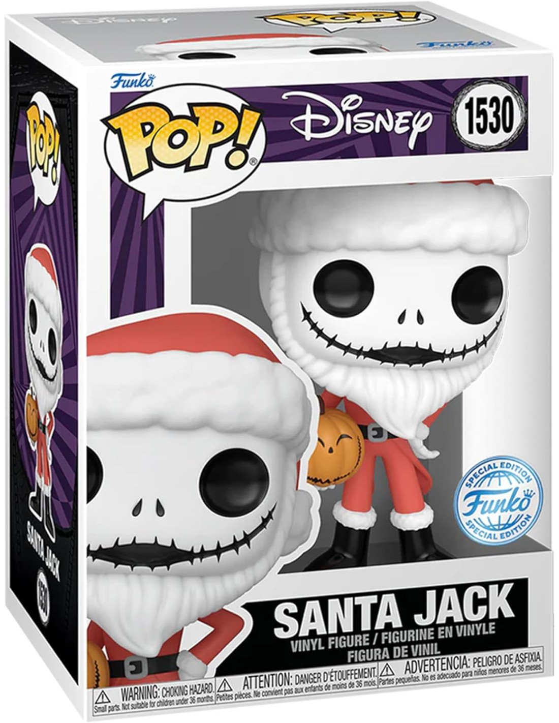 La figura captura a Jack Skellington en su adorable y mal ajustado traje de Santa, con su característico esqueleto visible a través del atuendo. Con el estilo inconfundible de los Funko Pop!, la figura de vinilo destaca por sus detalles, desde el gorro de Santa hasta su pajarita, todo en una pose que evoca su carisma y entusiasmo por la Navidad.