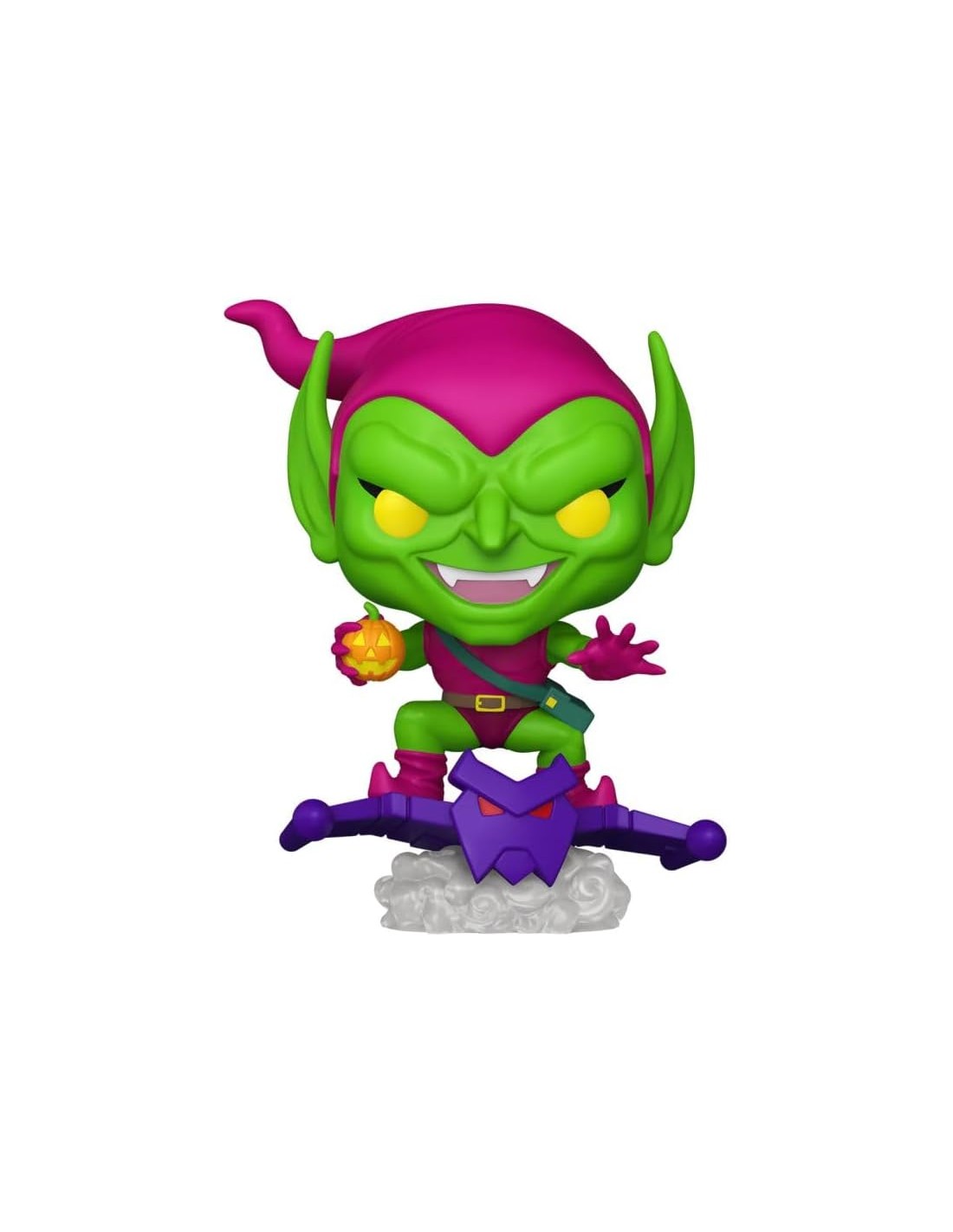 Con el estilo inconfundible de Funko Pop!, la figura de vinilo presenta al Duende Verde en su clásico traje púrpura y verde, con la capucha puntiaguda y la bolsa de calabazas explosivas en su mano. La figura está en una pose dinámica, como si estuviera a punto de lanzar un ataque o volar sobre su planeador.