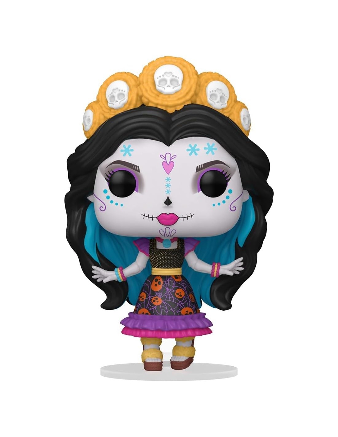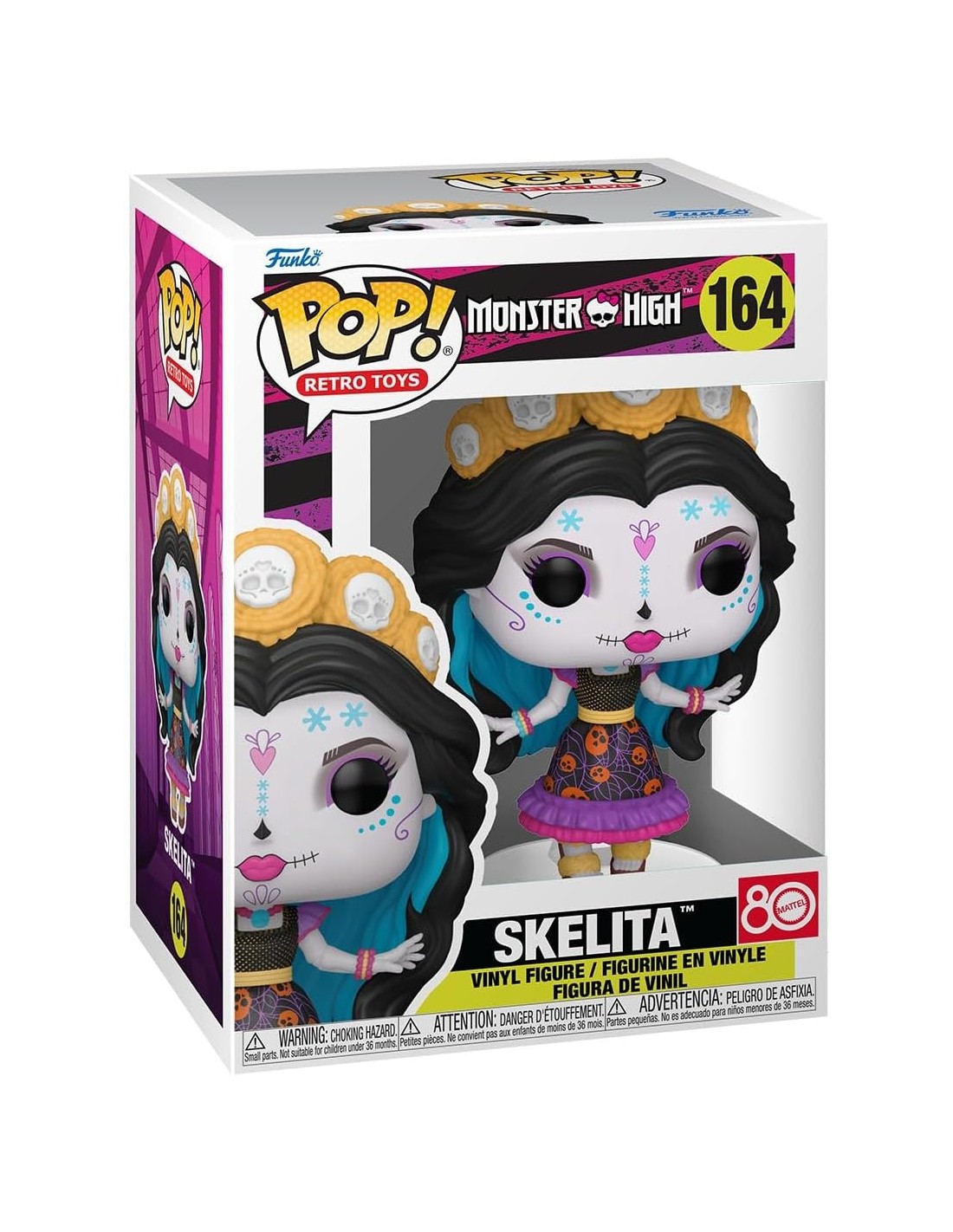 La Figura Funko Pop! Juguetes Retro Monster High Skelita Modelo 164 | 86572 representa a Skelita Calaveras, la estudiante esqueletito de Monster High, con su característica vestimenta colorida y su estilo único. La figura destaca por los detalles de su vestido, peinado y accesorios, reflejando la personalidad vivaz y rebelde de Skelita, así como la estética gótica y divertida que define la franquicia.