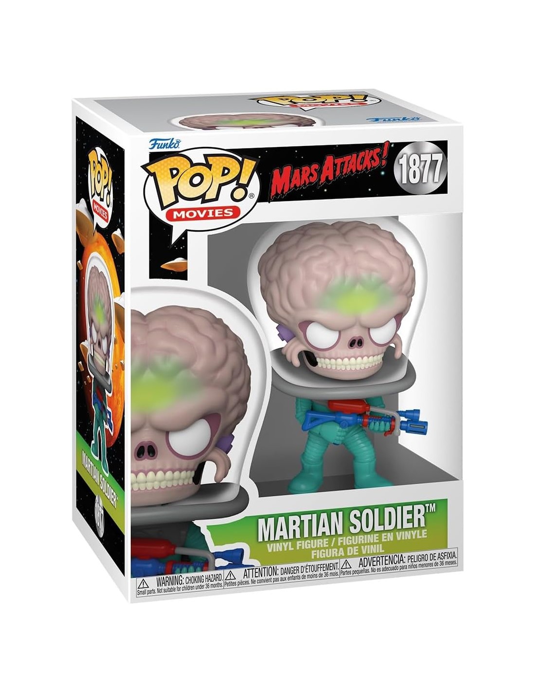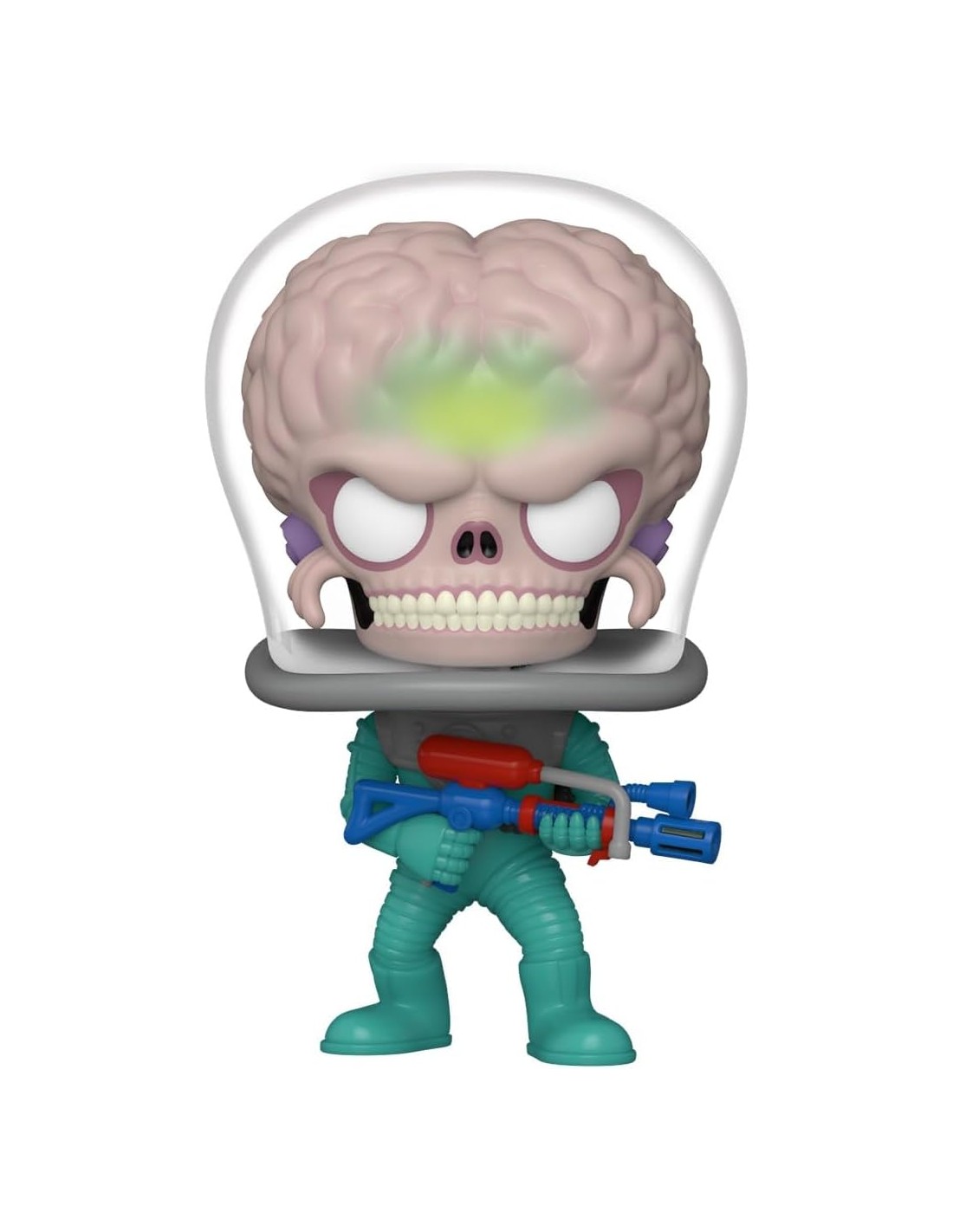 La Figura Funko Pop! Películas Mars Attack Soldado Modelo 1877 | 83566 captura a los temibles y excéntricos marcianos del universo Mars Attacks! en su forma más reconocible. Con su cráneo expuesto bajo una cúpula transparente, su expresión burlona y su traje espacial verde con detalles metálicos, esta figura Funko Pop! rinde homenaje al estilo visual único y al humor negro de la película dirigida por Tim Burton.
