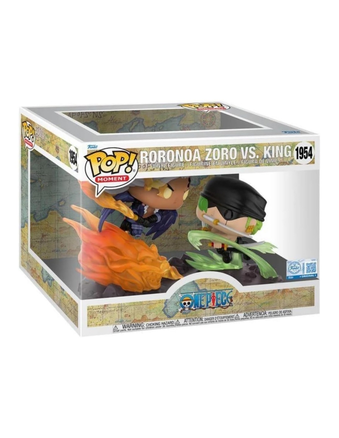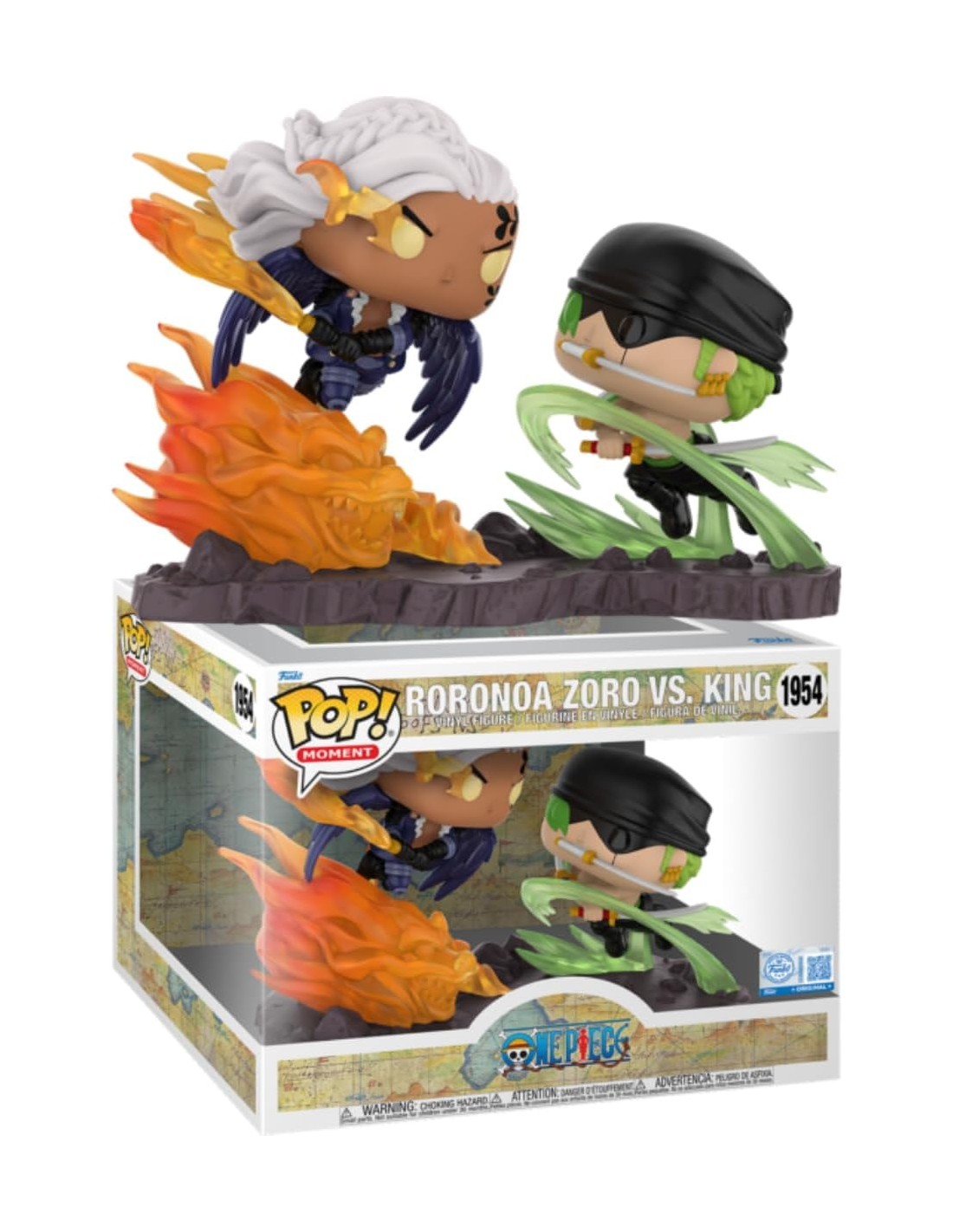 La Figura Funko Pop! Animación One Piece Roronoa Zoro vs King Modelo 1954 | 84487 Edición Especial captura el momento icónico del enfrentamiento entre Zoro y King, mostrando al espadachín con sus tres espadas en acción y una pose cargada de dinamismo y fuerza. Esta figura mantiene el estilo característico de Funko Pop! mientras resalta los detalles del personaje y su rival, logrando transmitir la intensidad y emoción de la escena.