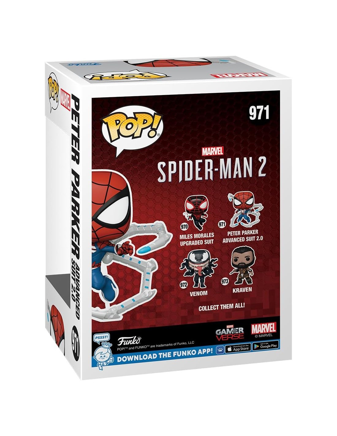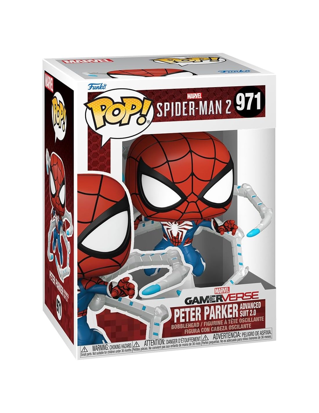 La Figura Funko Pop! Marvel Spider-Man 2 Peter Parker con Traje Avanzado 2.0 Modelo 971 | 76109 captura a Spider-Man en su última versión cinematográfica, con el traje Avanzado 2.0 lleno de detalles tecnológicos y estilizados. La figura destaca por su diseño dinámico y la precisión en los colores y texturas del traje, reflejando la evolución del héroe en el universo Marvel.