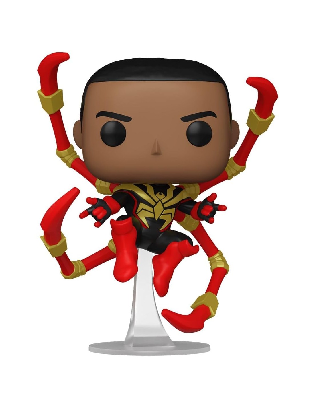 La figura de vinilo rinde homenaje a Miles Morales en su versión con la armadura de Iron Spider, que se distingue por su diseño negro y rojo característico, pero con un toque de alta tecnología. La variante Chase a menudo incluye un detalle exclusivo, como un color diferente en el traje, un cambio de pose o, en este caso, un detalle en la armadura (como el brillo de los brazos arácnidos) que la diferencia de la versión regular y aumenta su valor.