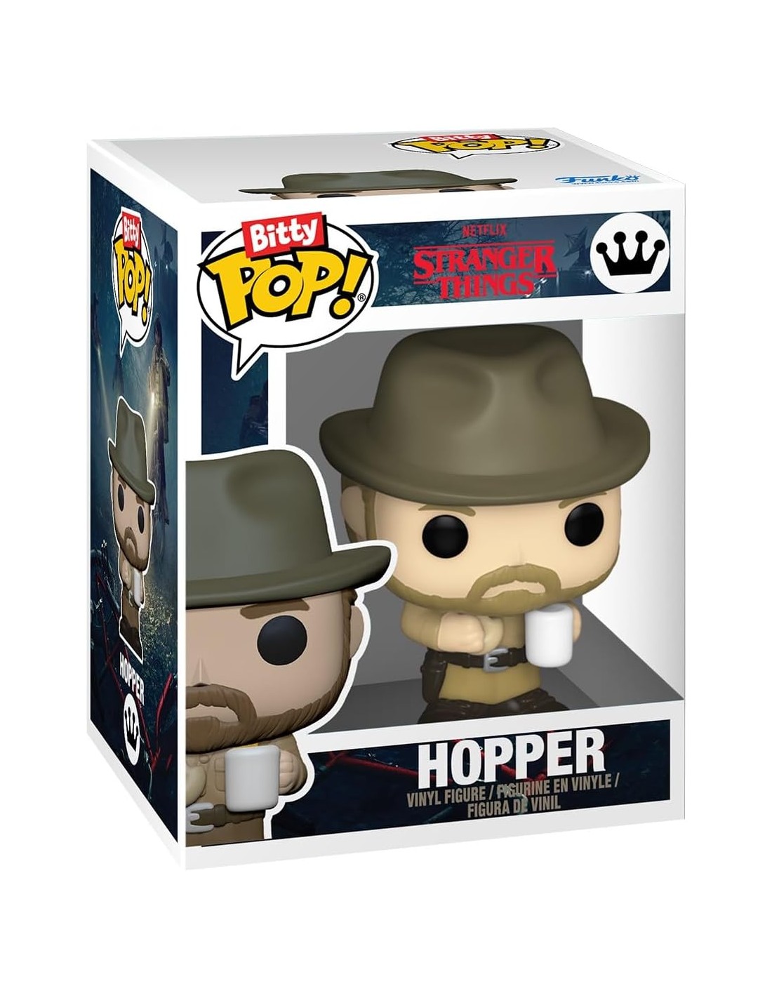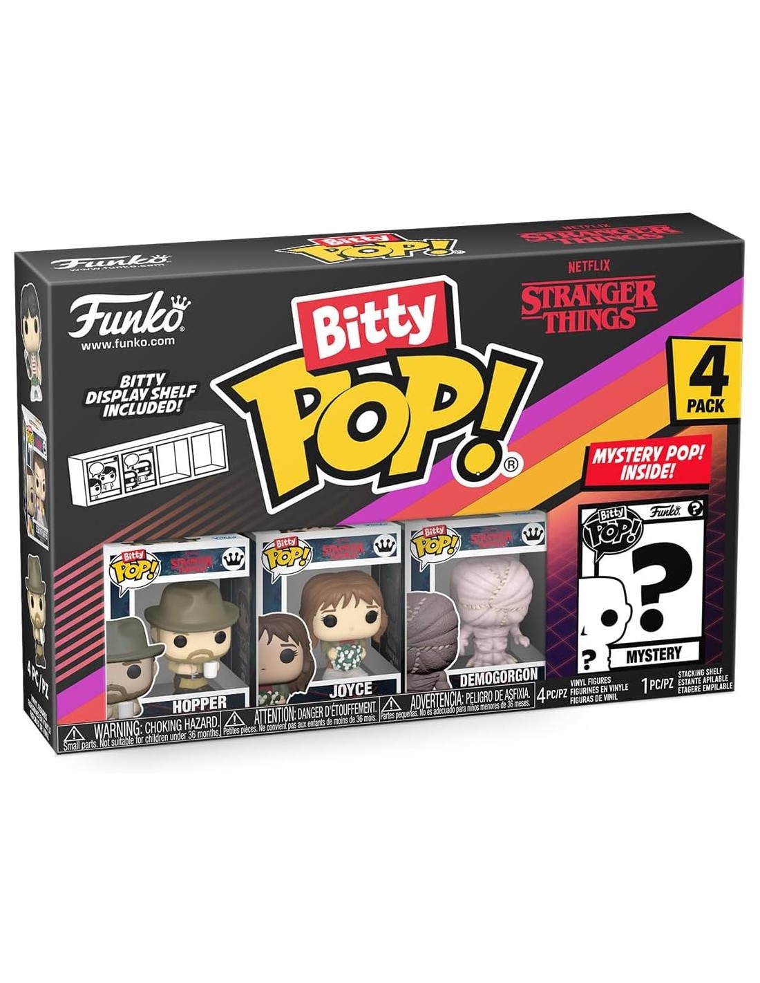 Desde el fenómeno de Netflix, Stranger Things, llega el Pack de 4 Funko Bitty Pop! Modelo Hopper | 83664. Los Bitty Pop! son figuras coleccionables aún más pequeñas que los Funko Pop! estándar, presentadas en cajas acrílicas que se pueden apilar y exhibir. Incluye una figura de Hopper, una de Joyce y una del Demogorgon.