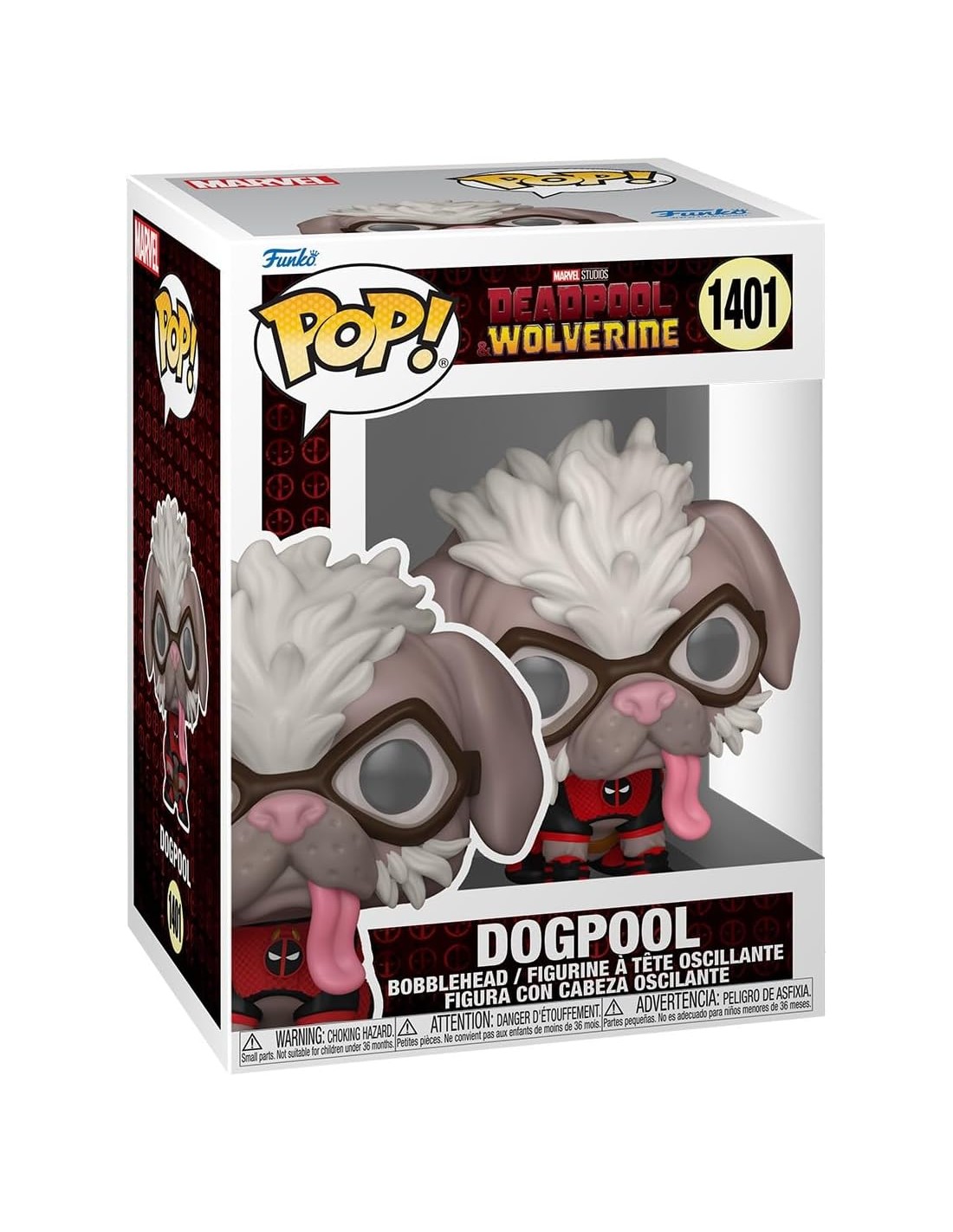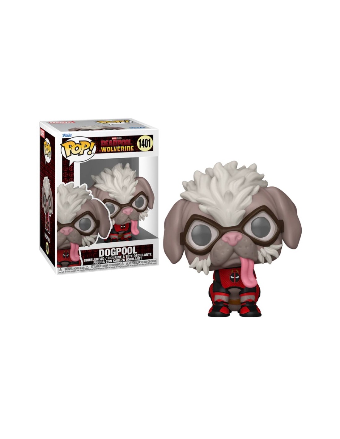 Desde la anticipada película de Marvel Studios, Deadpool & Wolverine, llega la Figura Funko Pop! de Dogpool (Perro Piscina), Modelo 1401 | 79769. Este canino es la variante canina del Mercenario Bocazas y miembro del Cuerpo Deadpool que se une a las aventuras multiversales.