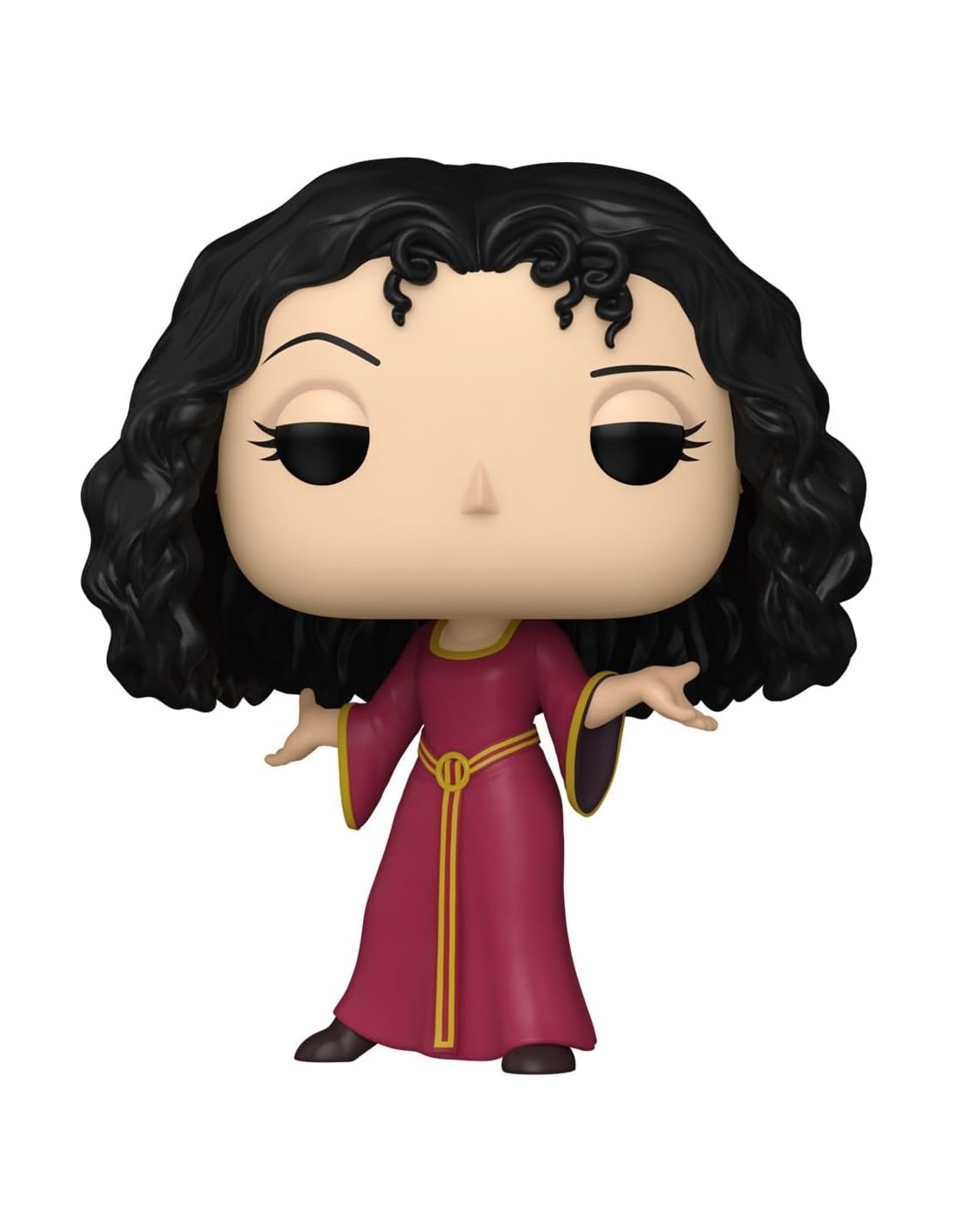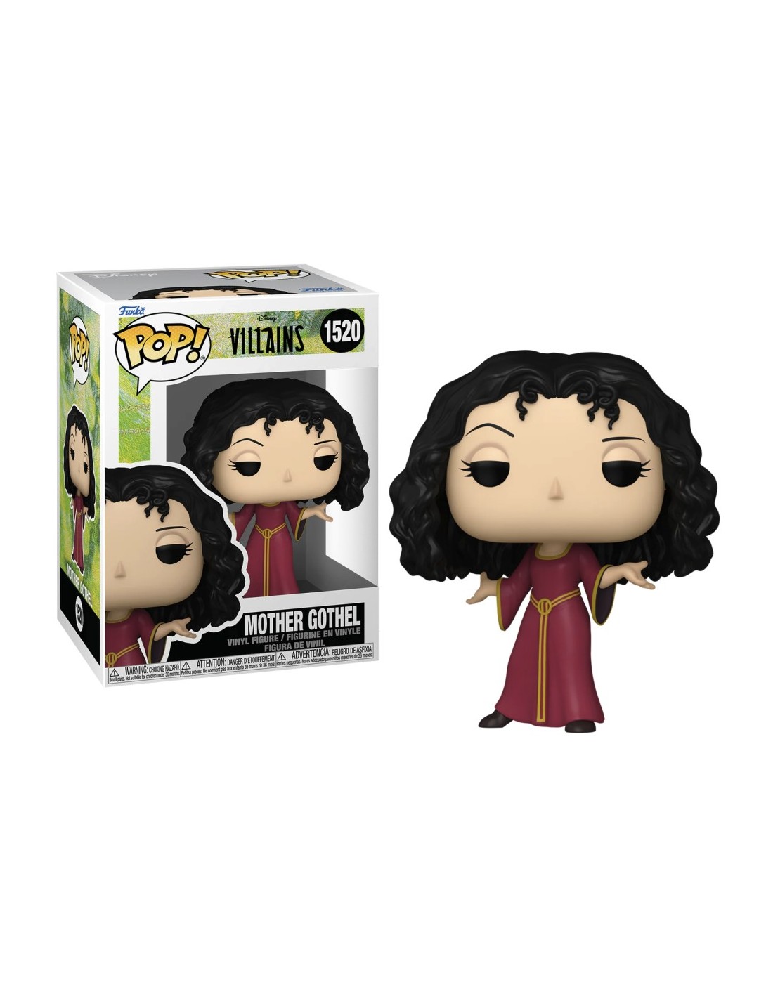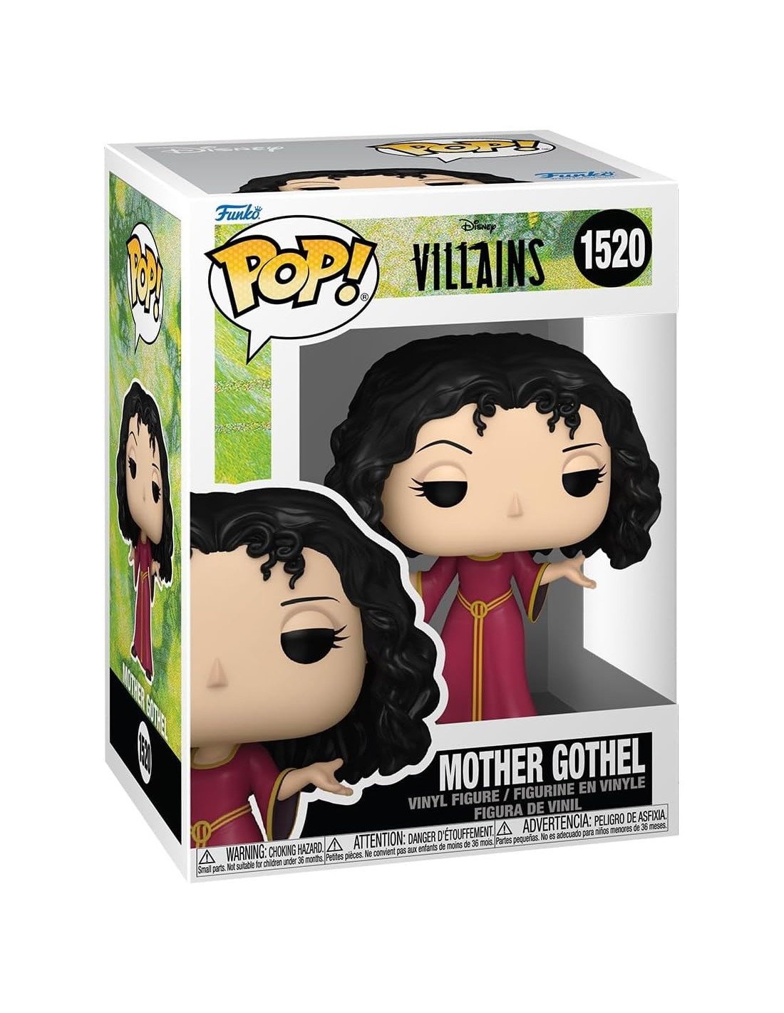 Con el estilo inconfundible de Funko Pop!, la figura captura a Gothel luciendo su característico y dramático vestido de época, a menudo con su capucha o capa. La figura la presenta en una pose de confianza o con una expresión astuta, reflejando su capacidad para manipular a Rapunzel bajo el disfraz de una madre protectora.