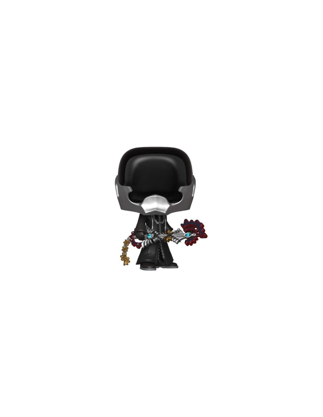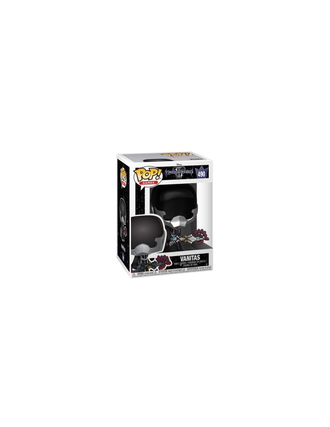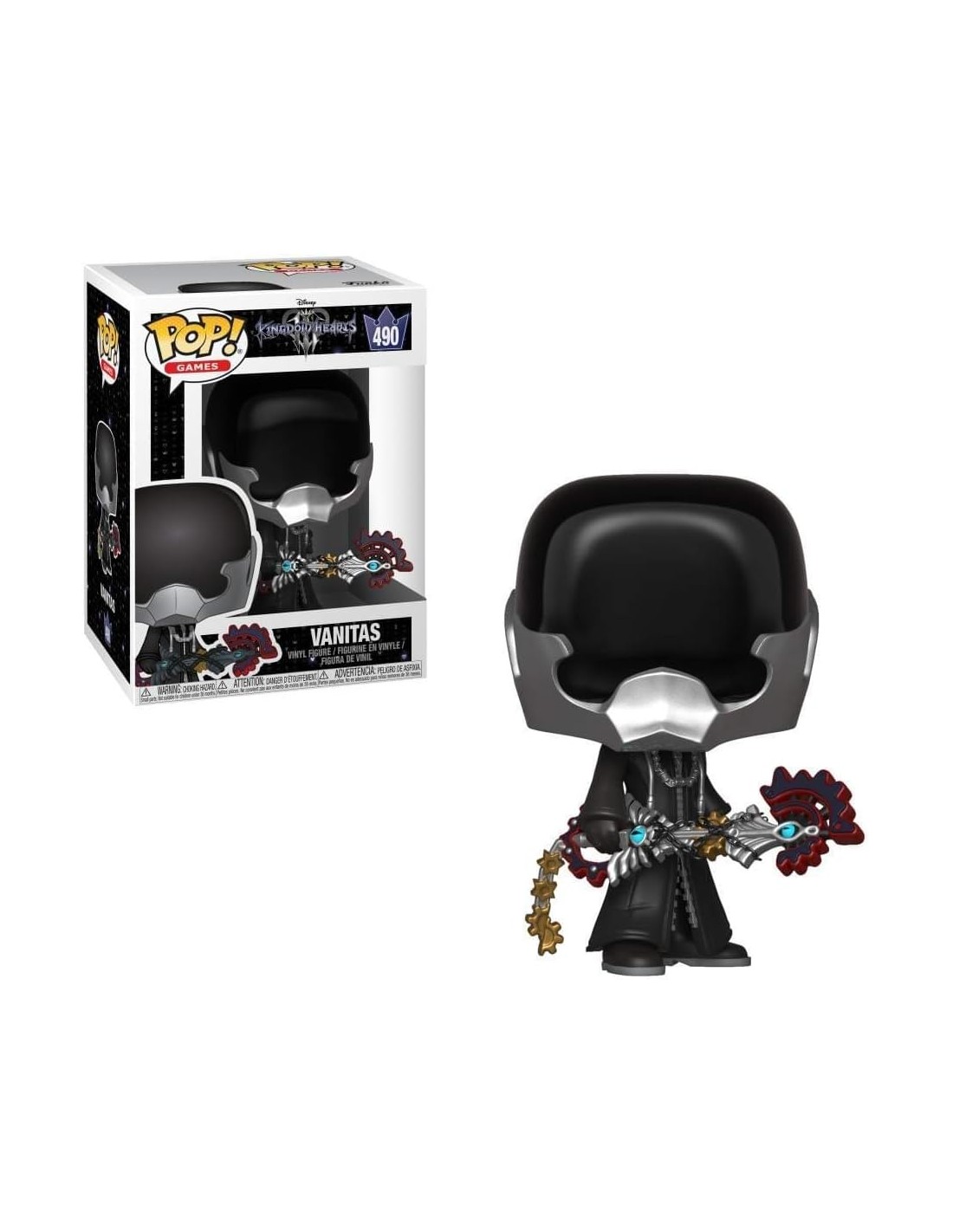 Esta figura de vinilo captura la esencia amenazante de Vanitas, con su distintivo traje blindado en color negro, y la máscara que oculta su rostro, la cual recuerda a los Unversed. La figura Funko Pop! lo muestra en una pose dinámica, empuñando su arma, la Keyblade "Perdición del Vacío" (Void Gear). Es una pieza fundamental para los coleccionistas de Kingdom Hearts que buscan completar su colección de portadores de Keyblade.