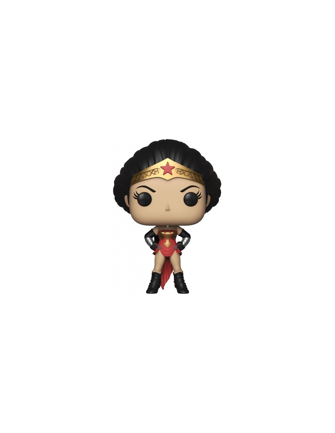 Con el estilo inconfundible de Funko Pop!, la figura captura a Wonder Woman con su emblemático traje rojo, azul y dorado, a menudo con su tiara, los brazaletes de sumisión y el Lazo de la Verdad, o quizás sosteniendo una espada o escudo. La pose es de fuerza y determinación, reflejando su naturaleza como una de las heroínas más fuertes y justas del Universo DC.
