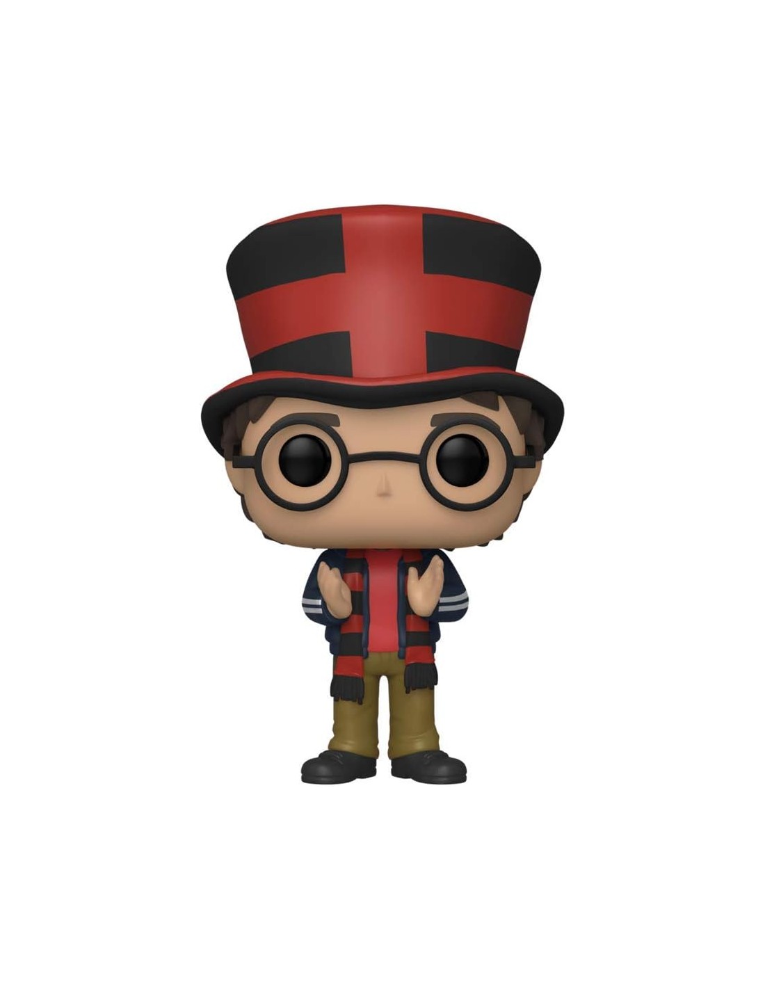 Esta figura estilizada muestra al joven mago en una pose de apoyo y expectación, ataviado con su uniforme escolar pero con accesorios distintivos de fan. Lleva un gorro a cuadros negro y rojo y una bufanda de Gryffindor a rayas.