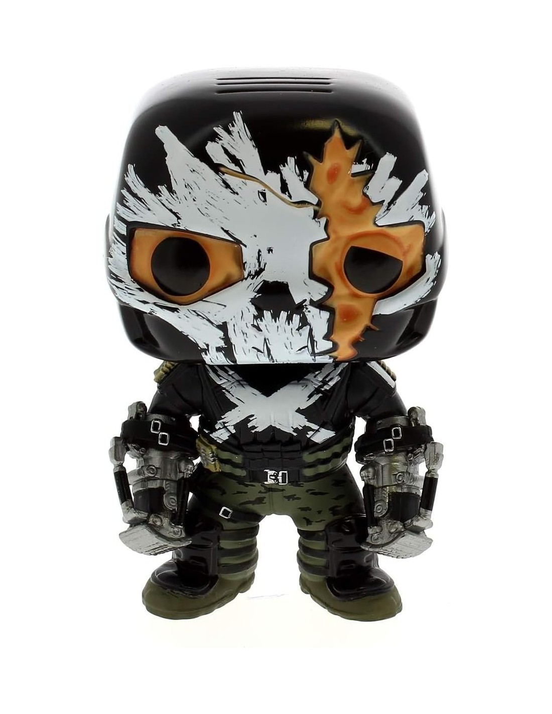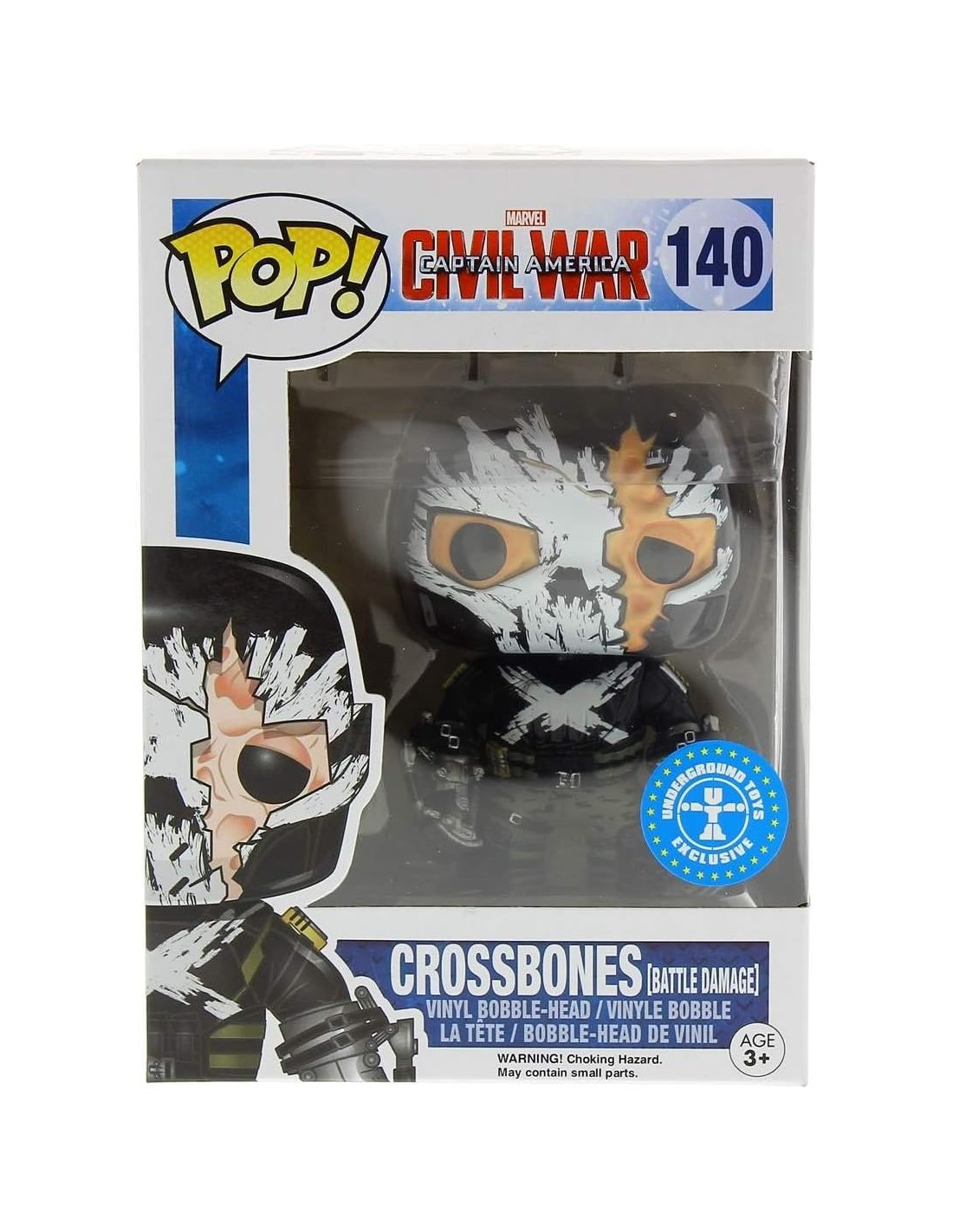 Con el estilo inconfundible de Funko Pop!, la figura captura a Crossbones con su intimidante traje militar y su máscara de calavera negra. La característica distintiva de esta versión es el diseño "Dañado en la Batalla": se puede ver una rajadura de color naranja en el lado derecho de la máscara, mostrando que ha recibido un fuerte impacto en su enfrentamiento contra el Capitán América. Además, luce su atuendo de camuflaje en los pantalones y sus guanteletes blindados que utiliza en el combate.