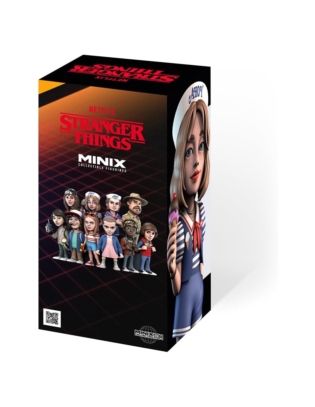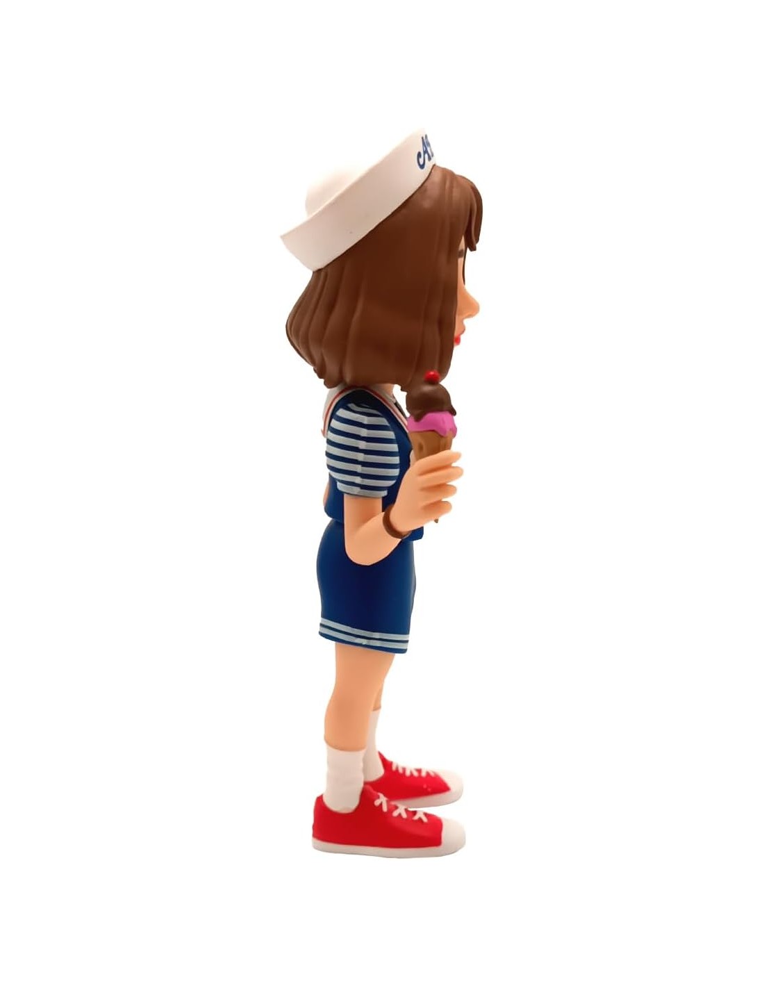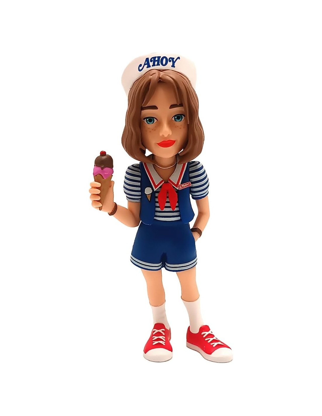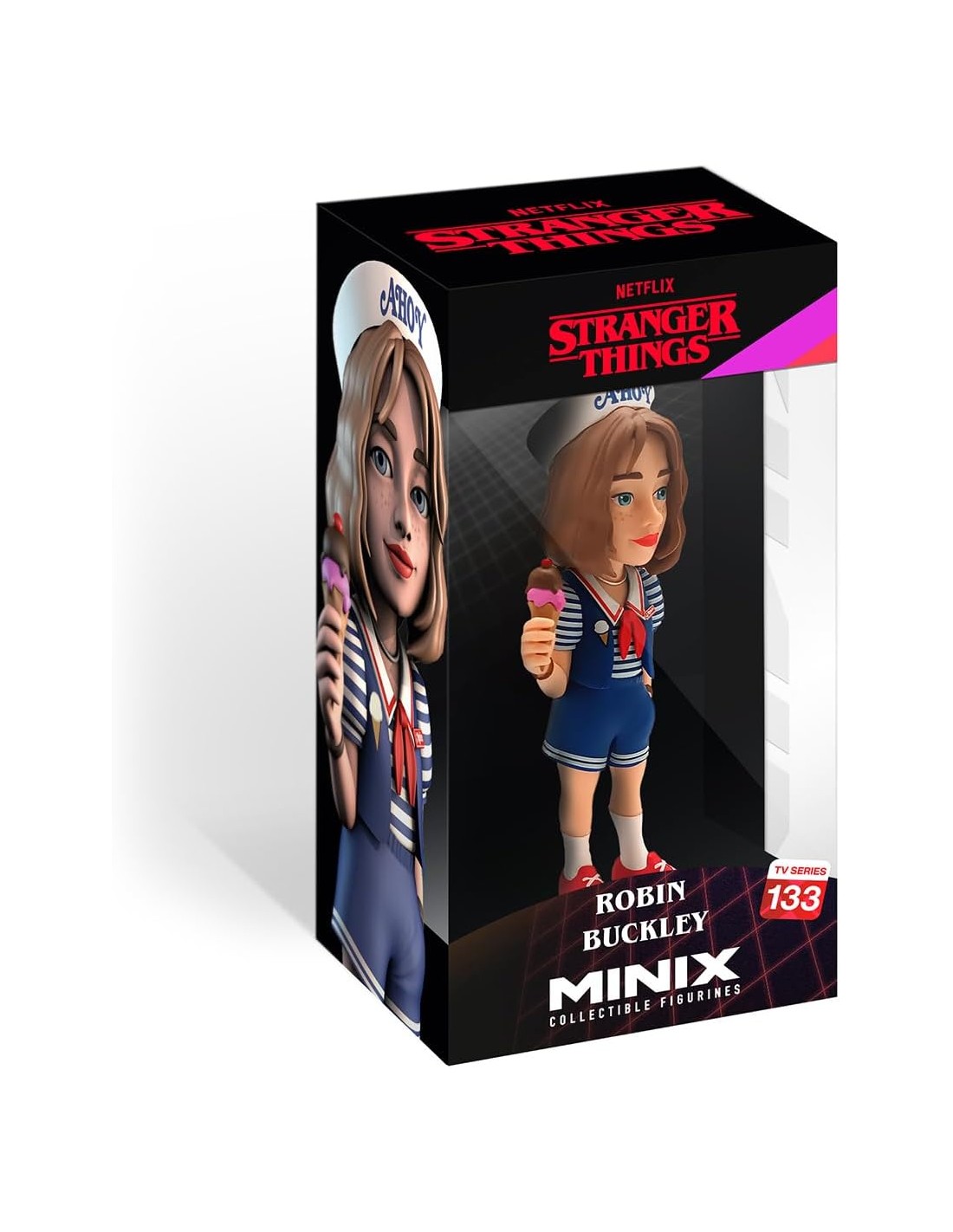 La figura Minix Stranger Things Robin Helado Modelo 133 representa a Robin Buckley tal y como aparece en la tercera temporada de Stranger Things, luciendo su icónico uniforme de Scoops Ahoy. Su diseño estilizado refleja a la perfección su personalidad ingeniosa, sarcástica y valiente, convirtiéndola en una pieza imprescindible para cualquier fan de la serie.