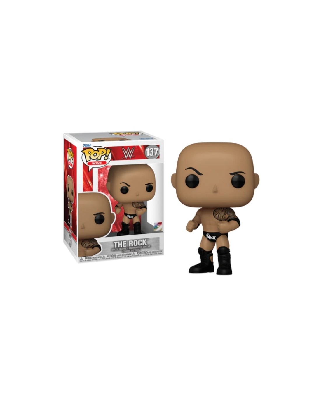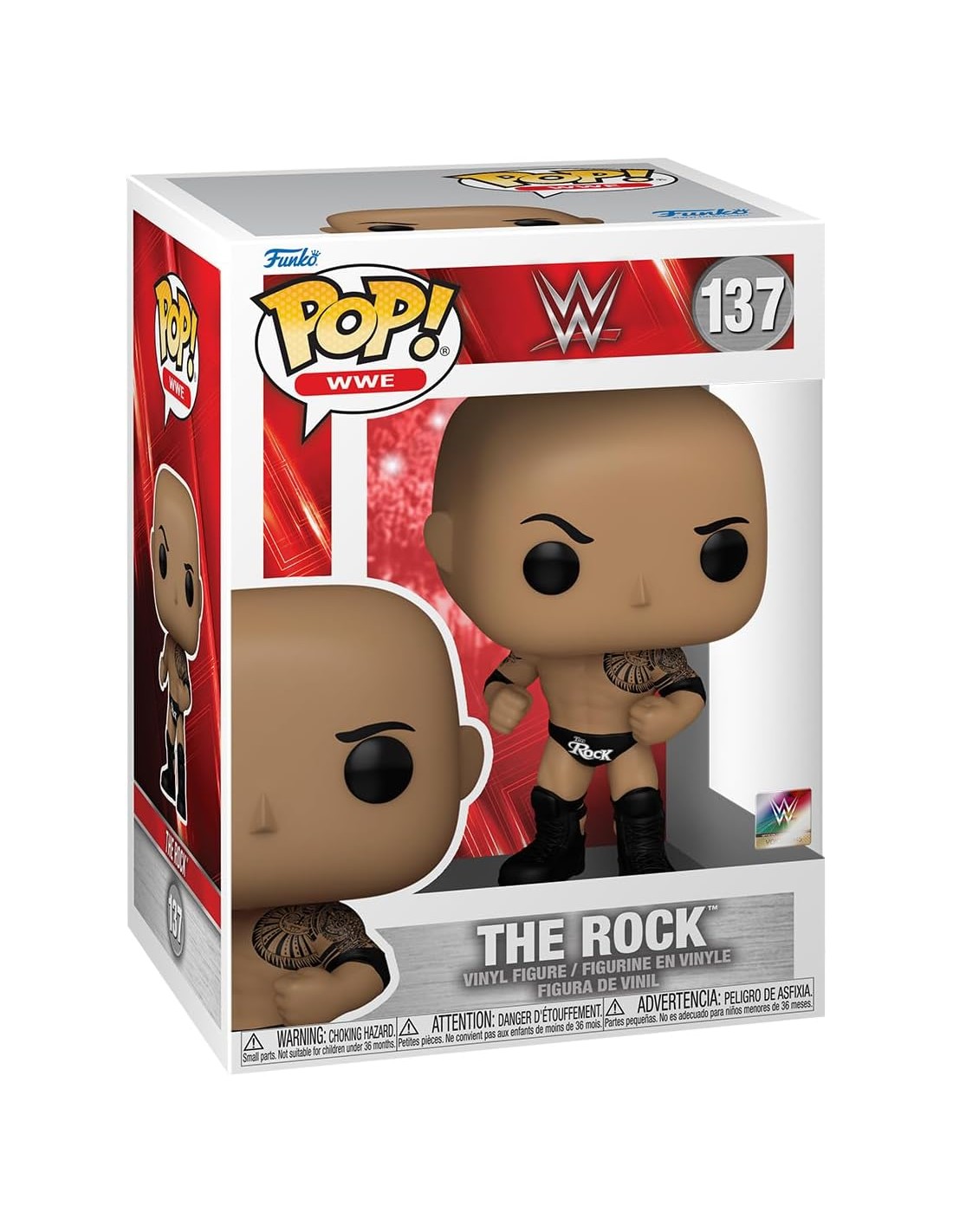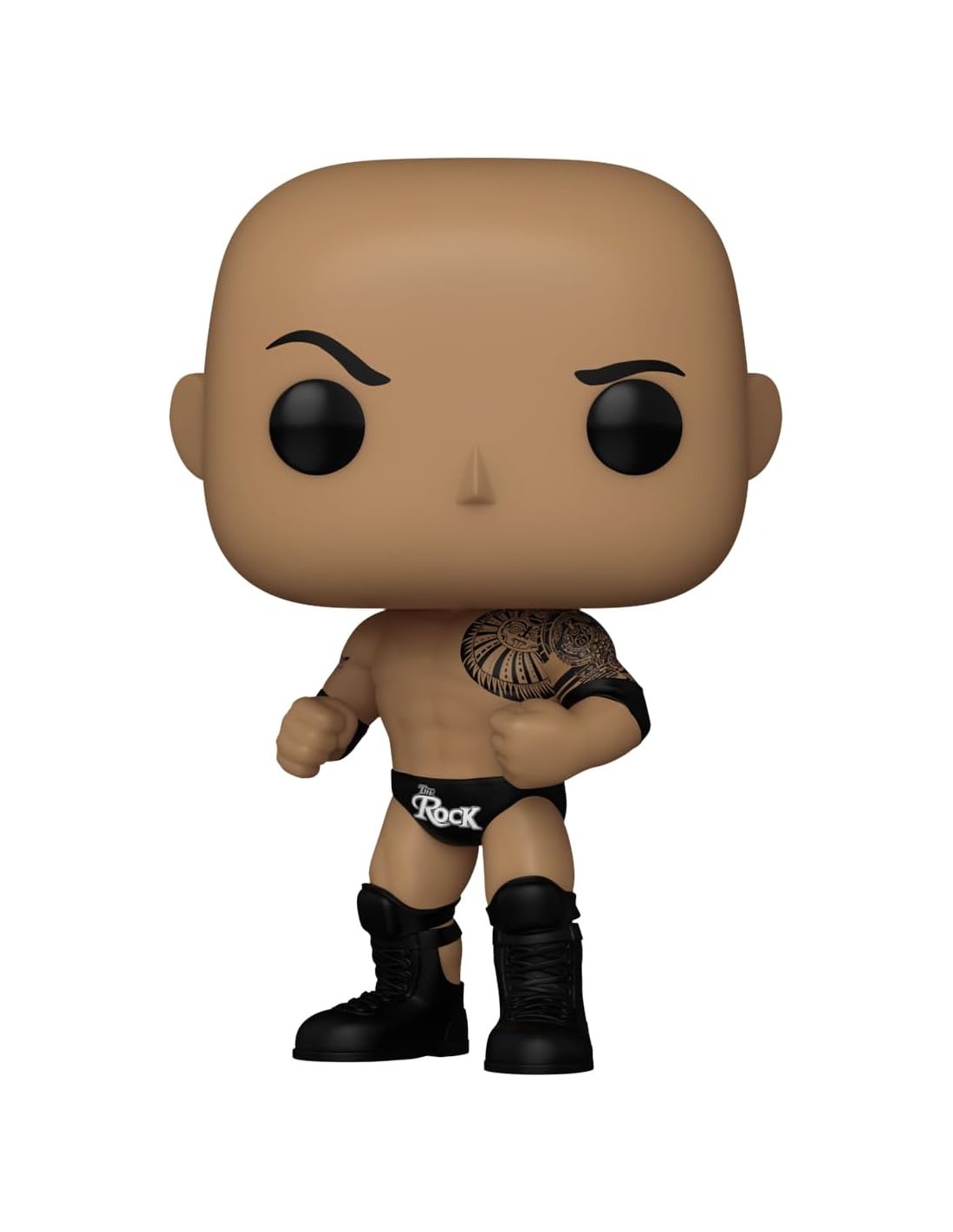 En cuanto a su vestimenta, la figura luce su atuendo clásico de combate: calzoncillos negros con el nombre "The Rock" serigrafiado en el frente, rodilleras protectoras y botas de lucha altas en color negro. La pose de la figura, con los puños cerrados y en guardia, evoca su intensidad dentro del cuadrilátero. Con el tamaño estándar de la línea Funko Pop, esta pieza es un objeto de colección imprescindible para los fanáticos de la WWE y de la trayectoria de Dwayne Johnson.