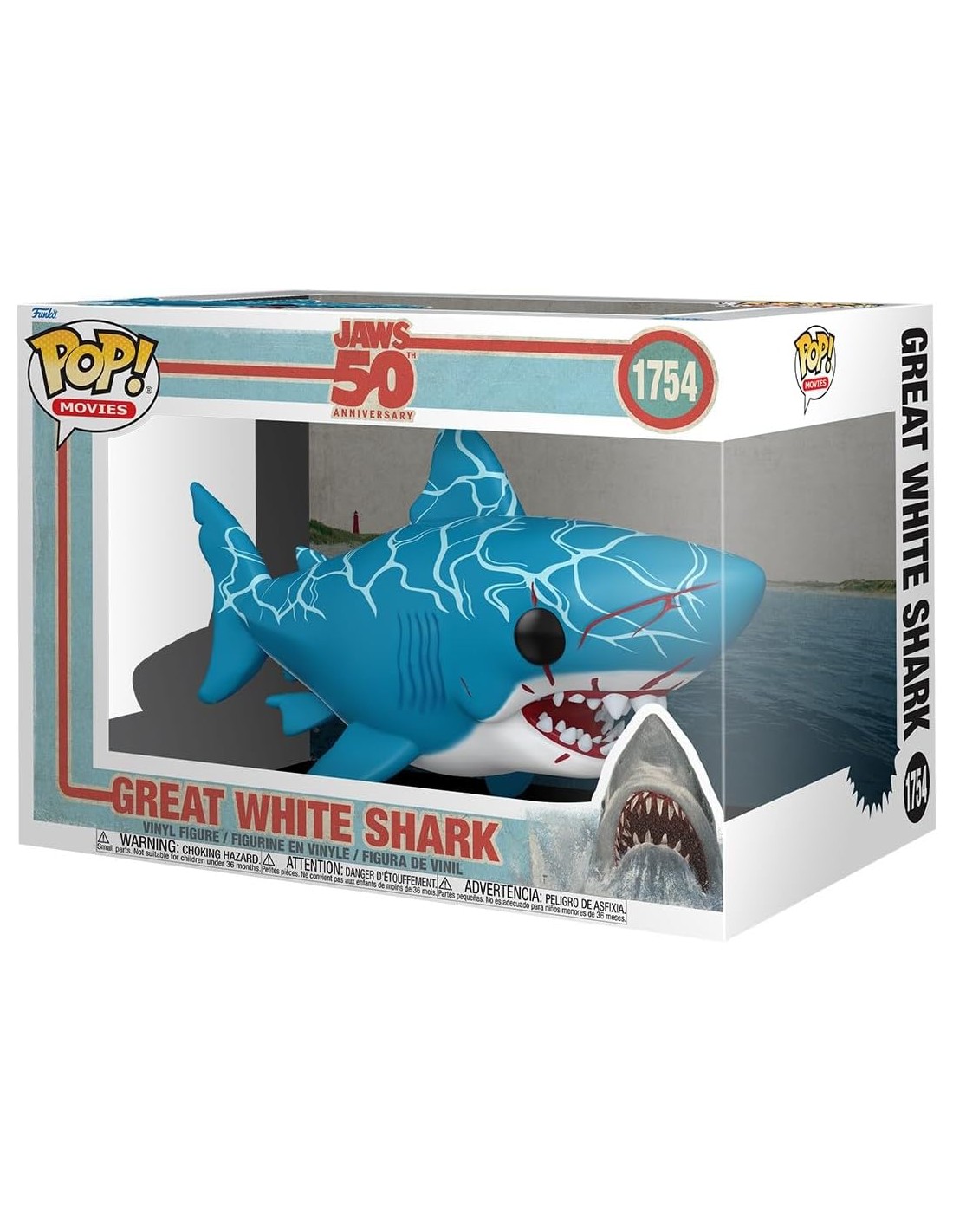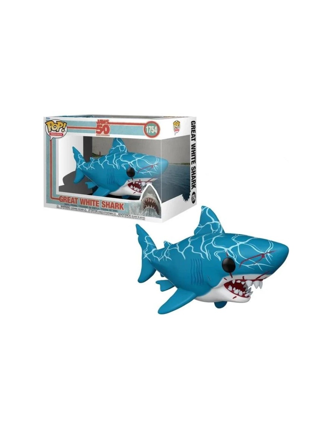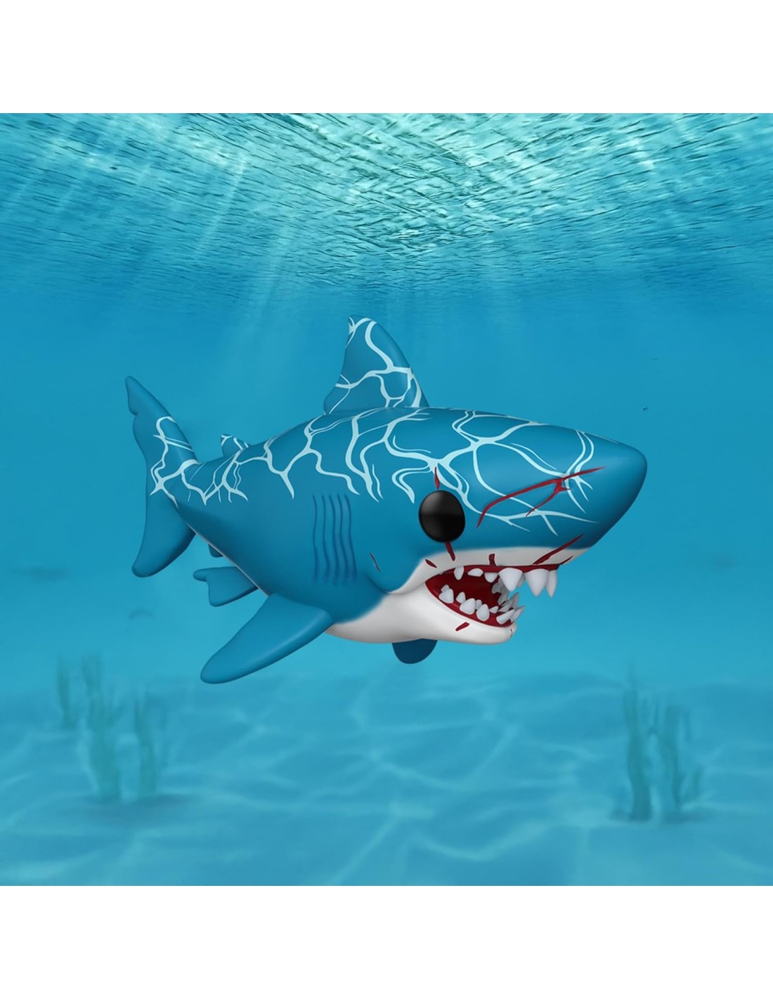 Un detalle fundamental de este modelo son las manchas de sangre situadas alrededor de sus fauces abiertas y en el costado del hocico, lo que evoca la naturaleza feroz del personaje en el filme de Steven Spielberg. Con sus ojos negros profundos y sus hileras de dientes blancos en contraste con el azul del cuerpo, esta figura de 15 cm se convierte en una pieza de coleccionista imprescindible para conmemorar cinco décadas de terror en alta mar.