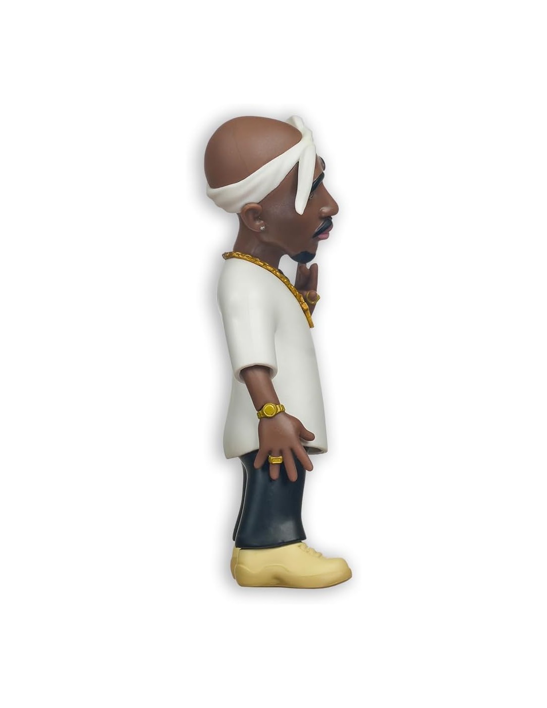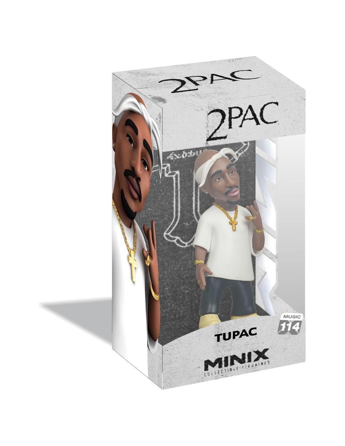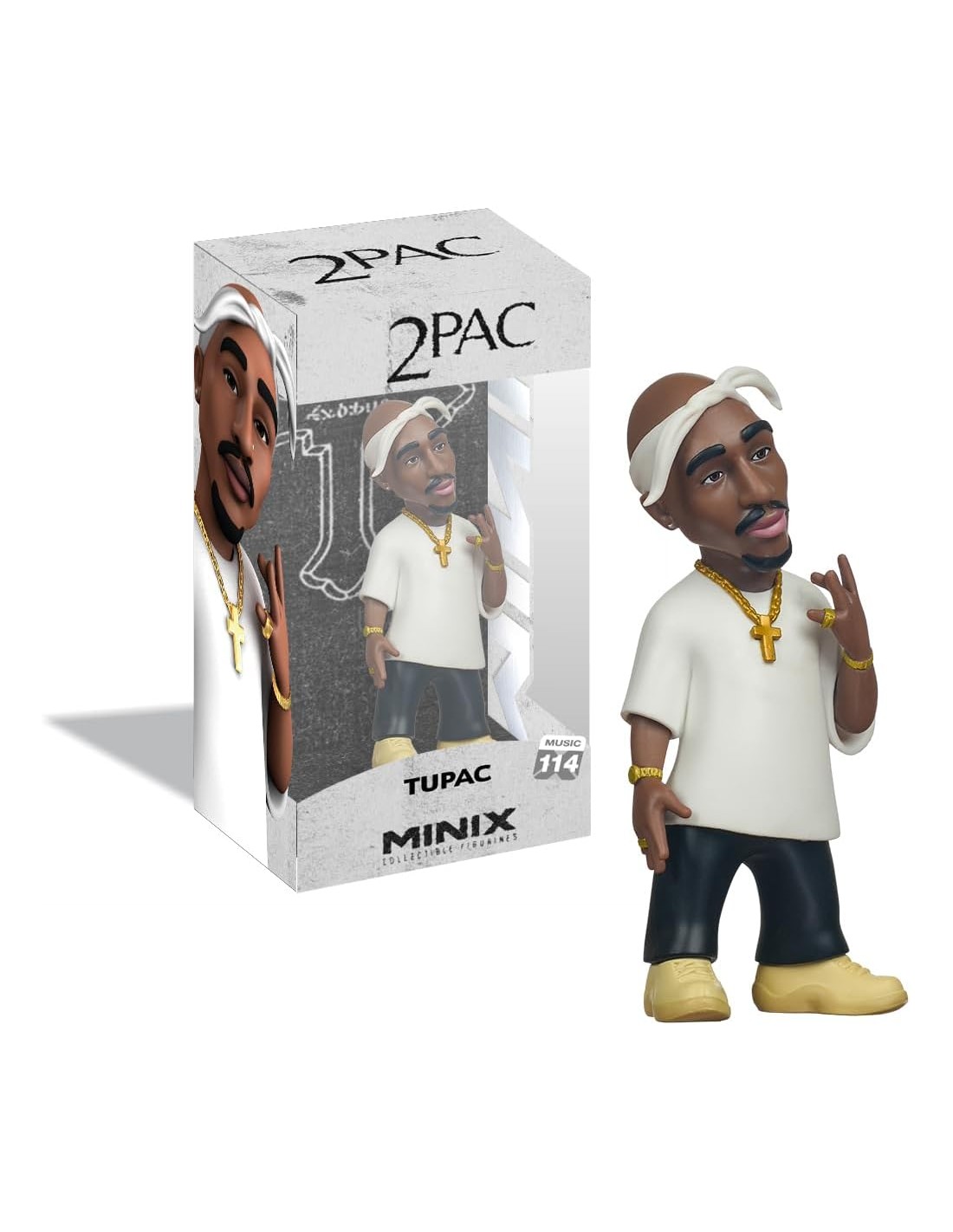 El realismo de la pieza se ve reforzado por sus accesorios dorados: una cadena con una cruz, pulseras en ambas muñecas y un anillo en su mano izquierda. La pose es dinámica y llena de personalidad, con la cabeza ligeramente ladeada y la mano izquierda realizando un gesto emblemático de la cultura del rap. Con una altura aproximada de 12 cm, esta figura de la línea Minix destaca por su acabado de alta calidad, convirtiéndose en un objeto de culto para los amantes de la música y el coleccionismo.