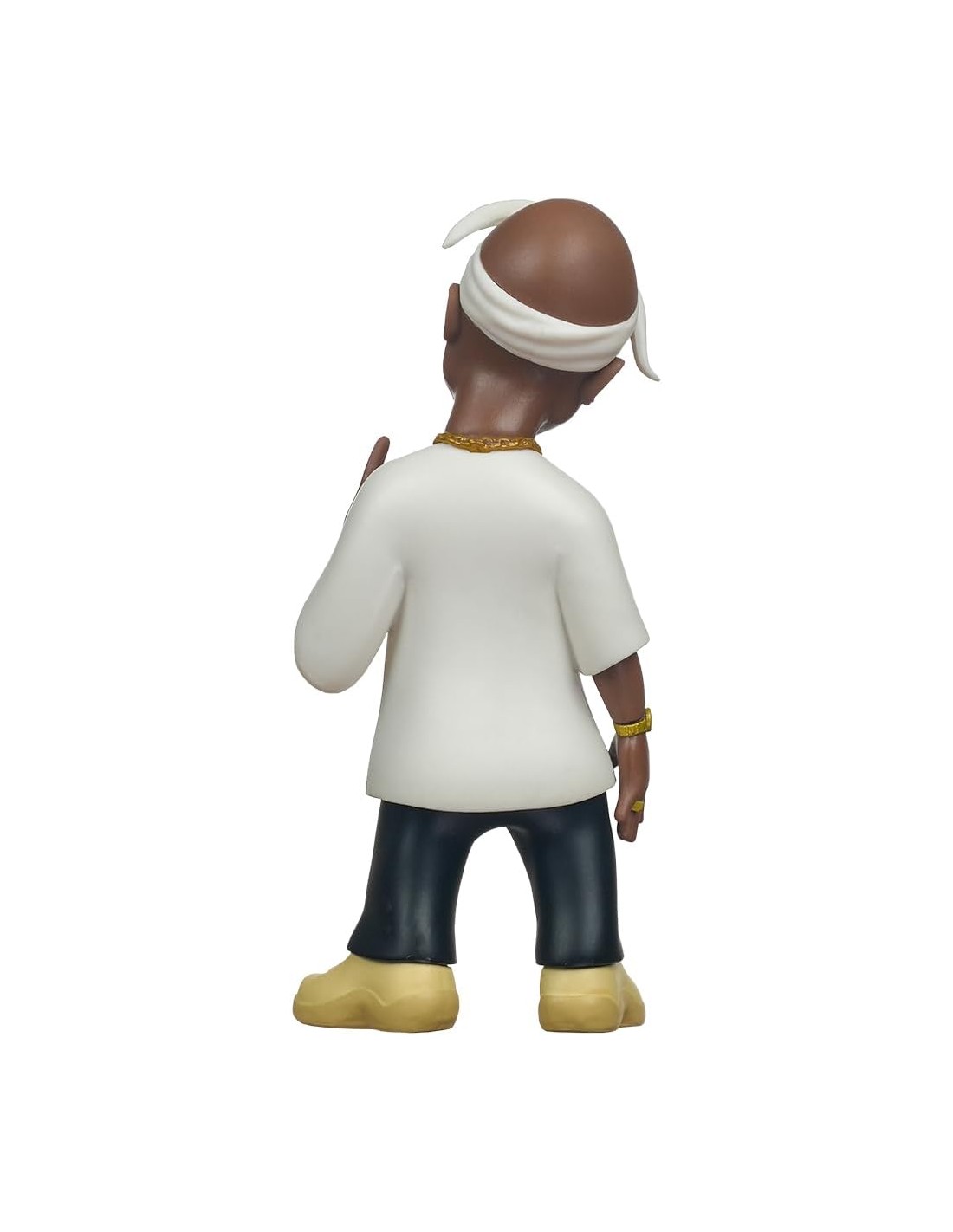 La figura presenta a Tupac con un nivel de detalle excepcional que incluye sus rasgos más distintivos, como el pañuelo blanco atado a la frente, su característico bigote y perilla, e incluso el pequeño brillante en la nariz. Viste una estética puramente urbana de los años 90, compuesta por una camiseta blanca de corte ancho, pantalones oscuros y zapatillas de color crema.