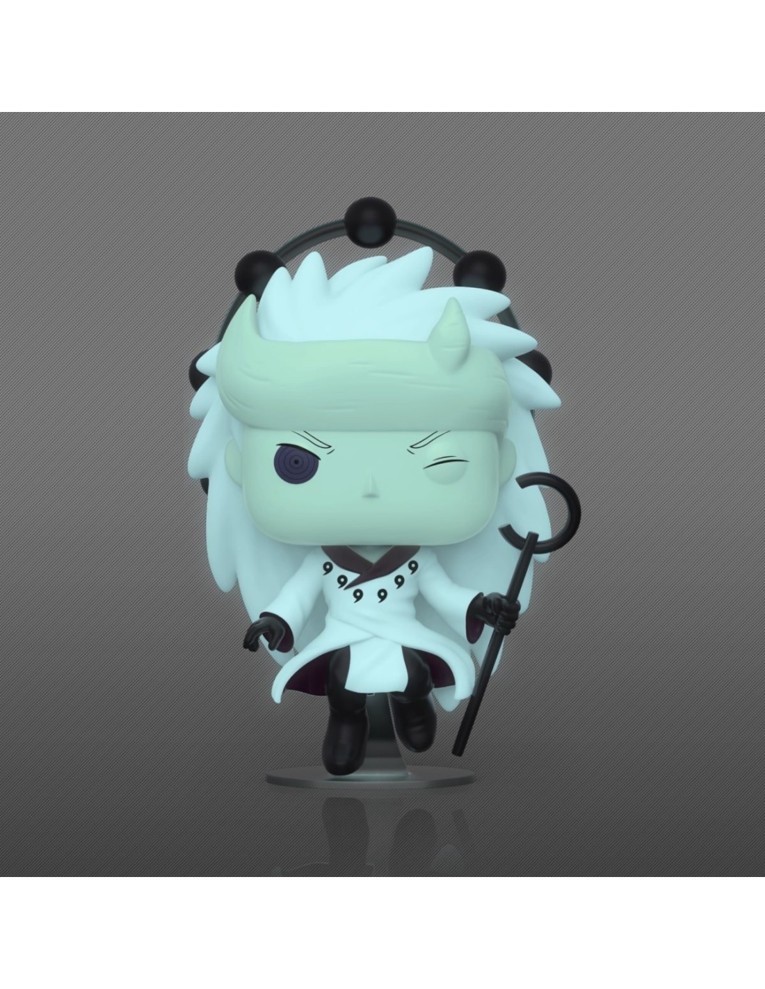 Madara Uchiha, uno de los antagonistas más notables de Naruto Shippuden, es representado en esta figura con su atuendo característico y sus ojos con el Sharingan y el Rinnegan. La figura brilla en la oscuridad, lo que le da un aspecto aún más impresionante y evoca la fuerza y la presencia dominante de Madara.