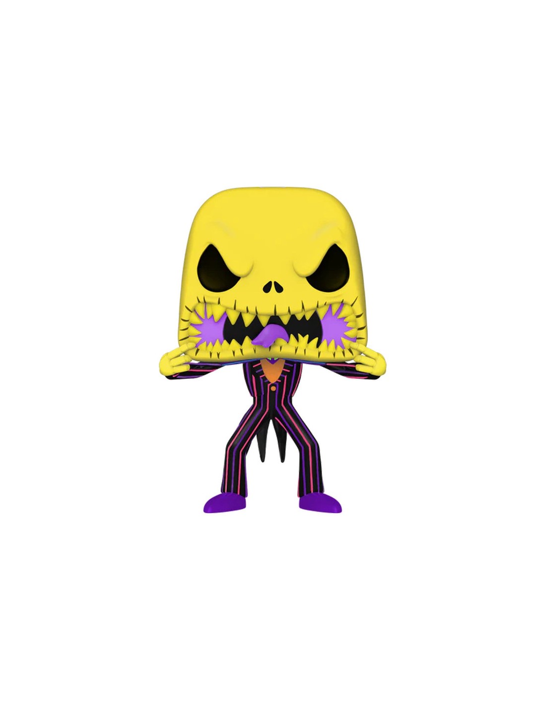 La Figura Funko Pop presenta a Jack Skellington en su inconfundible atuendo, detallado con precisión y con su estilo característico, con una mueca que asusta y la boca muy abierta. La figura sigue el diseño clásico de Funko Pop, con una cabeza grande y expresiva en contraste con un cuerpo más pequeño y estilizado.