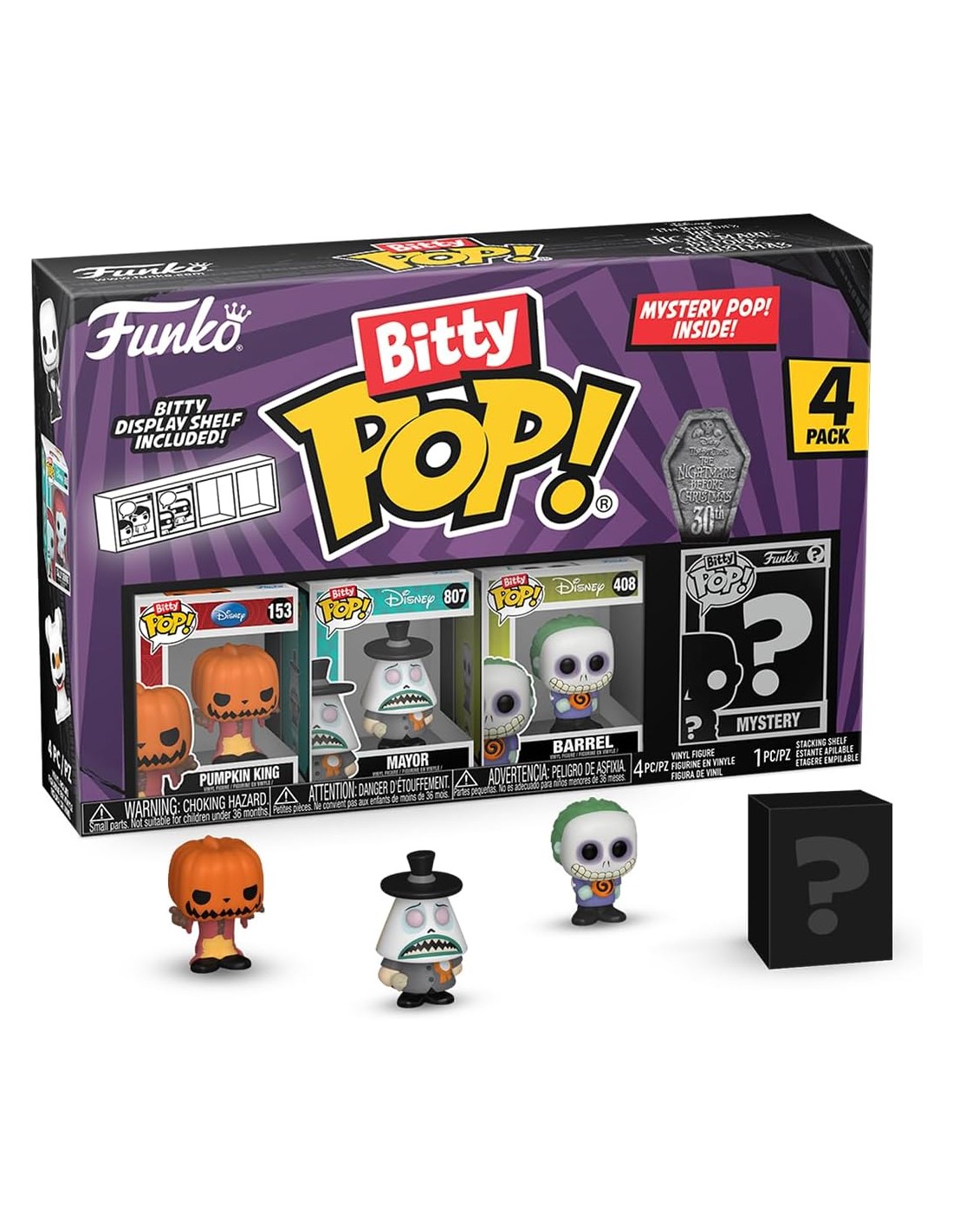 El Pack de 4 Funko Bitty Pop! Disney Pesadilla Antes de Navidad Modelo 73020 incluye en el pack a El Rey Calabaza, Alcalde y Barrel, la cuarta figura es sorpresa. Cada figura, meticulosamente detallada, captura la esencia de la película. Ideal para coleccionistas y fans de Pesadilla Antes de Navidad. ¡Embárcate en una aventura mágica con Jack Skellington y sus amigos!