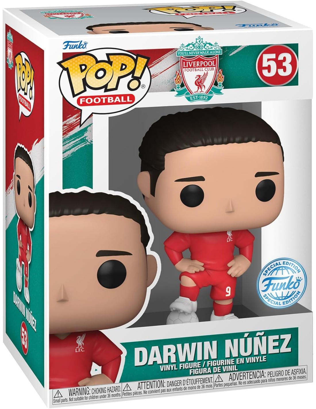 La figura Funko Pop! Fútbol Liverpool Darwin Núñez Modelo 53 es una expresión visual única que rinde homenaje al talentoso jugador uruguayo que ha dejado su marca en el mundo del fútbol. Capturando la esencia distintiva de Darwin Núñez, esta figura Funko Pop! presenta detalles finamente elaborados, desde su uniforme del Liverpool hasta sus características faciales reconocibles.