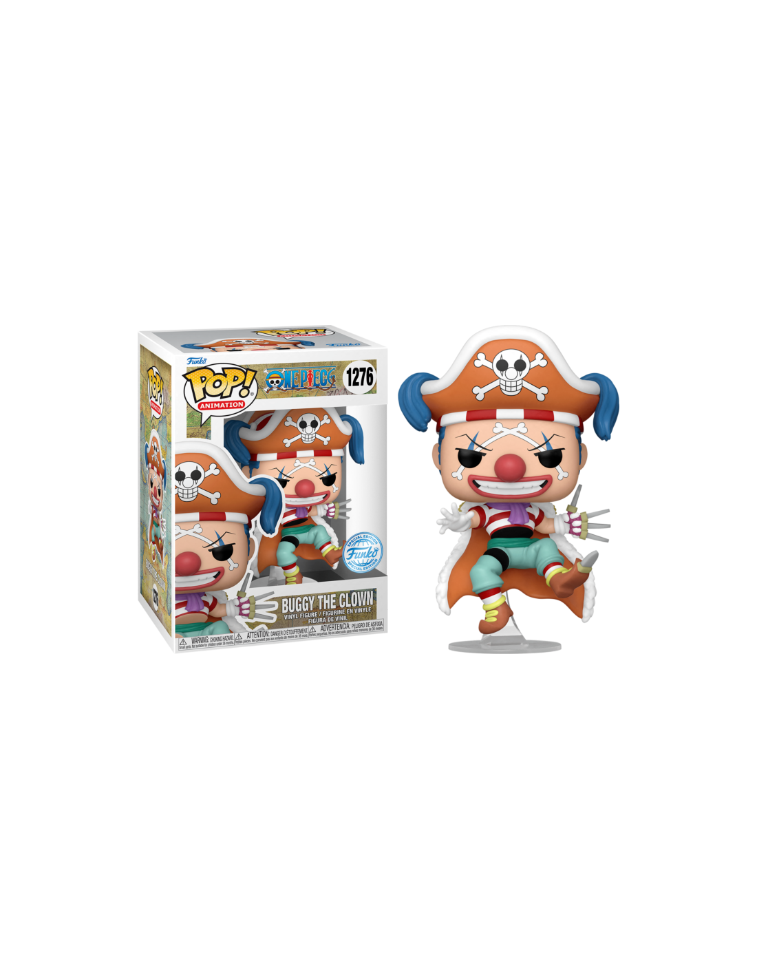La figura Funko Pop! de Buggy El Payaso mide aproximadamente 10 cm de altura y está diseñada con el estilo distintivo de Funko, combinando rasgos chibi adorables con detalles precisos que capturan la esencia del personaje. Desde su característico sombrero de payaso y su nariz roja hasta sus prendas llamativas y su expresión desafiante, cada aspecto de Buggy ha sido cuidadosamente esculpido y pintado para satisfacer a los fanáticos más exigentes.