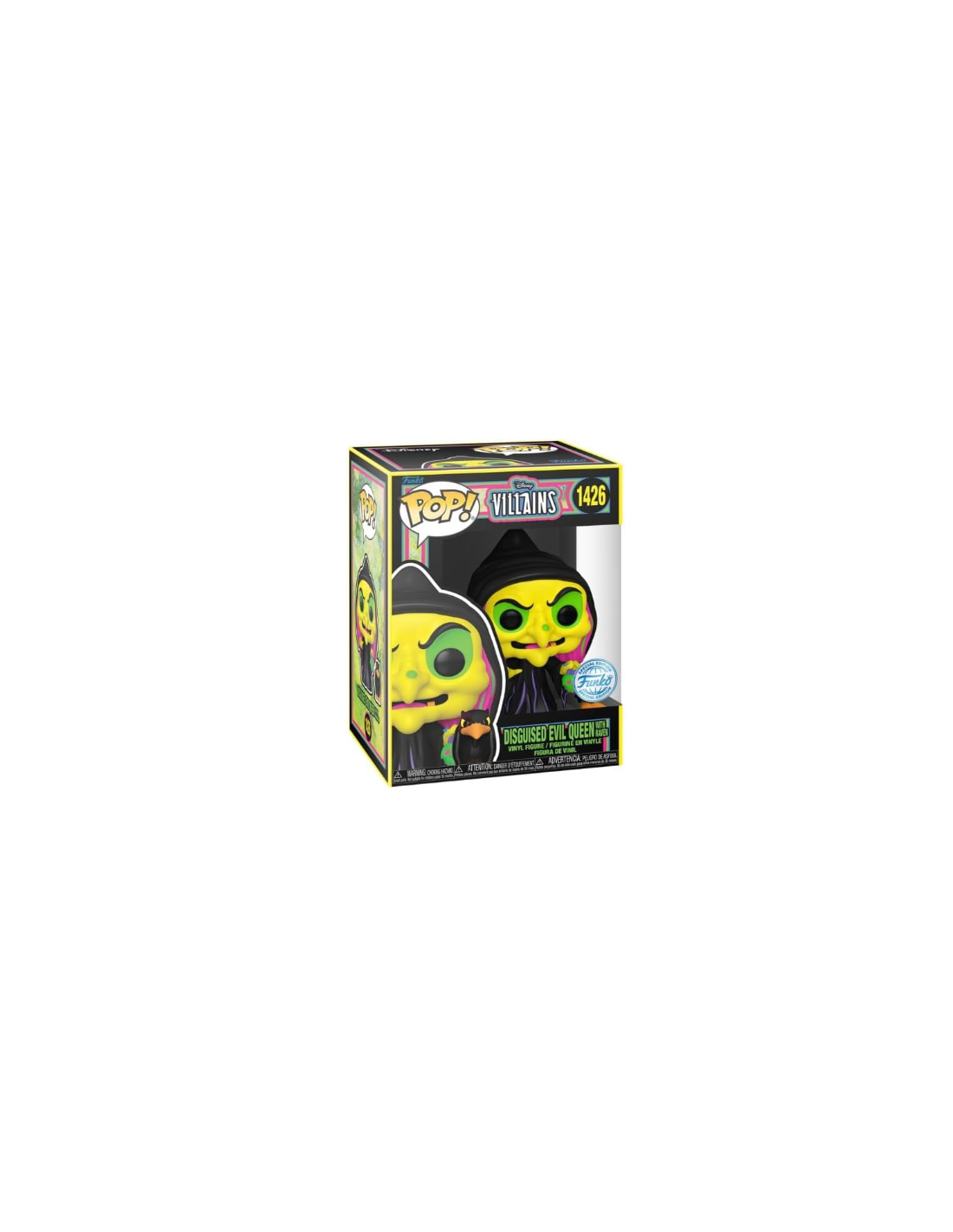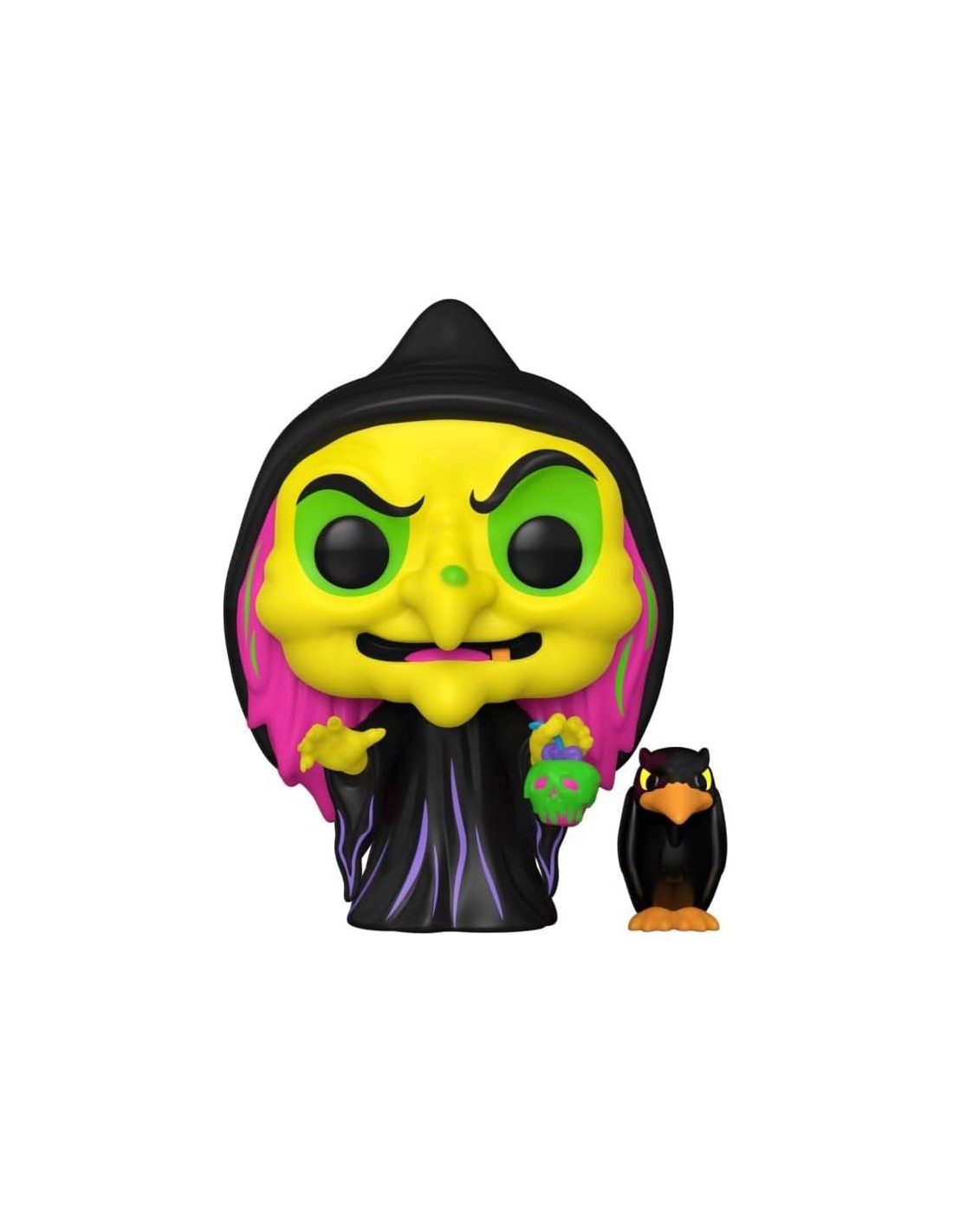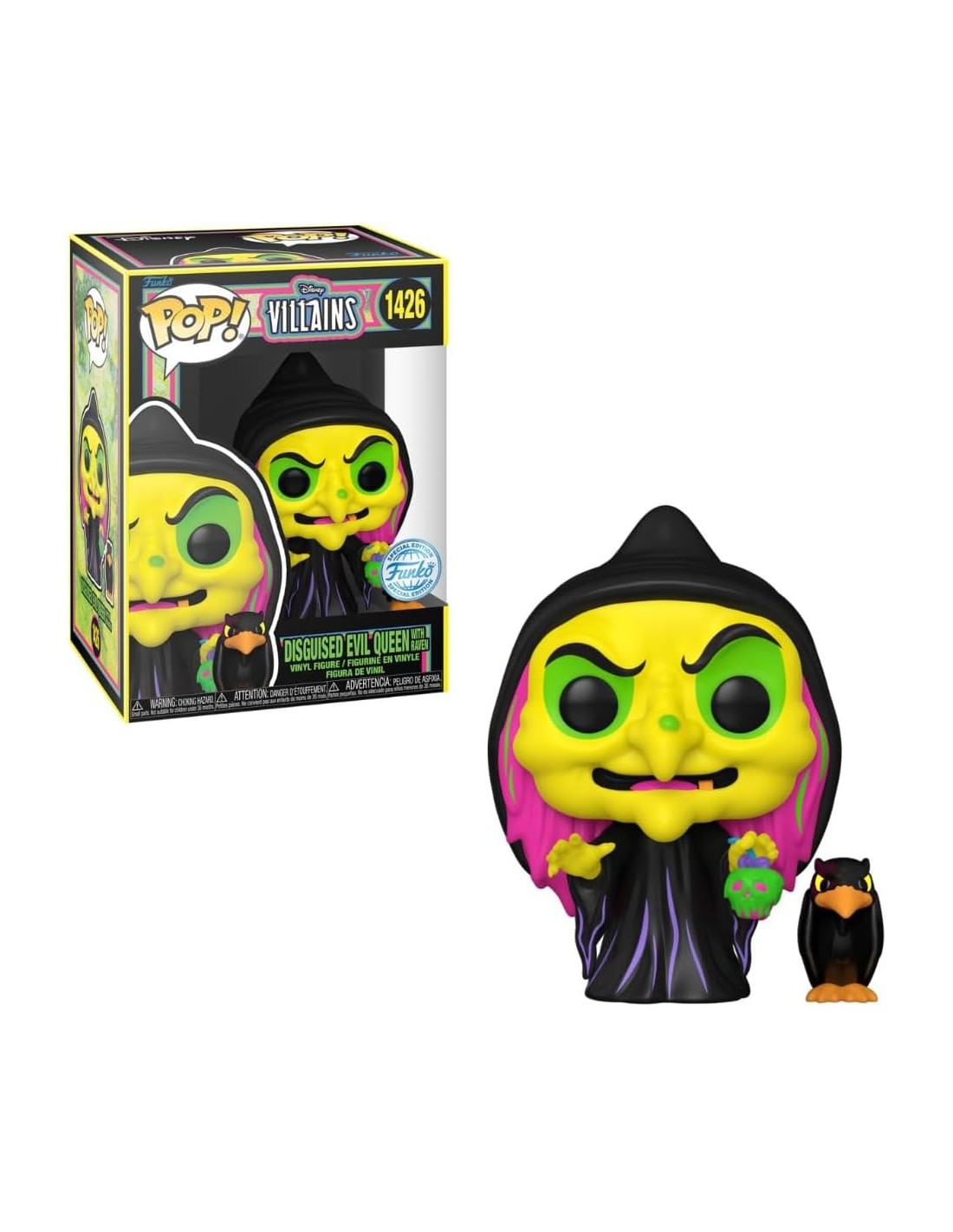 Añade un toque oscuro y mágico a tu colección con la figura Funko Pop! Disney Villanas Reina Malvada Disfrazada con cuervo Modelo 1426 | 76719 Edición Especial Black Light. Esta figura captura a la icónica Reina Malvada de Blancanieves y los Siete Enanitos en su forma más siniestra, disfrazada como una anciana pordiosera y acompañada por su fiel cuervo.