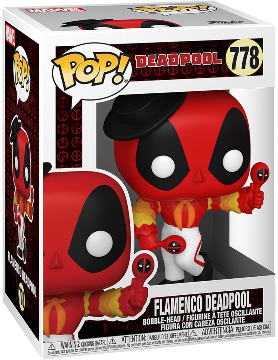 Este Funko Pop! destaca por los detalles minuciosos que capturan a Deadpool con un traje rojo y negro inspirado en la tradicional vestimenta flamenca, completo con una flor en la cabeza y una postura de baile que refleja su naturaleza extravagante. Esta figura es una excelente representación del carácter impredecible y divertido de Wade Wilson, quien nunca deja de sorprender a sus fans con situaciones disparatadas.