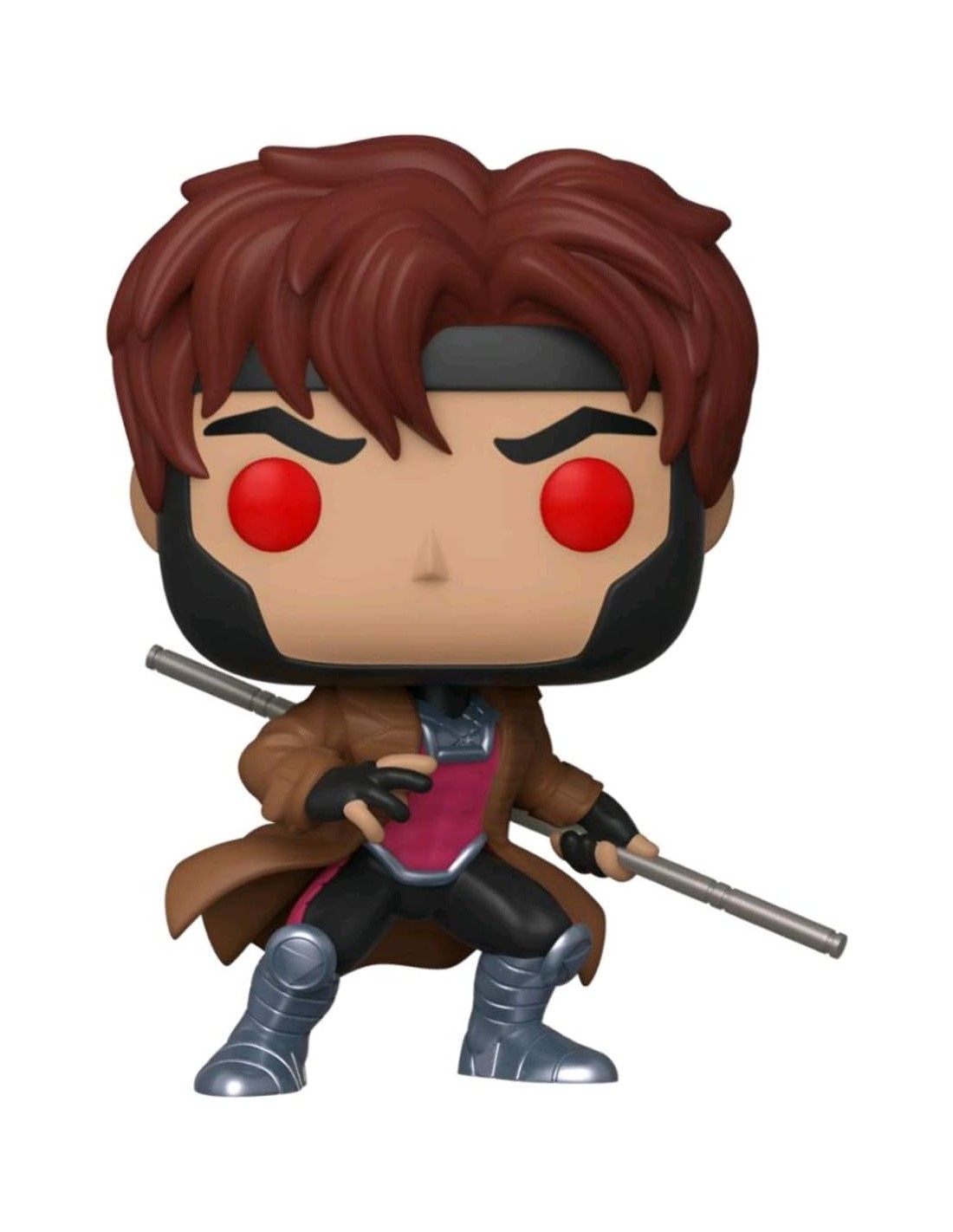Esta figura captura a Gambito en una pose de acción con sus clásicas cartas energizadas en la mano, listo para lanzar su ataque. Lleva su característico abrigo marrón largo, máscara negra y traje morado, fiel al diseño original del cómic. Los detalles del cabello y su expresión confiada reflejan perfectamente la personalidad relajada y audaz del personaje.