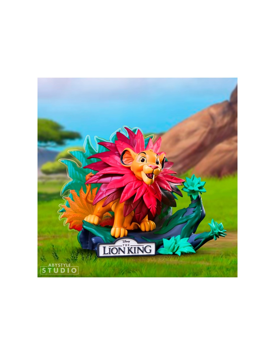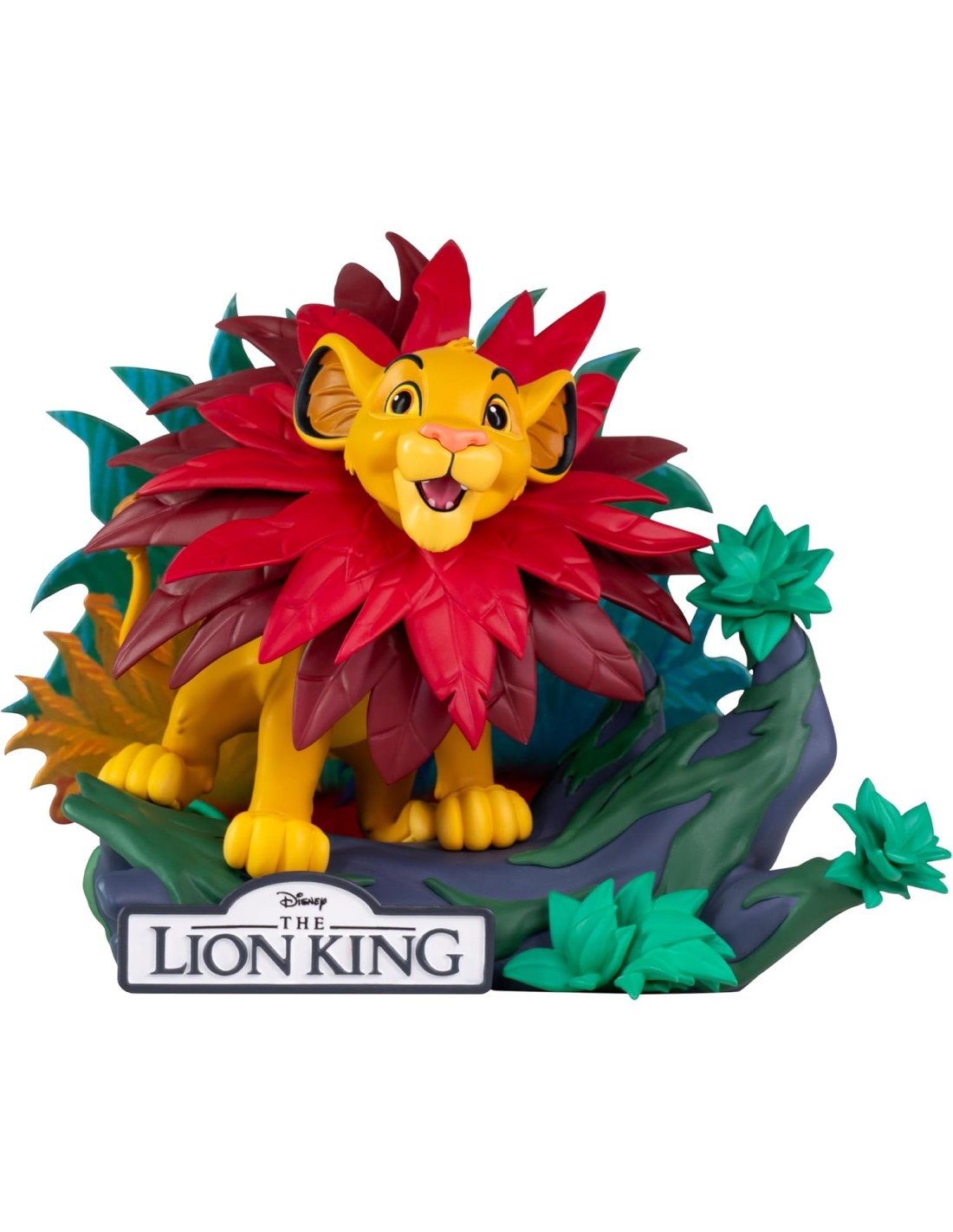 La figura de Simba está colocada sobre una base que representa la exuberante vegetación de la selva africana, creando un ambiente mágico y lleno de vida. Los colores vibrantes y los materiales de alta calidad hacen de esta figura una pieza de colección única.
