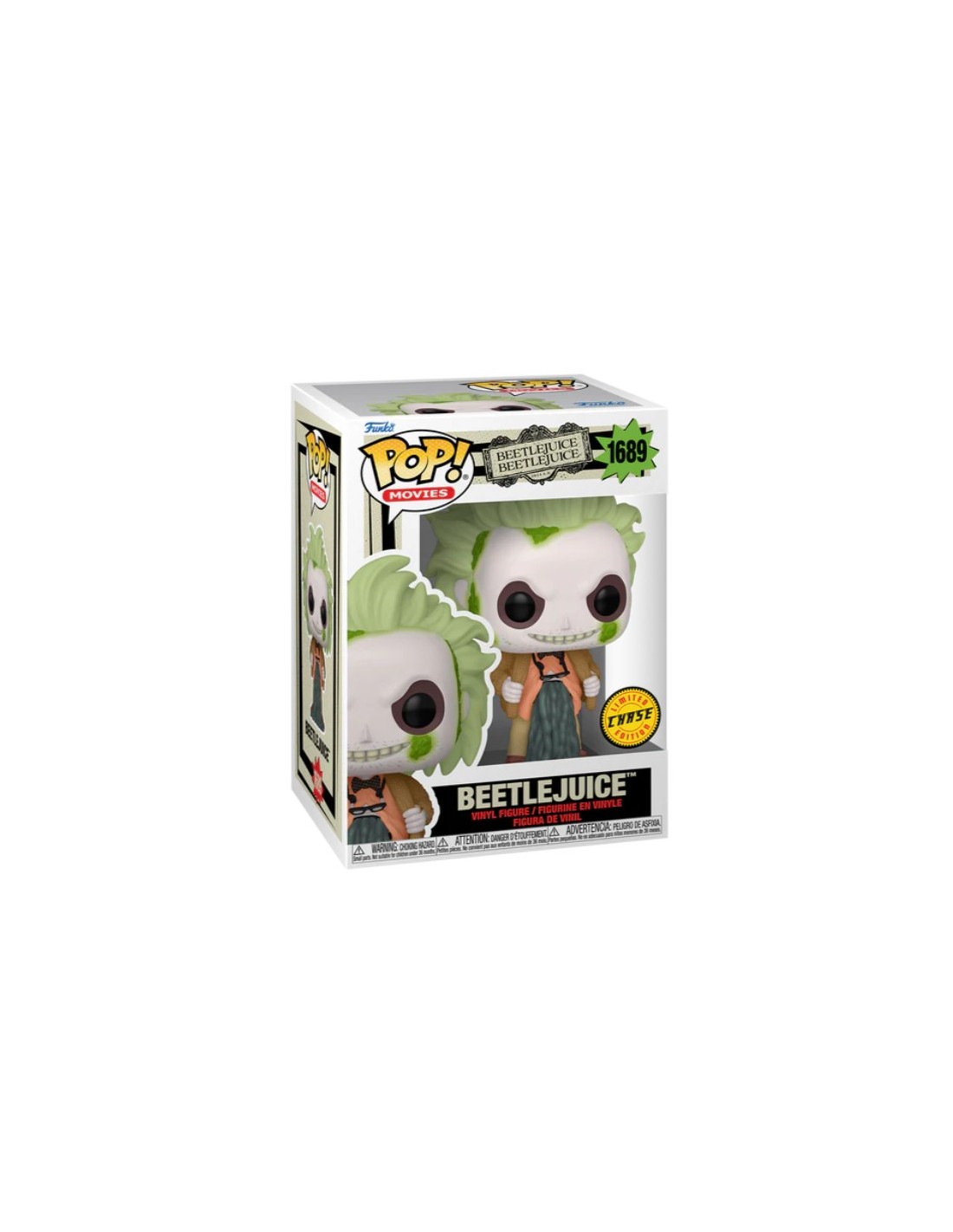 Esta figura mantiene el distintivo traje a rayas blanco y negro, el alocado cabello verde y una expresión maliciosa que captura a la perfección la esencia del personaje. Con el número 1689, esta edición limitada Chase es imprescindible para quienes buscan una pieza única y exclusiva para su colección de Beetlejuice.
