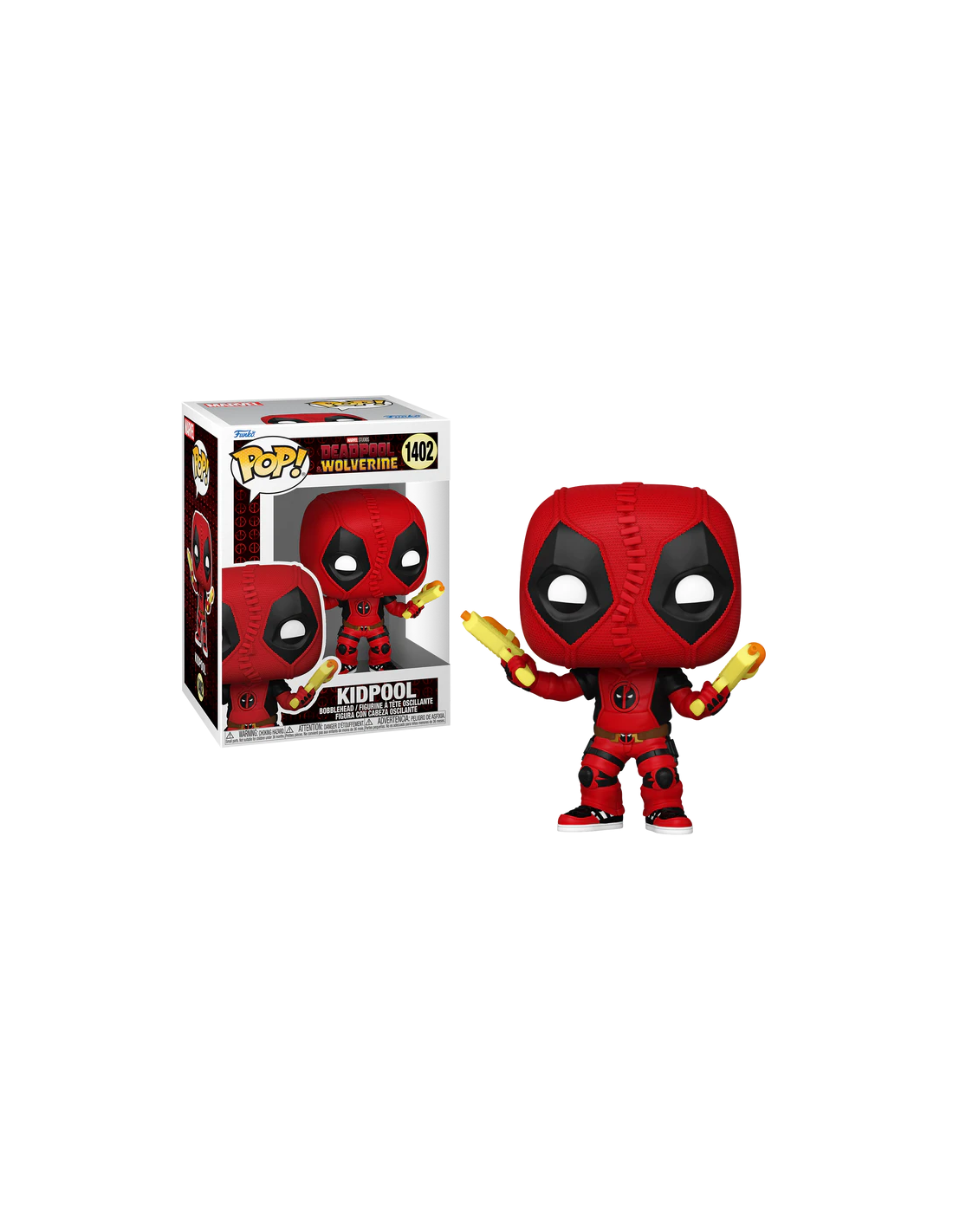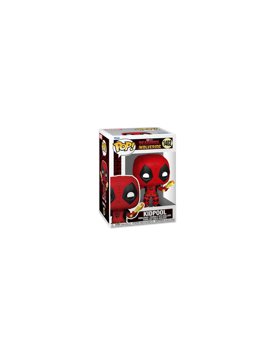 Kidpool lleva su clásico traje rojo y negro, con detalles que reflejan la esencia de Deadpool, pero en su versión infantil. A su lado, Wolverine se presenta con su atuendo de siempre, listo para entrar en acción. La combinación de ambos personajes en esta figura hace que sea una pieza divertida y única para cualquier coleccionista de Marvel. Con el número 1402, esta edición Funko Pop! se destaca por su originalidad y encanto.