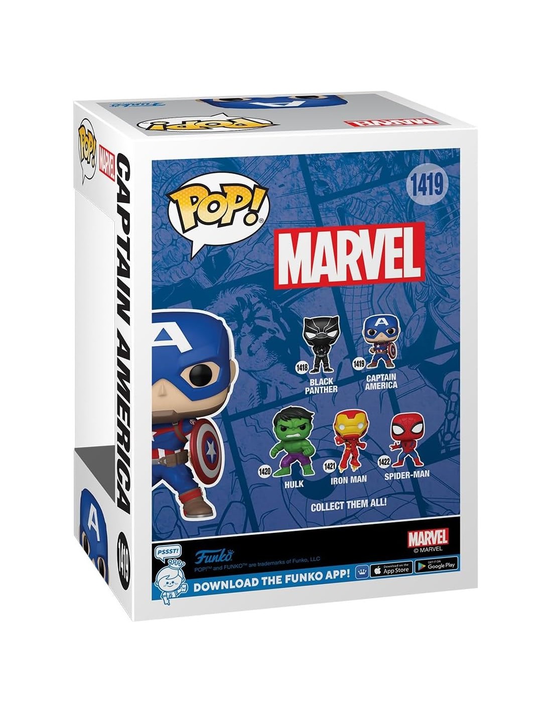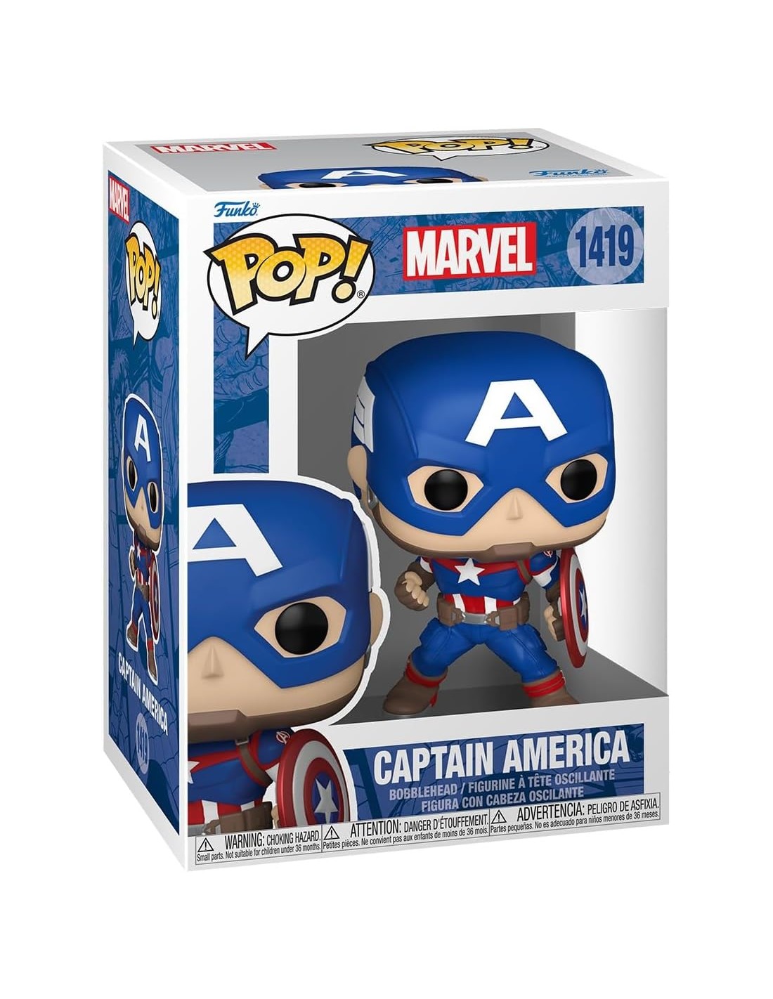 La figura Funko Pop! Capitán America Modelo 1419 | 82497 captura a Steve Rogers en su icónico traje de Capitán América, con su escudo en mano y listo para defender la libertad y la justicia. Hecha de vinilo de alta calidad, esta figura destaca por su diseño meticuloso, que refleja no solo su característico uniforme azul y blanco, sino también la actitud decidida y el espíritu de lucha que lo definen como uno de los héroes más admirados del universo Marvel.
