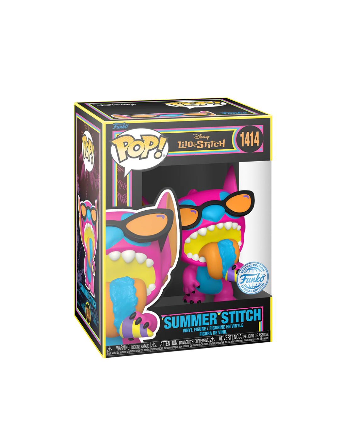 La figura Funko Pop! Disney Summer Stitch, modelo 1414, es una pieza vibrante y única que forma parte de la serie especial Funko Black Light. Esta edición especial de Stitch se destaca por sus colores fluorescentes que brillan bajo la luz negra, dándole un toque espectacular y llamativo. Es la representación perfecta del famoso personaje de Disney en una versión veraniega y festiva.