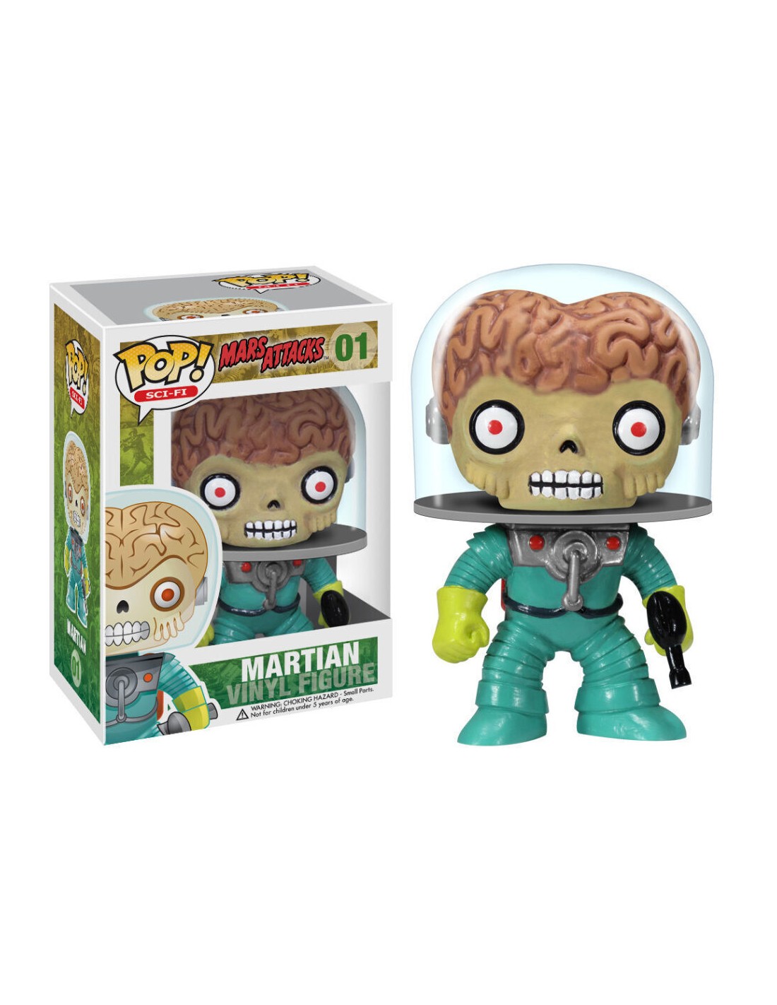 La Figura Funko Pop! Mars Attacks Martian Modelo 01 representa a uno de los alienígenas más reconocidos del cine de ciencia ficción. Con su distintivo cráneo expuesto, ojos saltones y traje espacial retrofuturista en color verde con detalles en rojo y plata, este marciano encarna perfectamente el espíritu de la película de culto Mars Attacks! dirigida por Tim Burton.