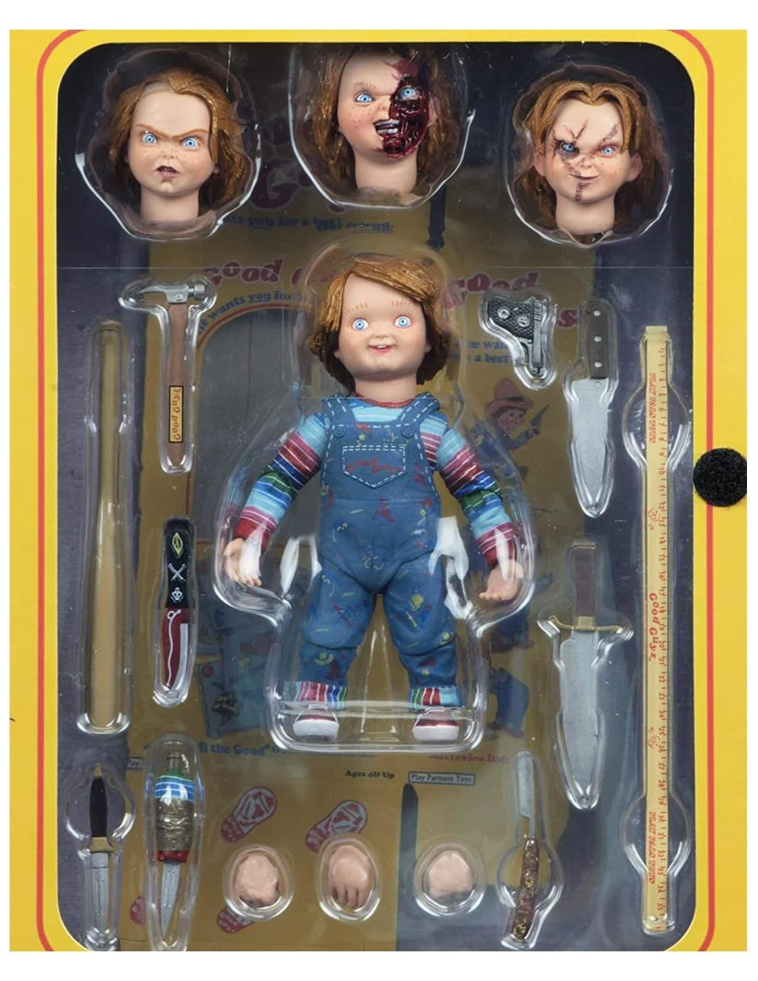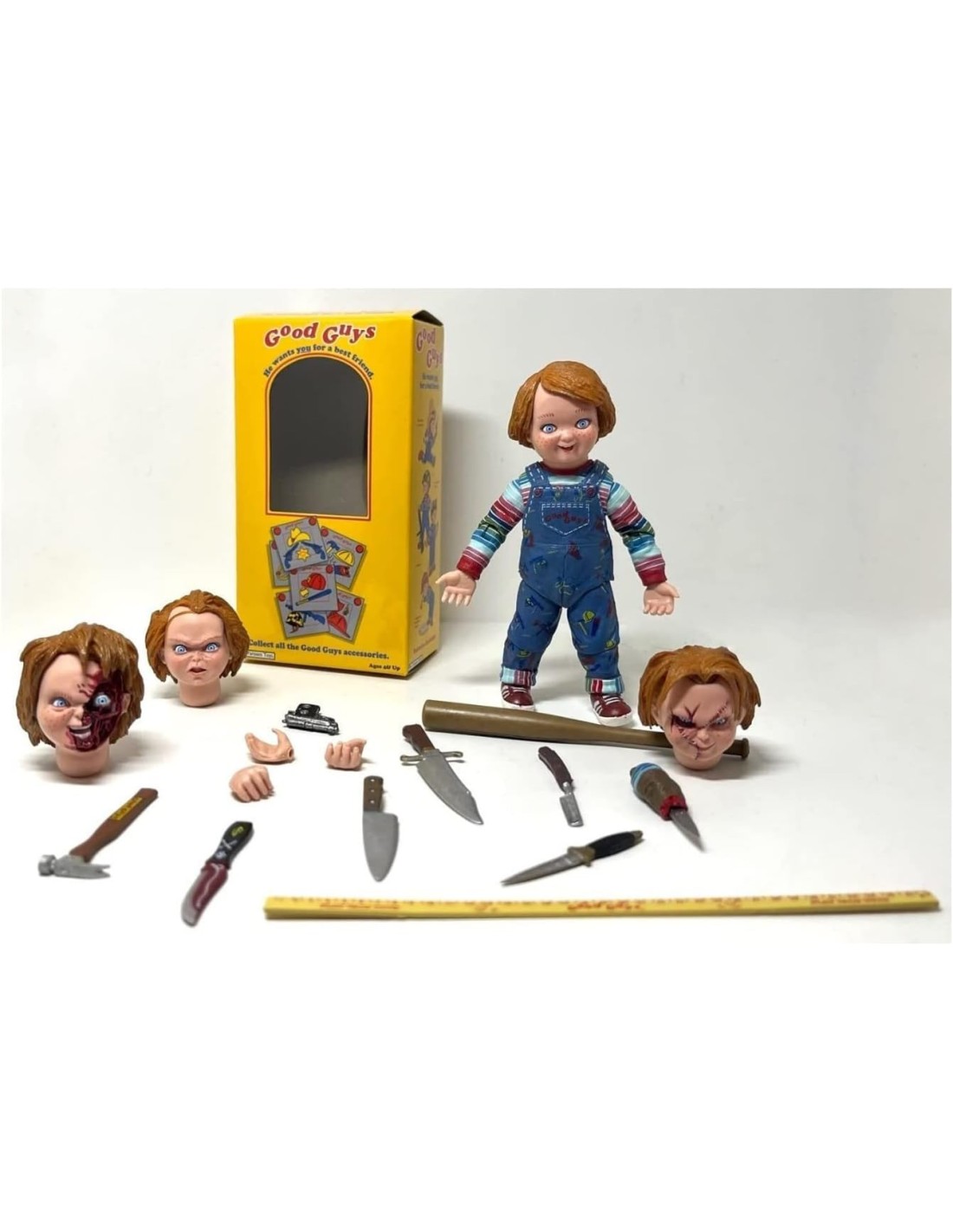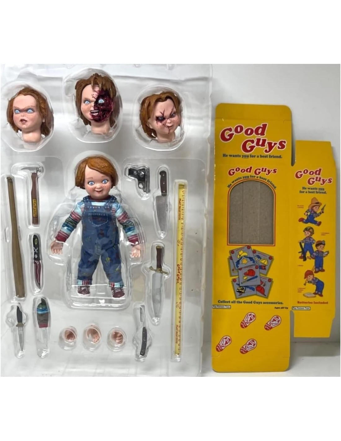Incluye múltiples accesorios como cuchillos, hachas, una pistola y cabezas intercambiables con diferentes expresiones (desde la sonrisa clásica hasta su siniestra versión dañada). La figura es totalmente articulada, permitiendo colocar a Chucky en diversas posturas para exhibirlo en tu colección o recrear las escenas más memorables.