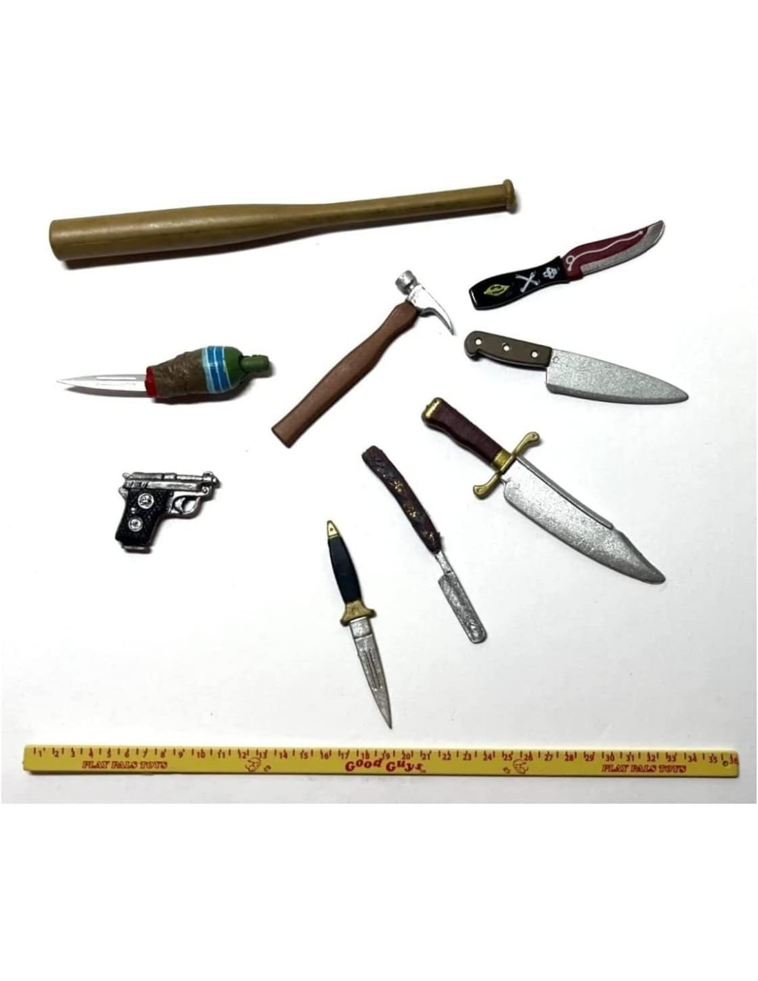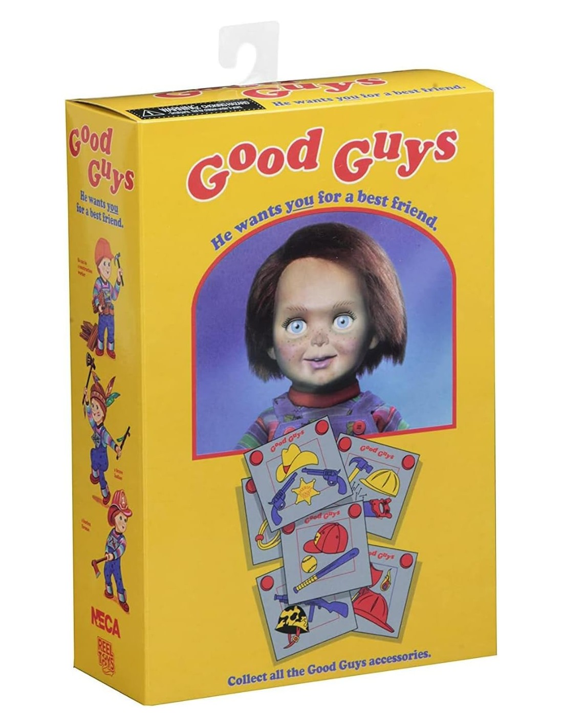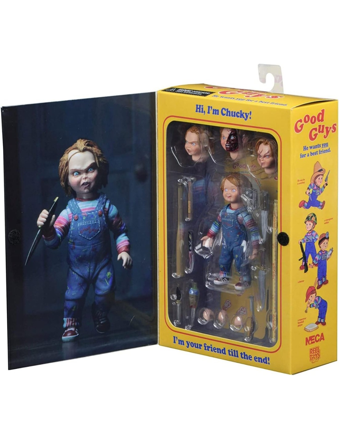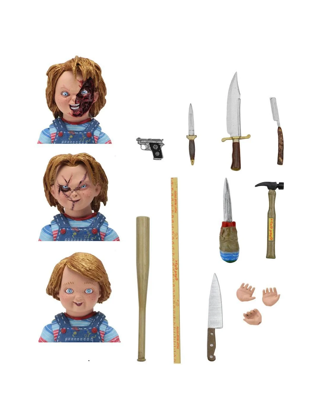 Incluye múltiples accesorios como cuchillos, hachas, una pistola y cabezas intercambiables con diferentes expresiones (desde la sonrisa clásica hasta su siniestra versión dañada). La figura es totalmente articulada, permitiendo colocar a Chucky en diversas posturas para exhibirlo en tu colección o recrear las escenas más memorables.