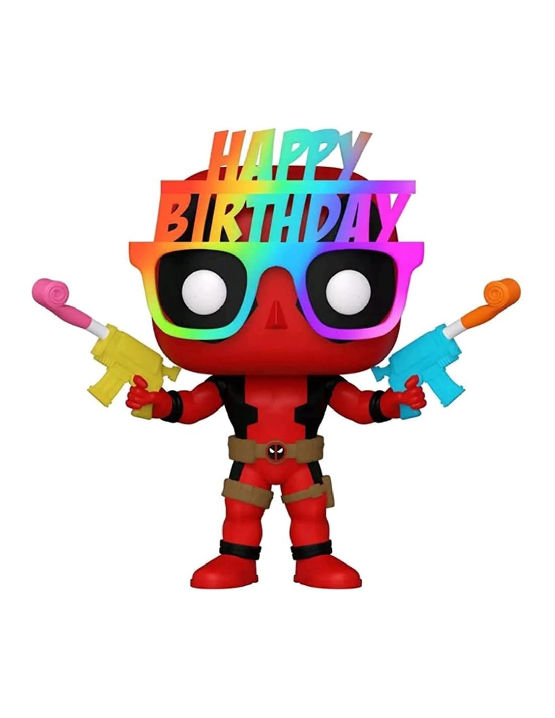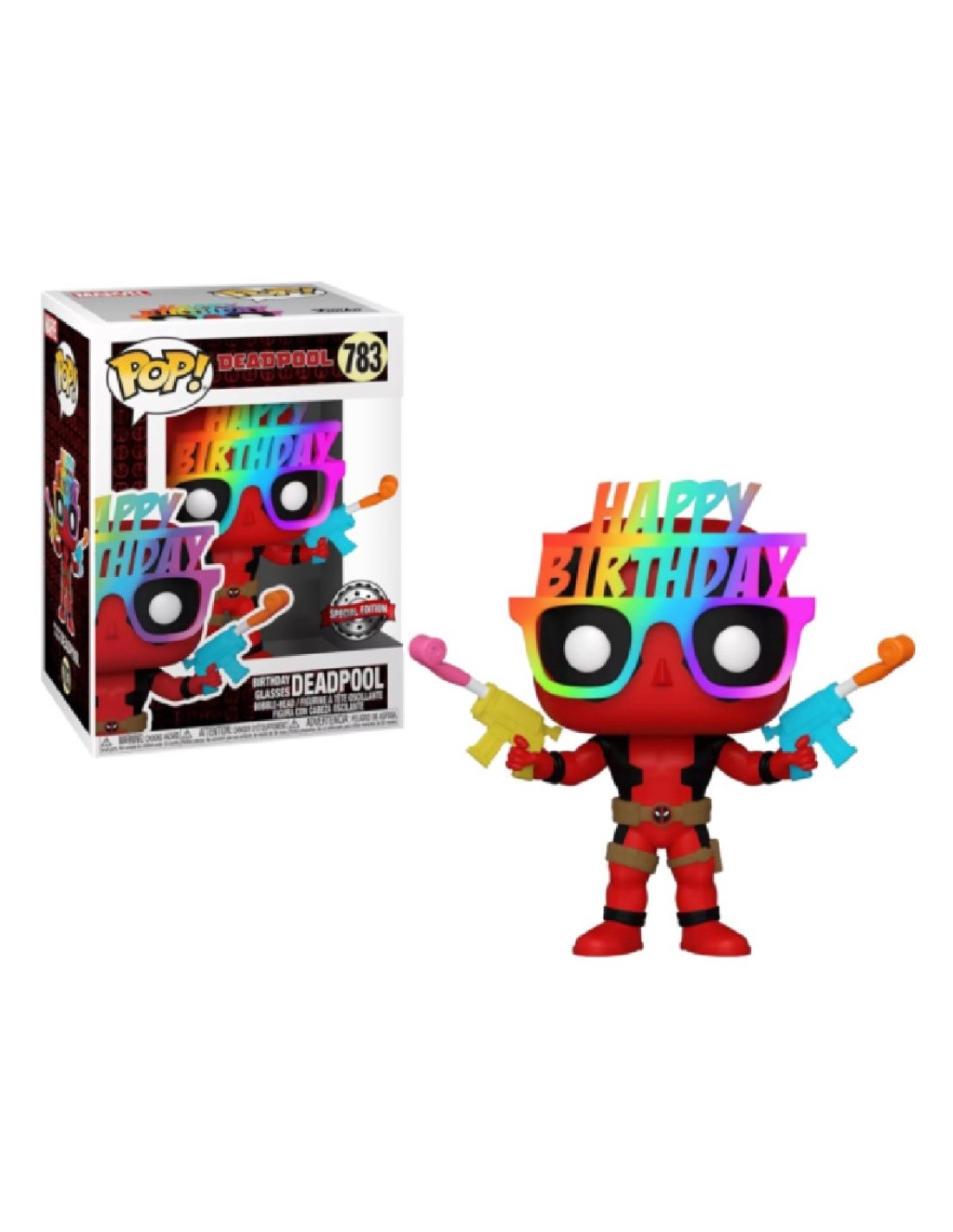 La figura Funko Pop! Marvel Deadpool con Gafas de Feliz Cumpleaños Modelo 783 | 54687 Edición Especial muestra a Wade Wilson, mejor conocido como Deadpool, celebrando al más puro estilo extravagante y cómico que lo caracteriza. Viste su clásico traje rojo y negro y lleva unas llamativas gafas que forman la frase “Happy Birthday”. En cada mano sostiene una pistola decorada con matasuegras multicolores, fusionando humor y acción de forma única.