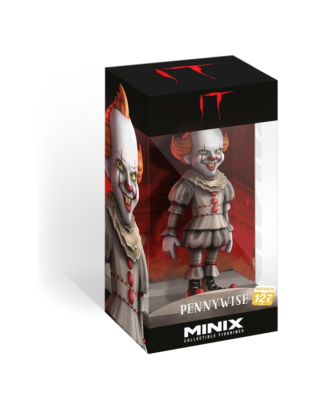 La Figura Minix It Pennywise Modelo 127 captura al escalofriante payaso bailarín de la adaptación cinematográfica de It dirigida por Andy Muschietti. Inspirada en la versión interpretada por Bill Skarsgård, esta figura presenta a Pennywise con su clásico traje victoriano gris, el maquillaje perturbador y, por supuesto, el infame globo rojo que ha causado pesadillas a generaciones.