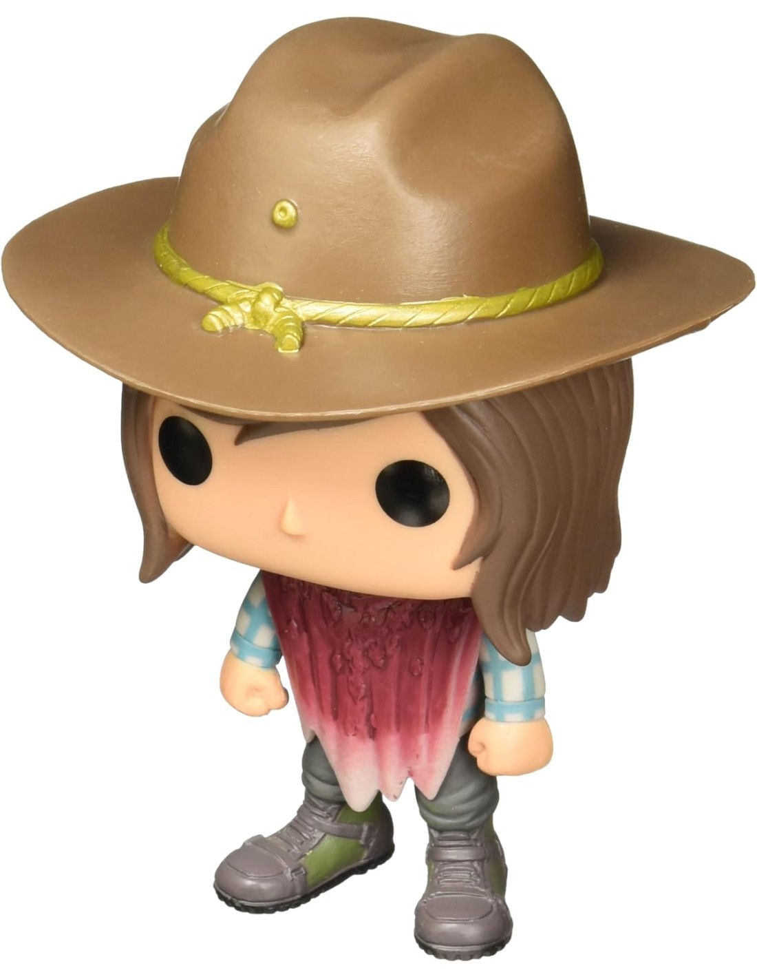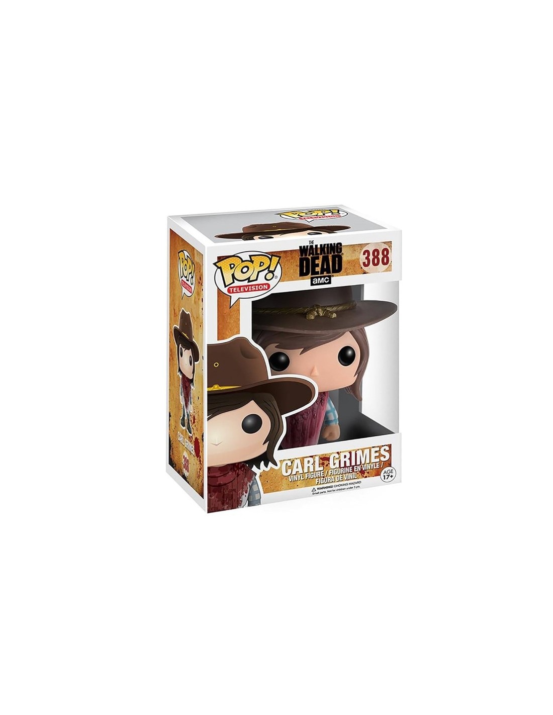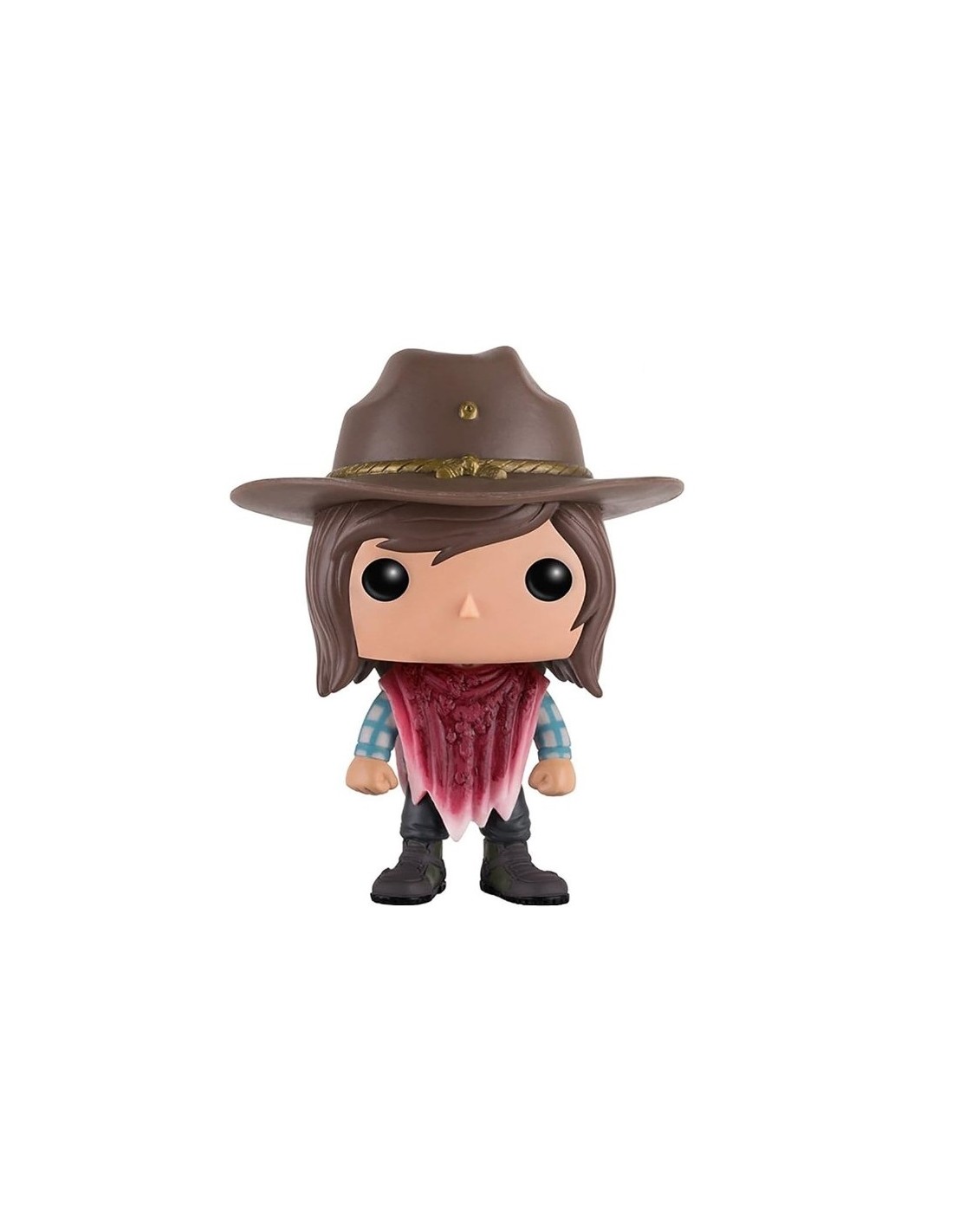 Esta figura Funko Pop! representa a Carl Grimes, uno de los personajes más importantes y entrañables de la serie The Walking Dead. Mostrando su evolución como superviviente, la figura lo presenta con su clásico sombrero de sheriff heredado de su padre, Rick Grimes, y una bufanda cubierta de sangre, como se ve en algunas de las escenas más tensas de la serie.