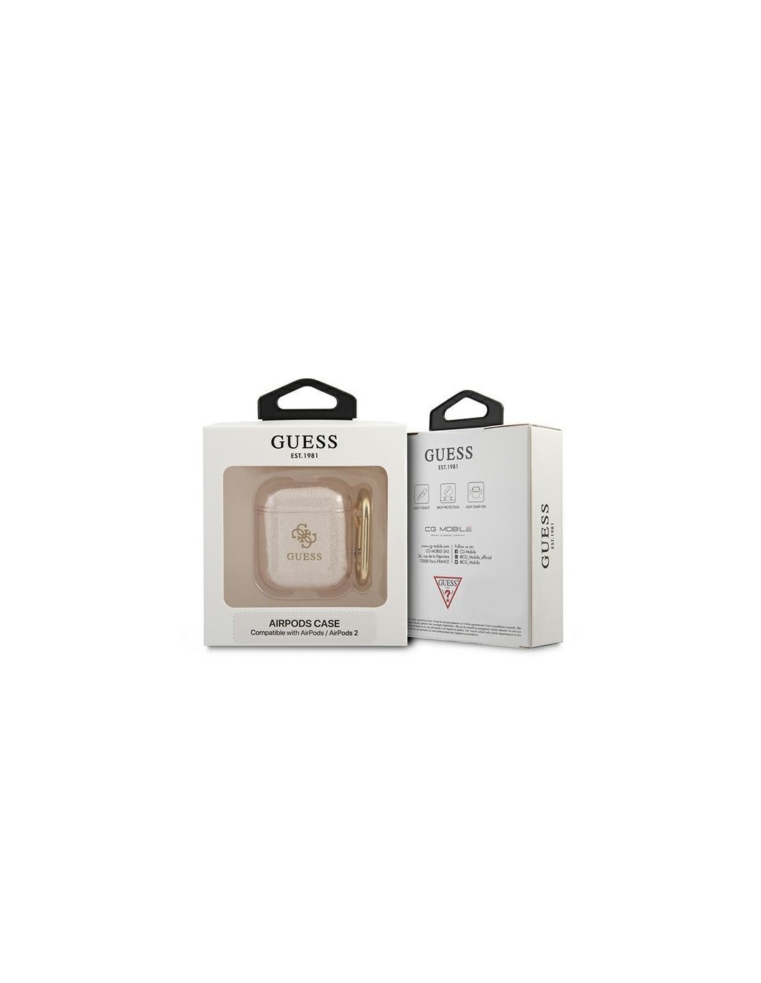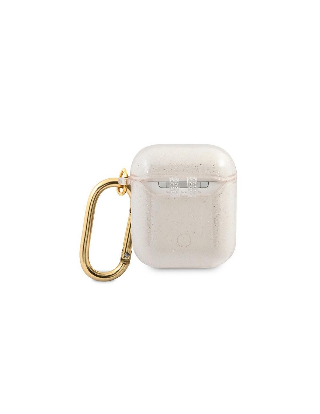 La elegante funda semitransparente dorada glitter Guess para Apple Airpods está hecha de una combinación de material duradero con policarbonato que protege los auriculares.