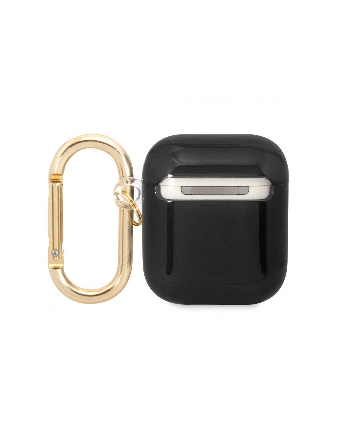 La elegante funda negra con detalles dorados de Guess para Apple Airpods está hecha de una combinación de material duradero con policarbonato que protege los auriculares.