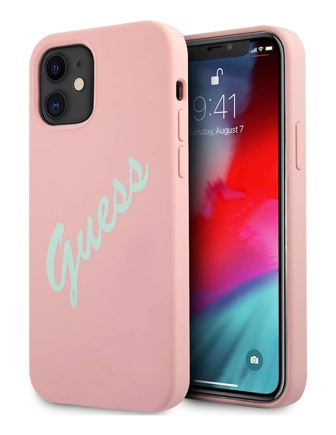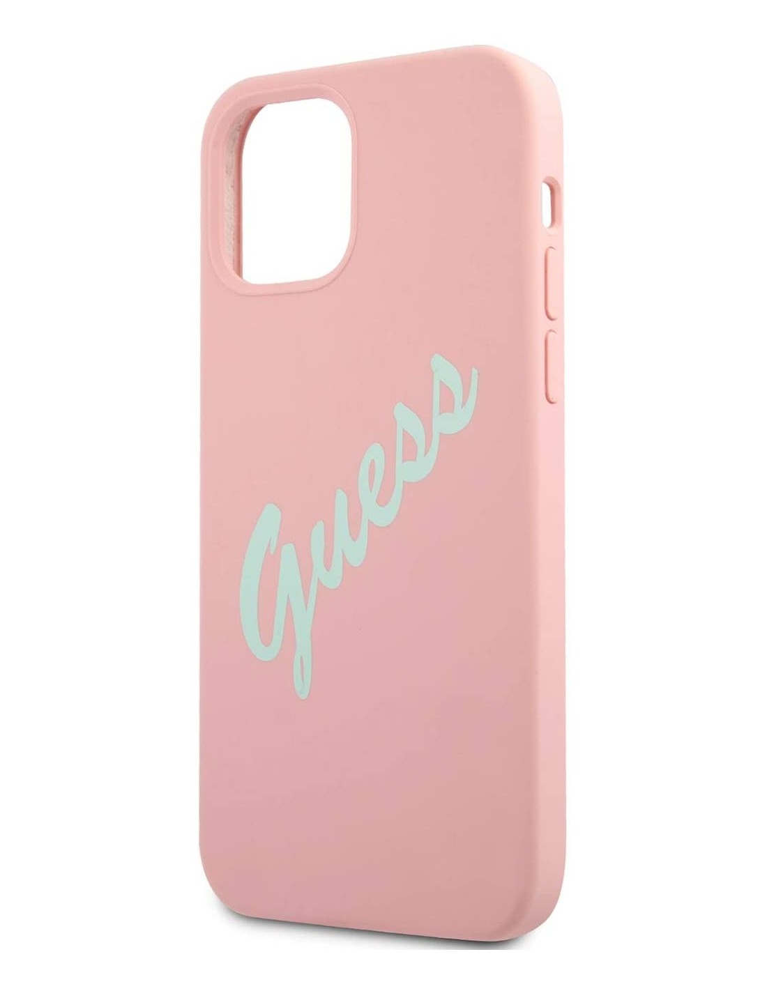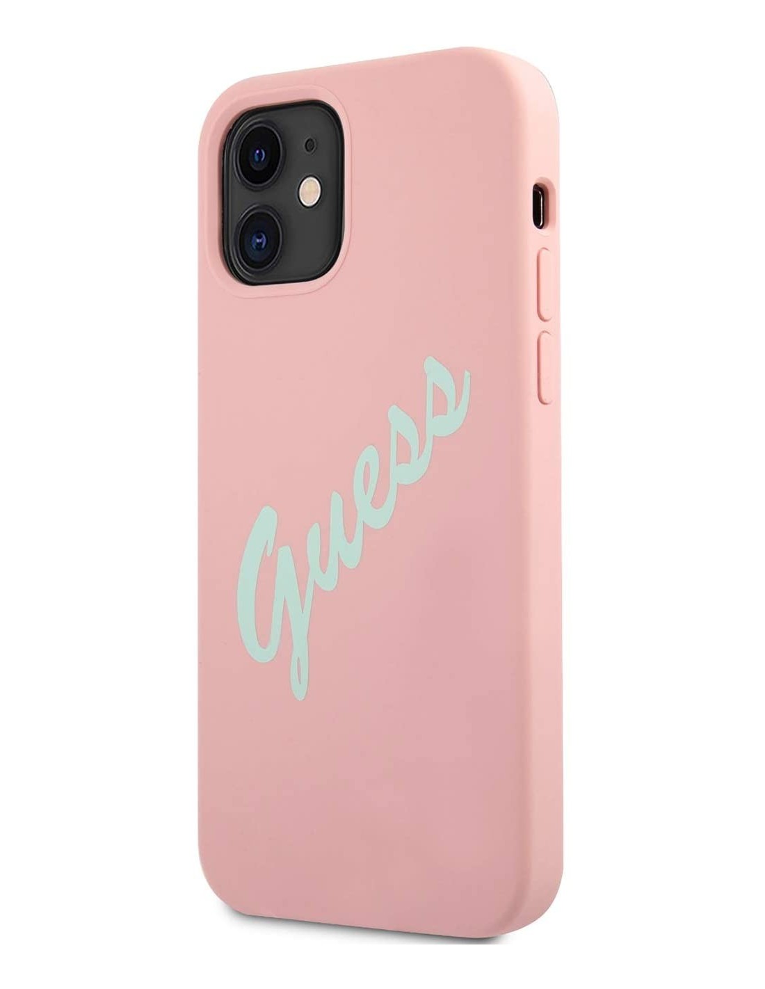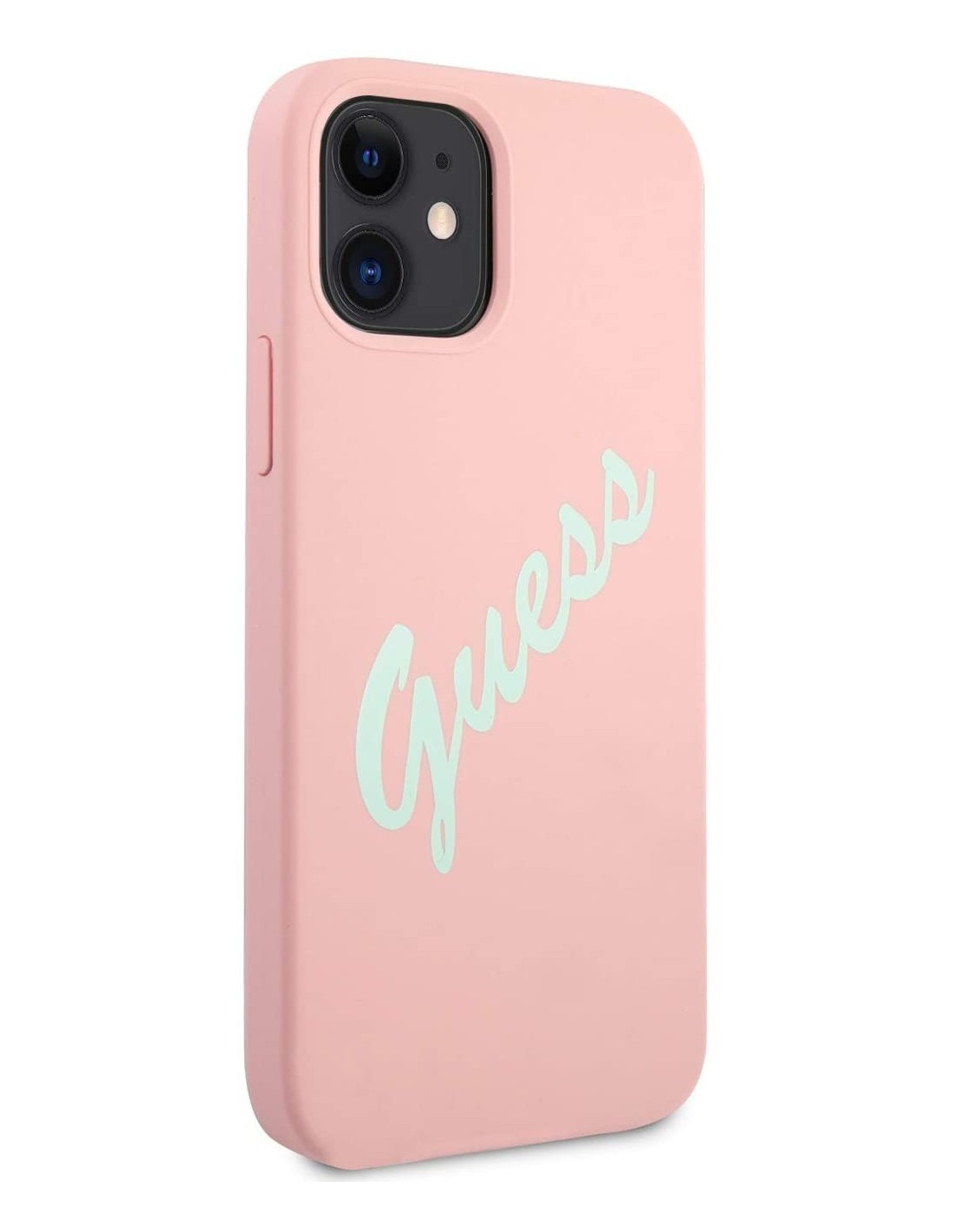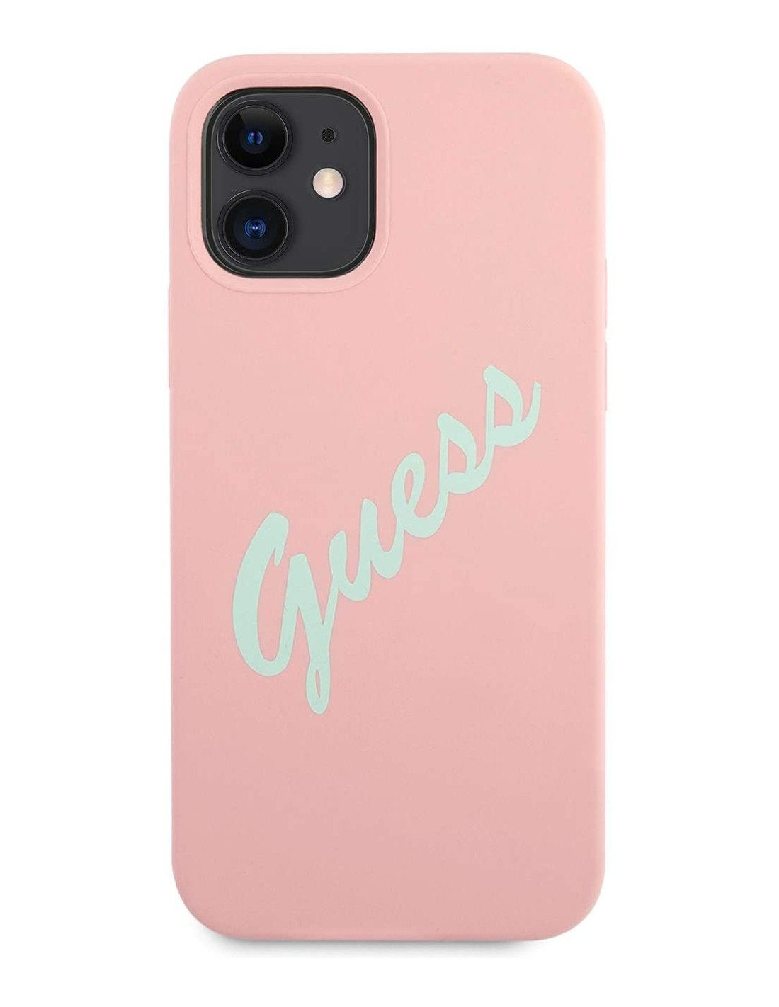 Funda Vintage de silicona de Guess para iPhone 12 mini en color rosa con letras en verde. Diseño y elegancia para proteger tu iPhone 12 mini de golpes y arañazos.
