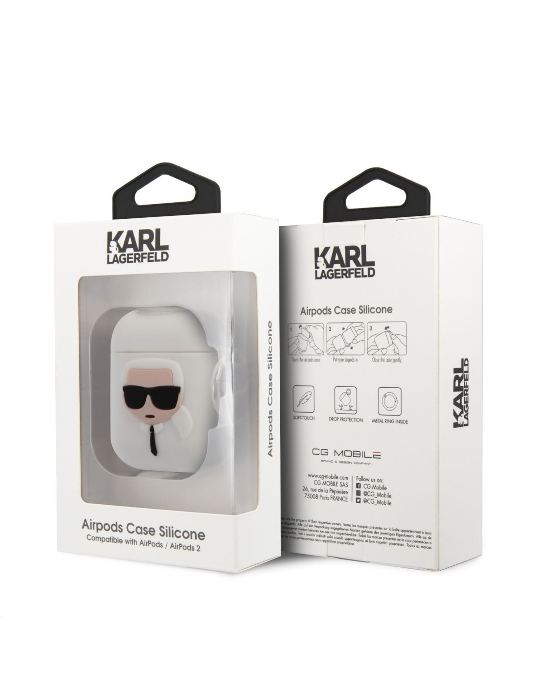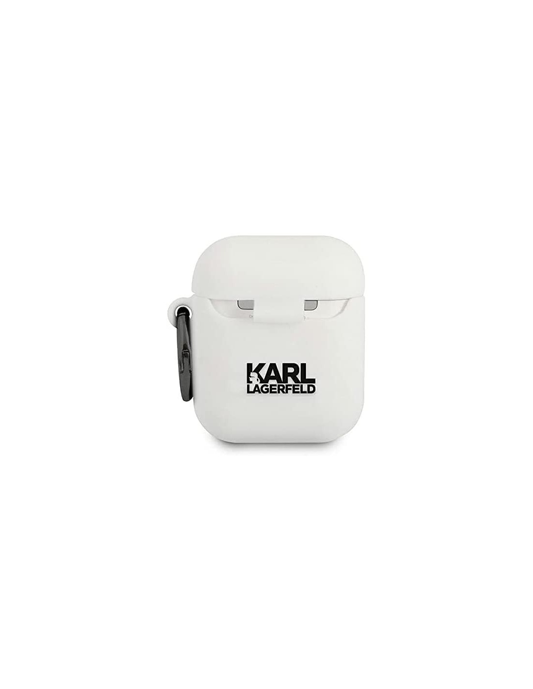Funda de silicona de Karl Lagerfeld modelo cara de Karl para Apple Airpods 1 | Airpods 2 en color blanco. Diseño y elegancia para proteger tus Airpods de golpes y suciedad.