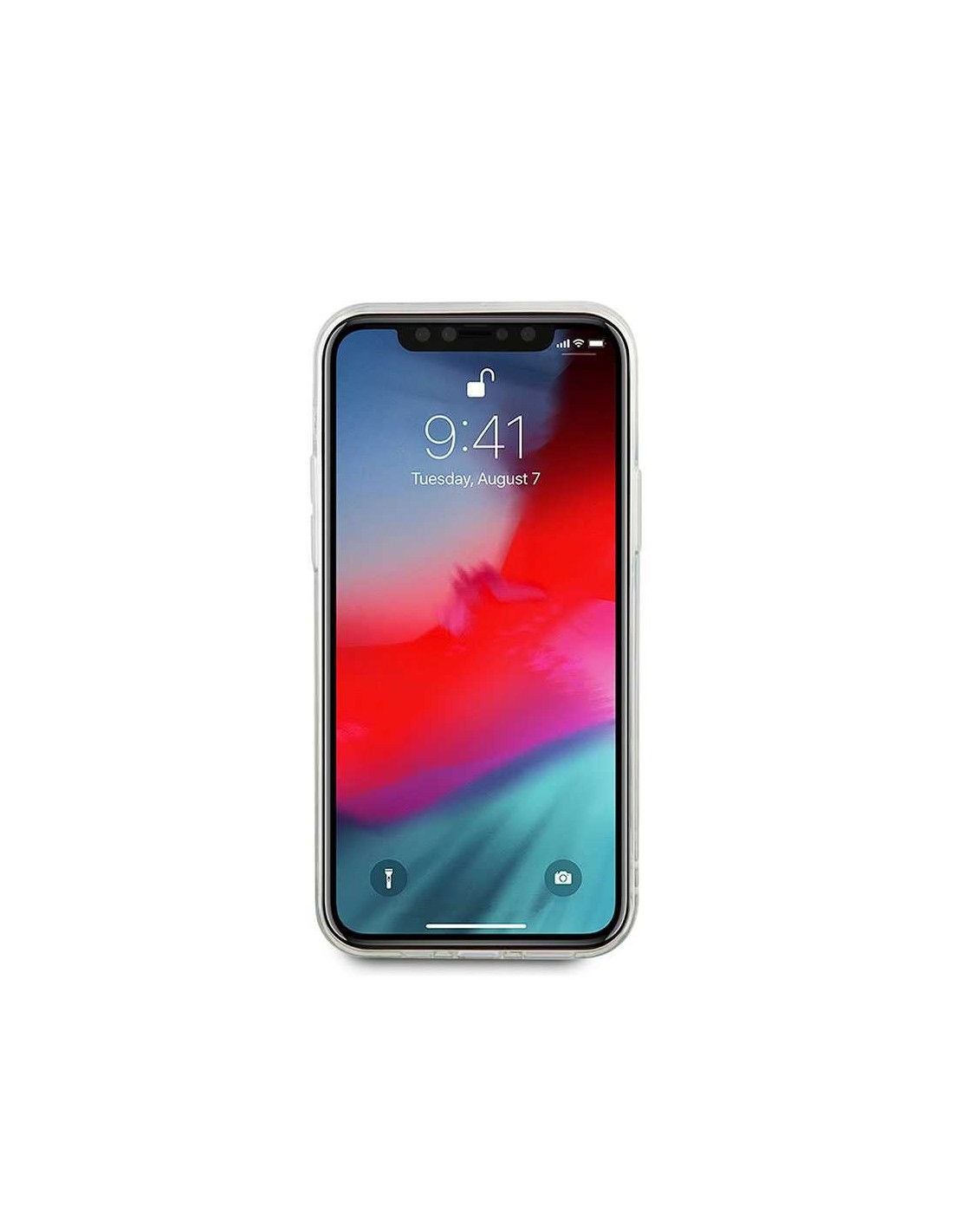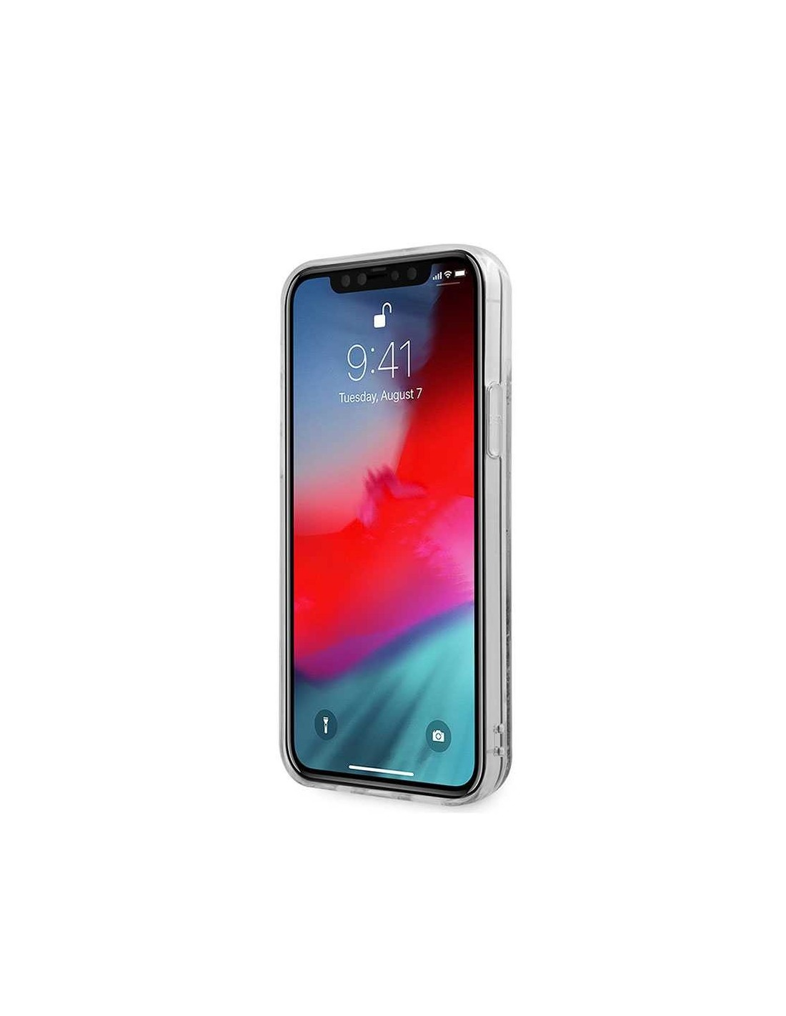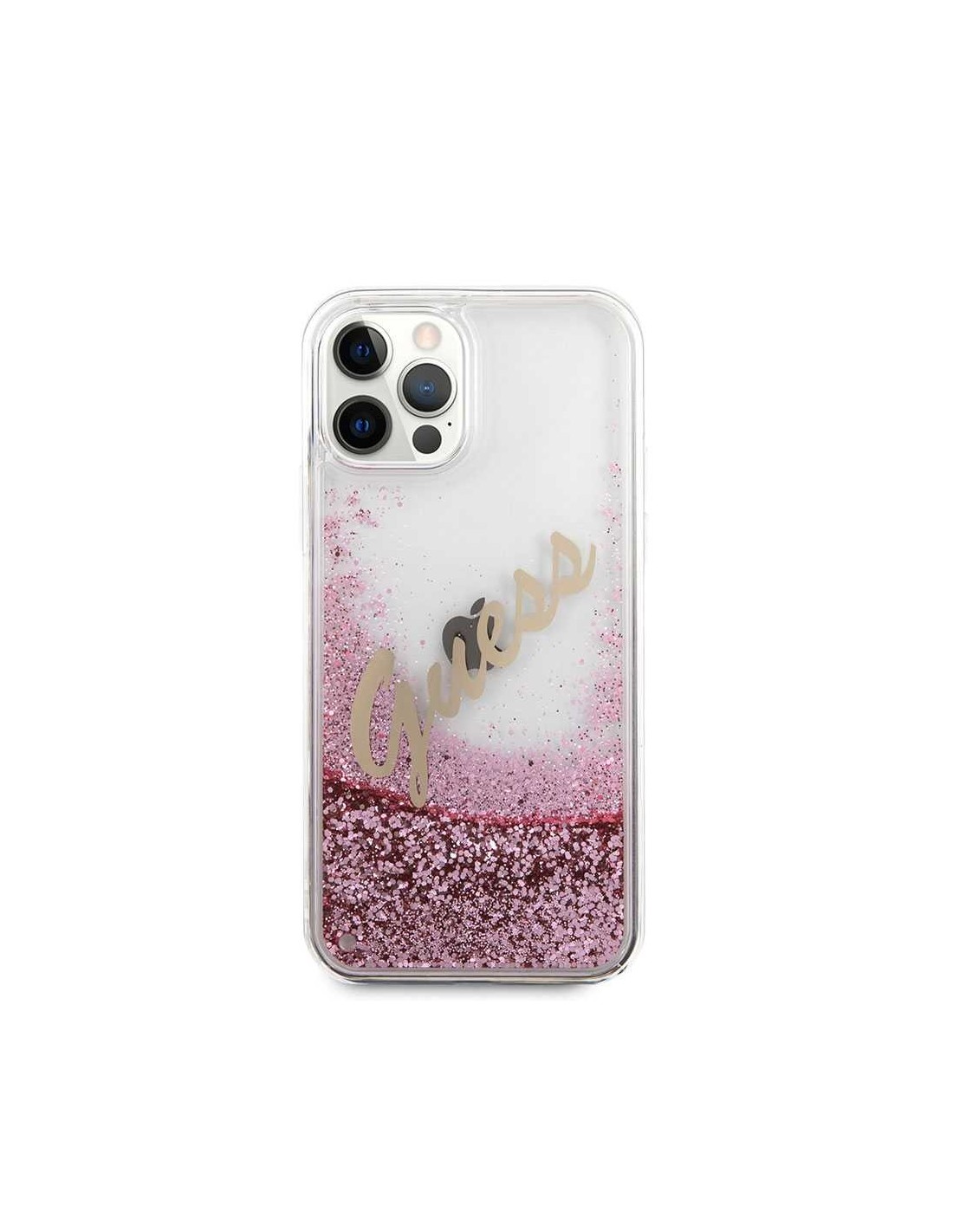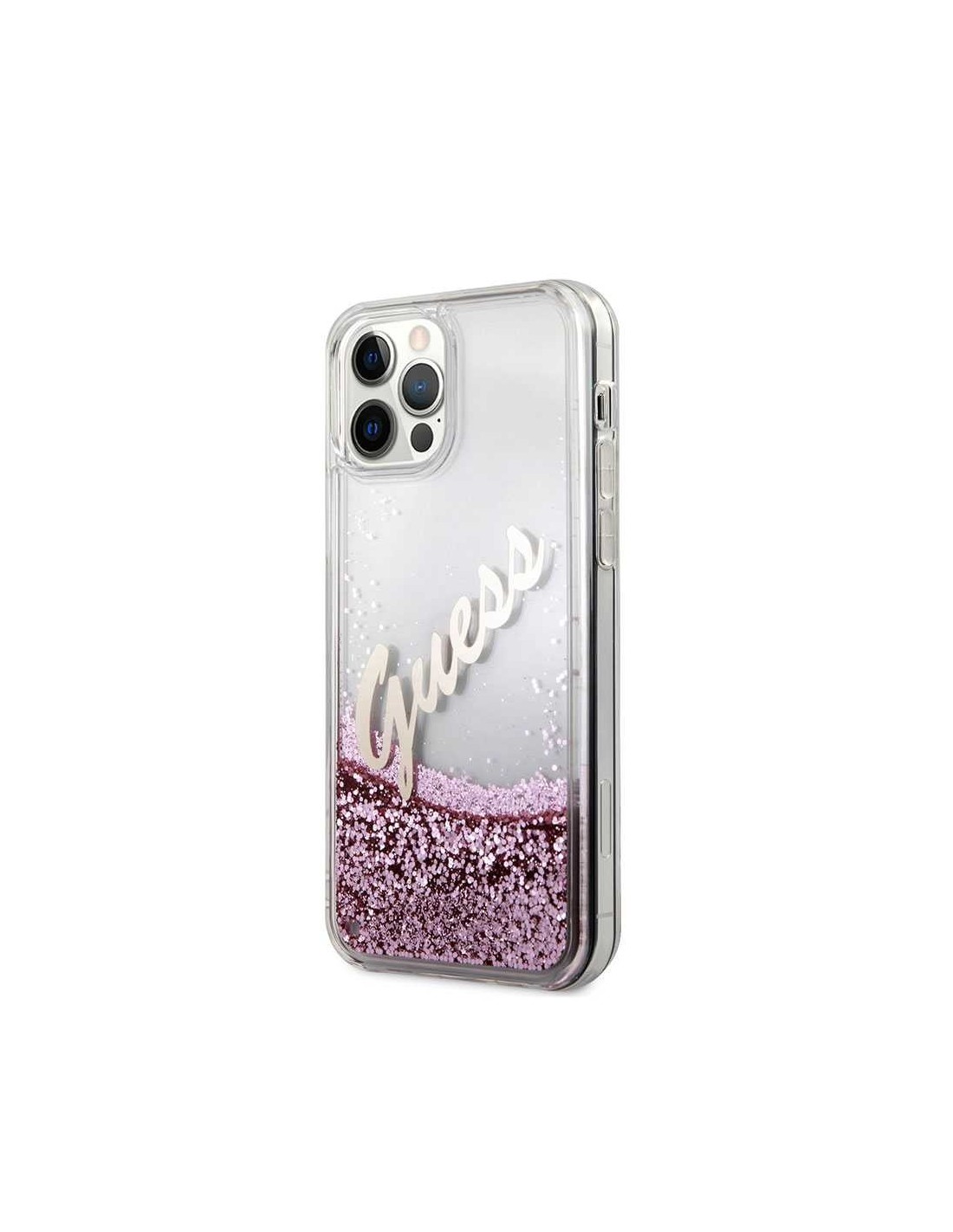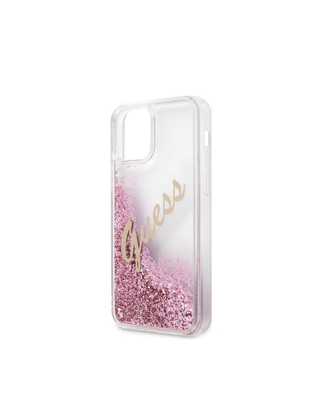 Funda Vintage de silicona de Guess con purpurina líquida para iPhone 12 pro Max en color rosa con letras en blanco. Diseño y elegancia para proteger tu iPhone 12 pro Max de golpes y arañazos.