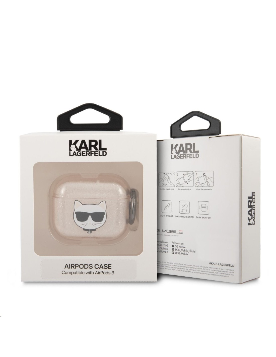 Funda de silicona de Karl Lagerfeld modelo cara de Choupette con brillantina para Apple Airpods 3 en color dorado. Diseño y elegancia para proteger tus Airpods de golpes y suciedad.