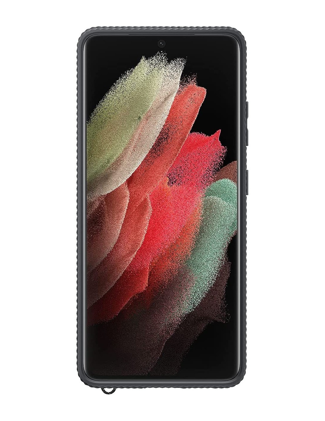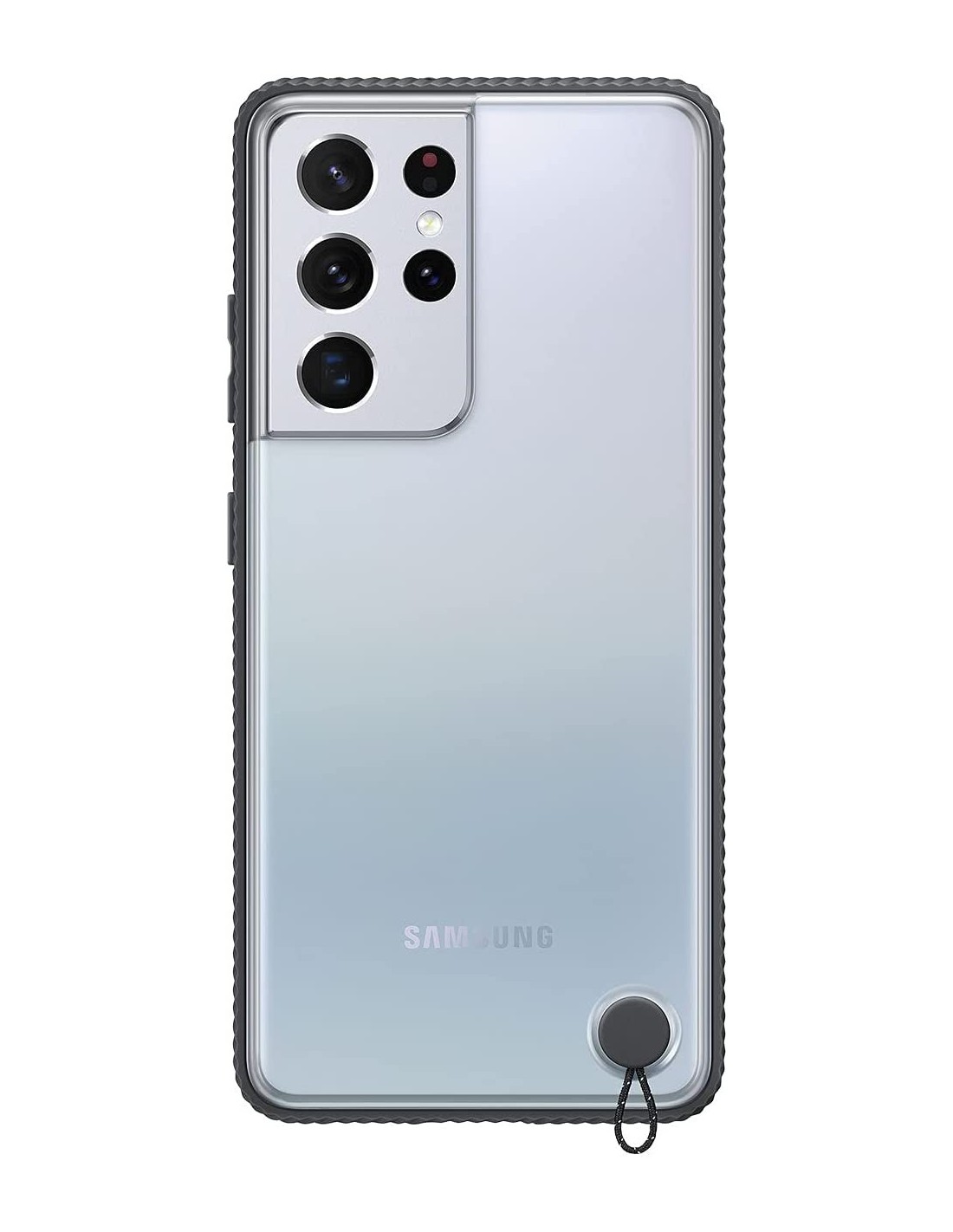 Protege tu Samsung Galaxy S21 Ultra de los arañazos del uso diario con esta funda de silicona transparente con los bordes en color negro.