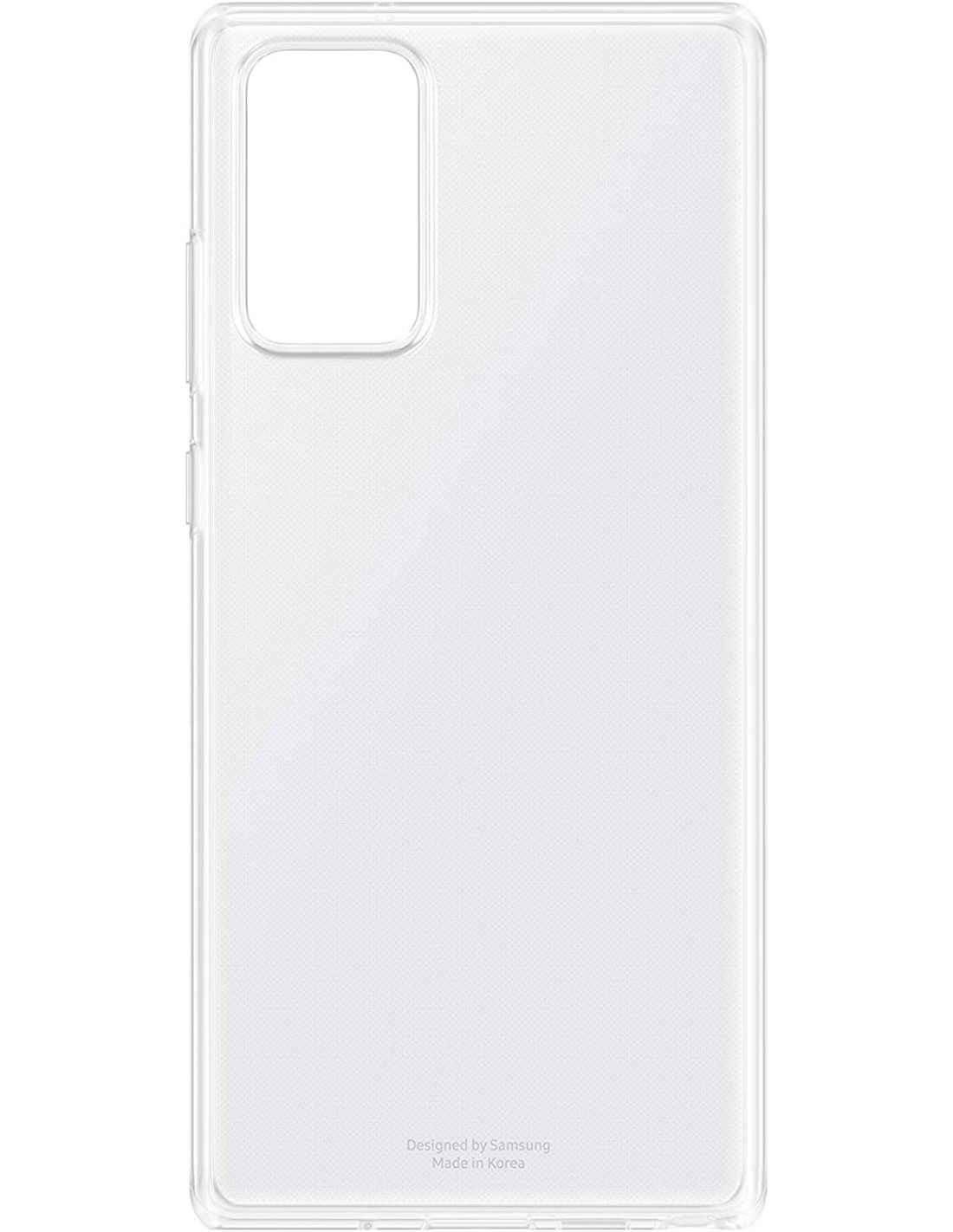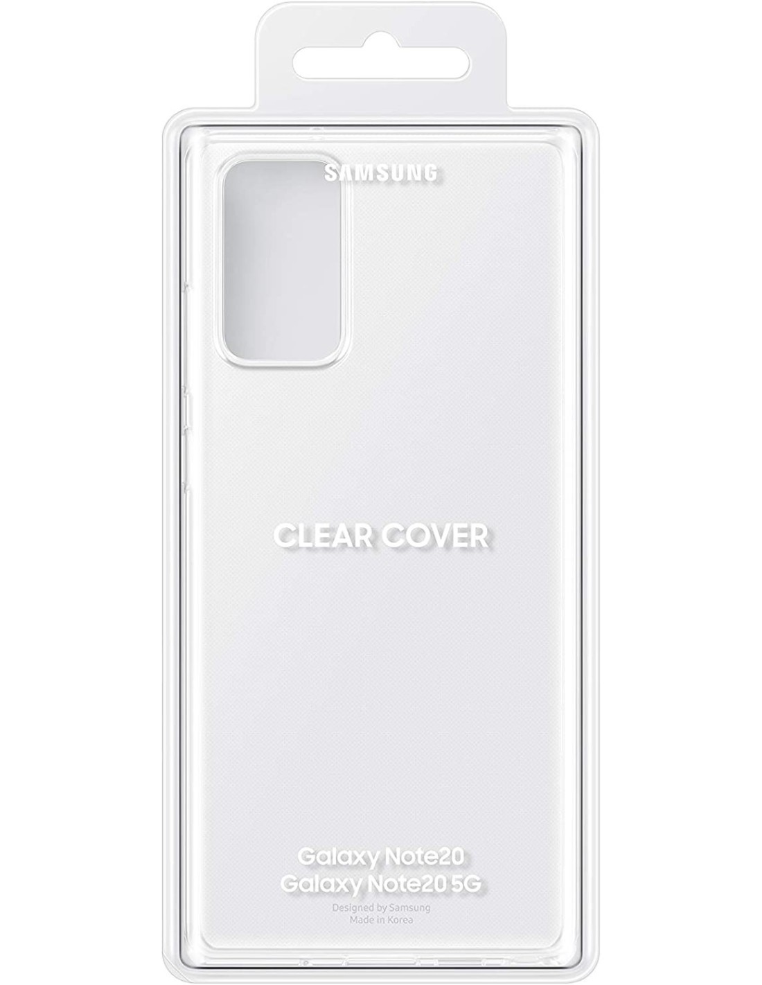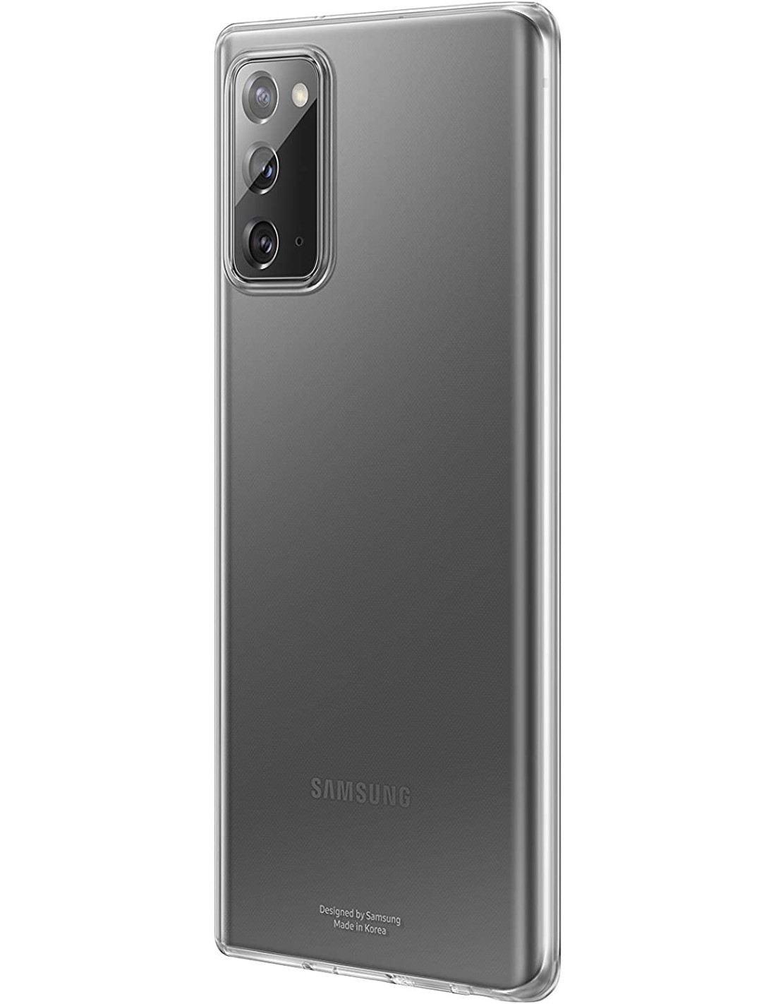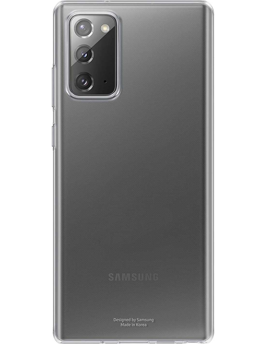 Funda transparente original para Samsung Galaxy Note 20. Agrega una capa de defensa a tu Galaxy Note 20 sin sacrificar su cómodo agarre. La cubierta transparente delgada protege de golpes y cabe fácilmente en la mano. La carcasa Clear Cover cuenta con recortes para la cámara y los puertos y no impide el uso de ninguna función.